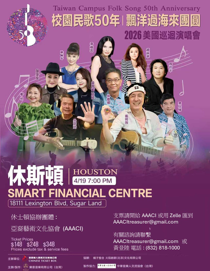 有10位左右當年校園民歌的演唱者,今年4月19日要來休士頓,以主題「校園民歌50年,飄洋過海來團圓」 ,晚間7點於Smart Financial Centre登台演出,和華人朋友一起重溫年輕時代的回憶。