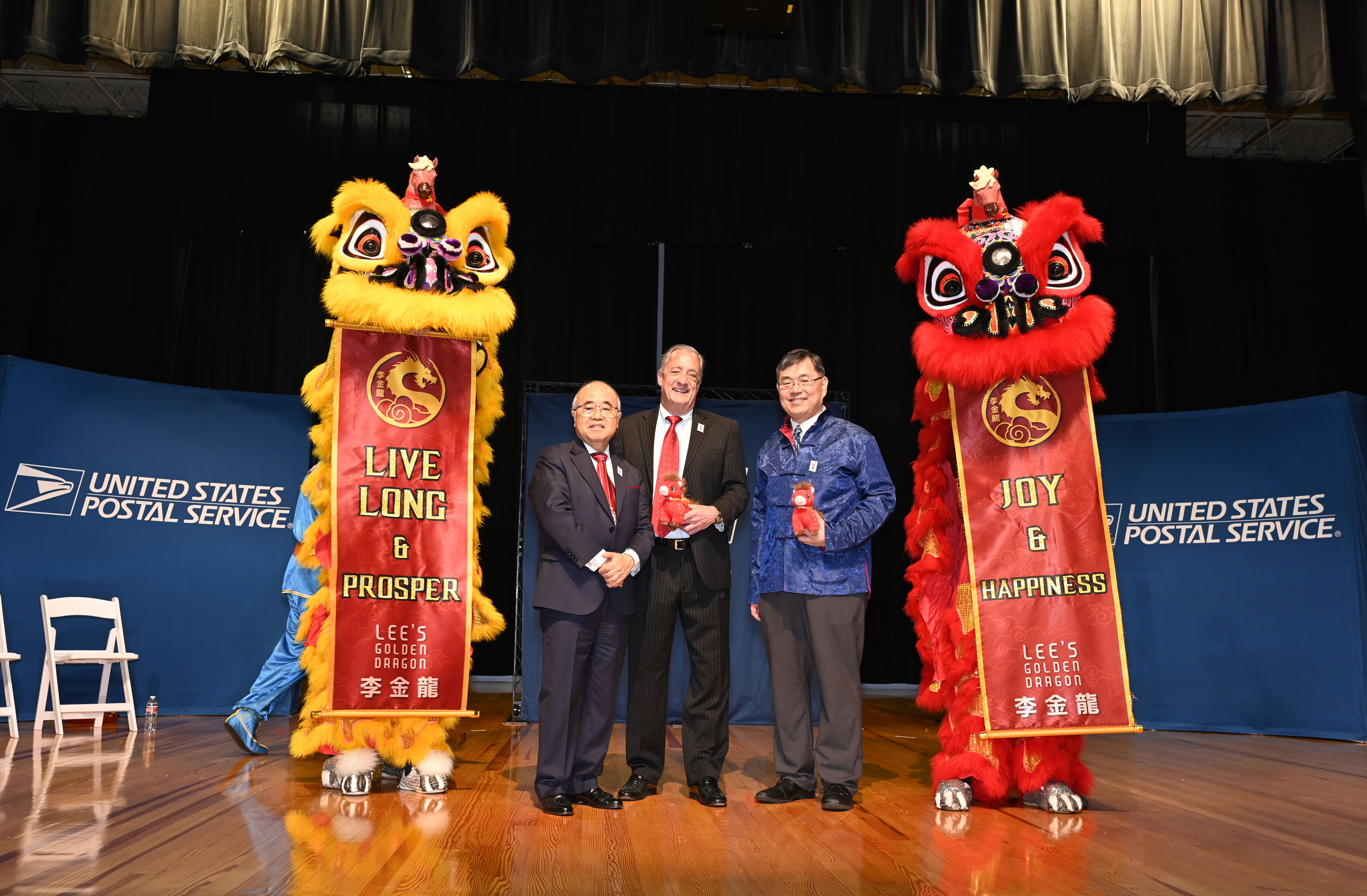 2026年美國郵政總局馬年郵票於中華文化服務中心舉行揭幕儀式,局長David Steiner(中)與文化中心執行長Gary Poon(右)、西南區管理委員會李雄主席(左)合影。