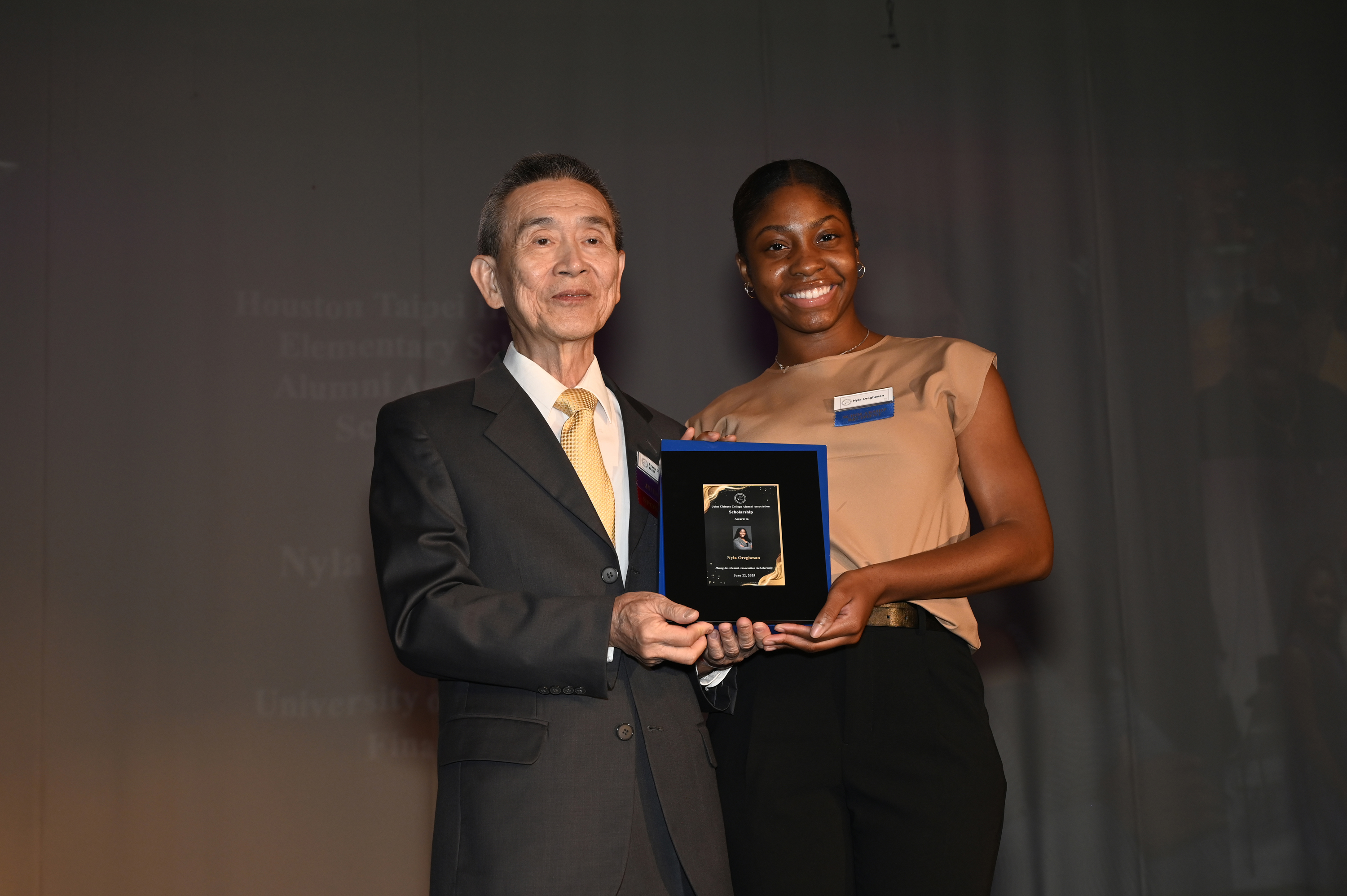 2025年6月美南大專院校聯合校友會獎學金召集人鄭大展(左)頒贈學生獎學金。
