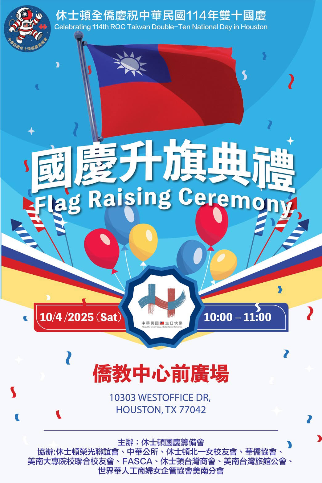 每年的國慶活動,彷彿就是休士頓地區的一項廟會活動,大小活動都能吸引人潮參與慶祝,而國慶升旗典禮是系列活動的高潮之一,不但參加的社團踴躍,榮譽職及僑胞也積極參與,都希望在當天會見好友,相互問候。今年國慶升旗為10月4ㄖ上午,如果當天好心情的話,那就請到僑教中心,一起感受現場熱鬧開心的氣氛。