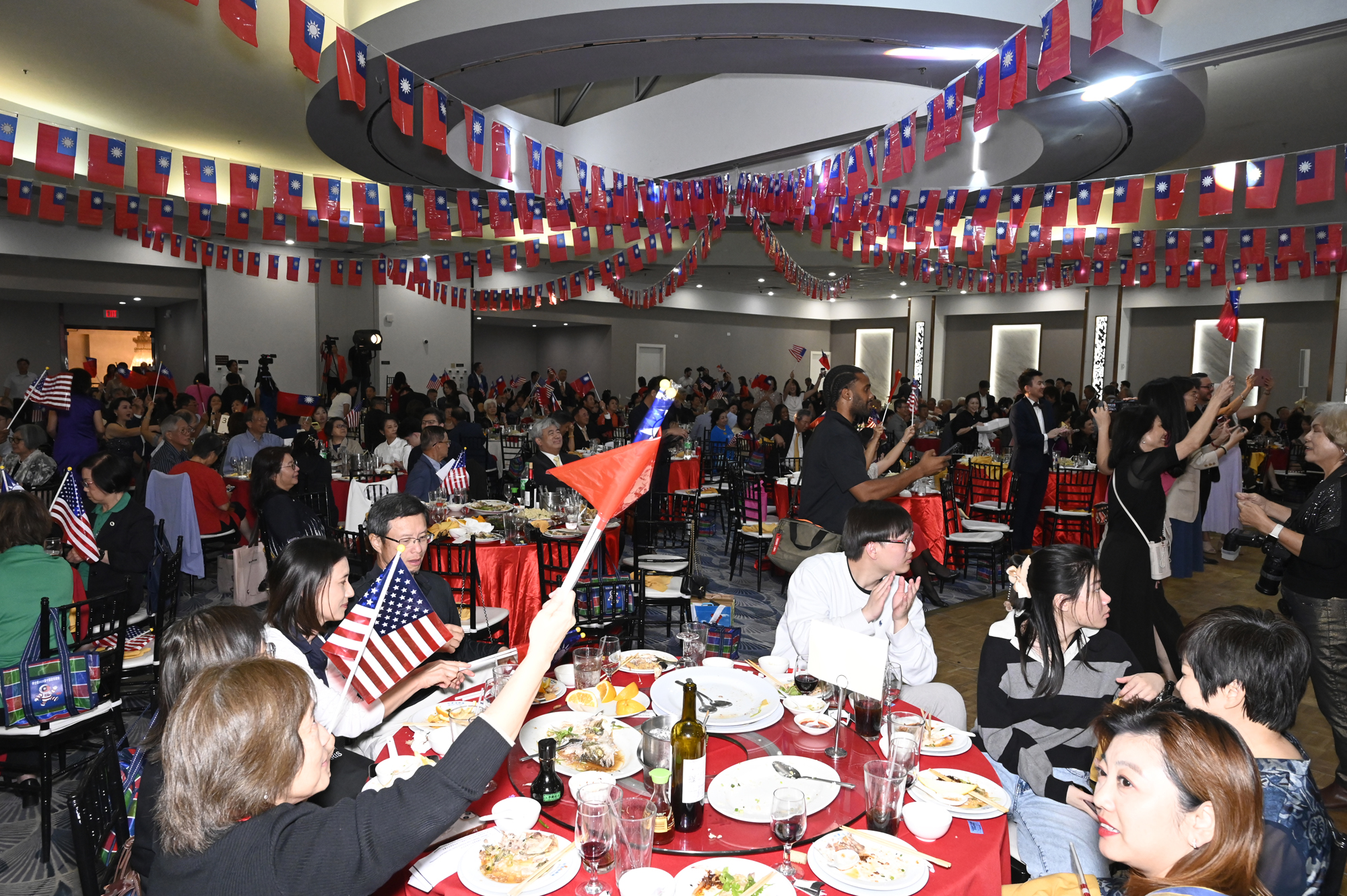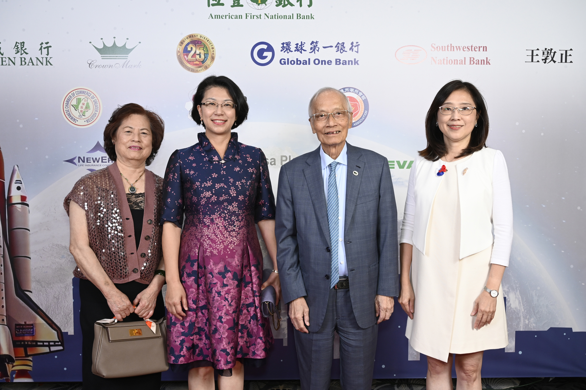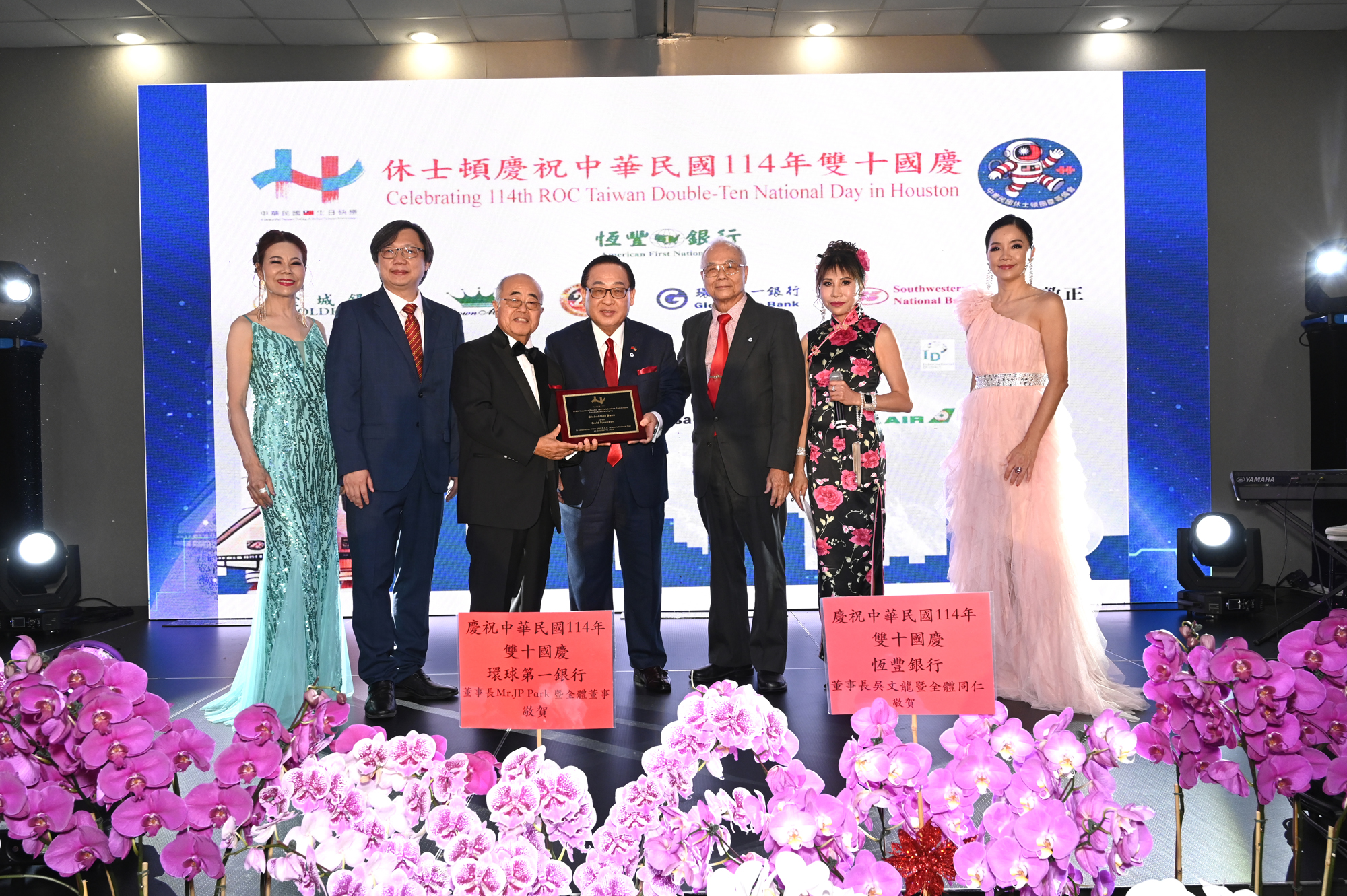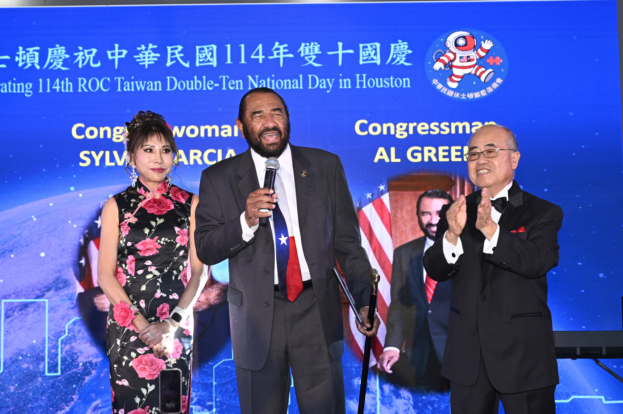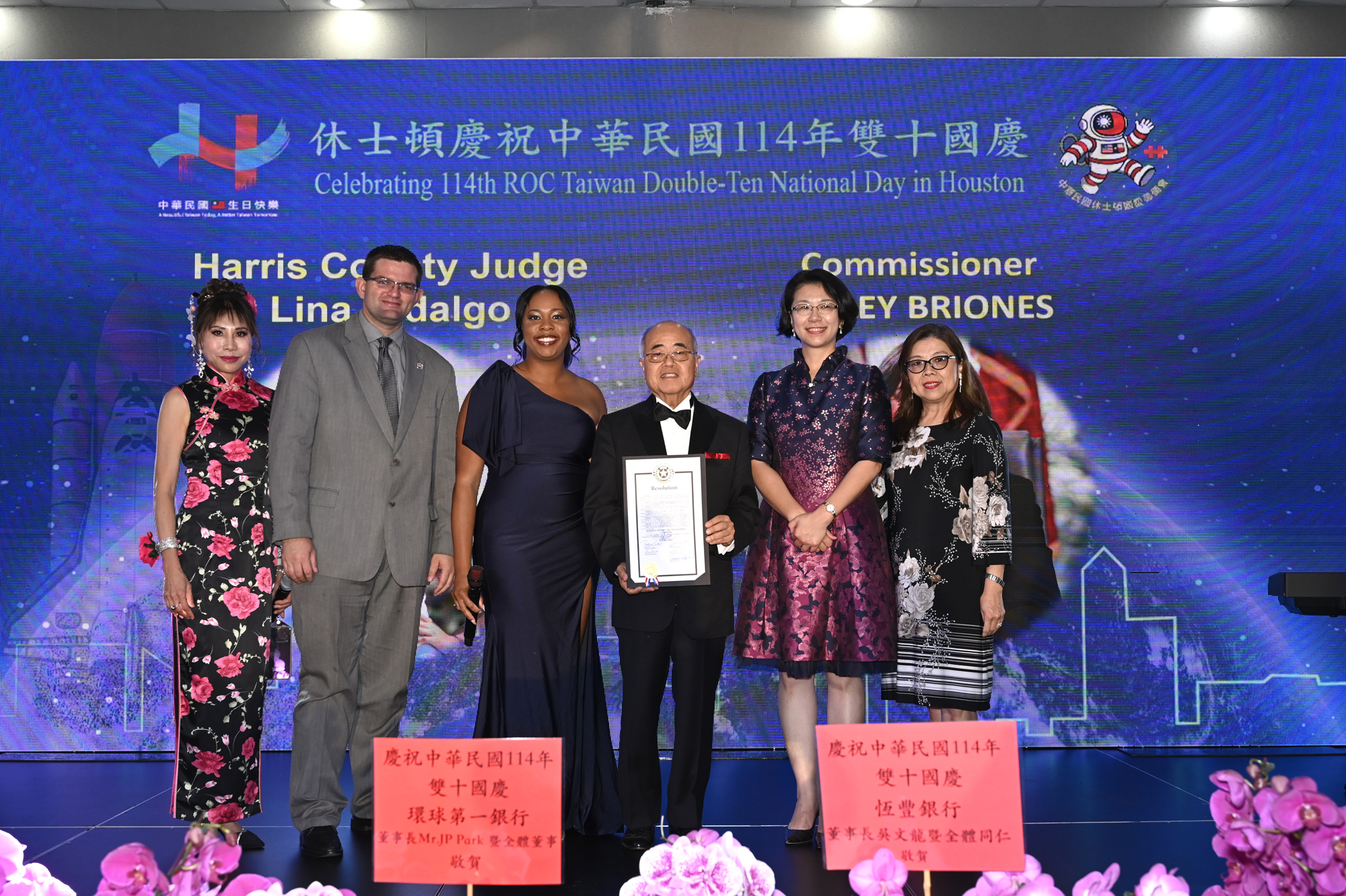 2025年國慶國慶晚宴上,蕭伊芳處長(左一)、林富桂律師(右一)陪同國慶籌備會李雄主任委員(左二)接受國會議員Al Green(右二)致贈賀狀。