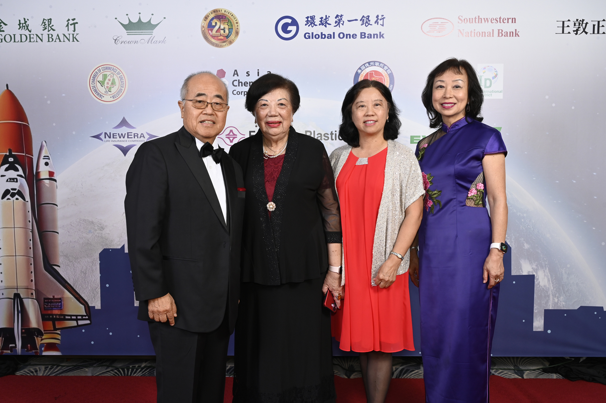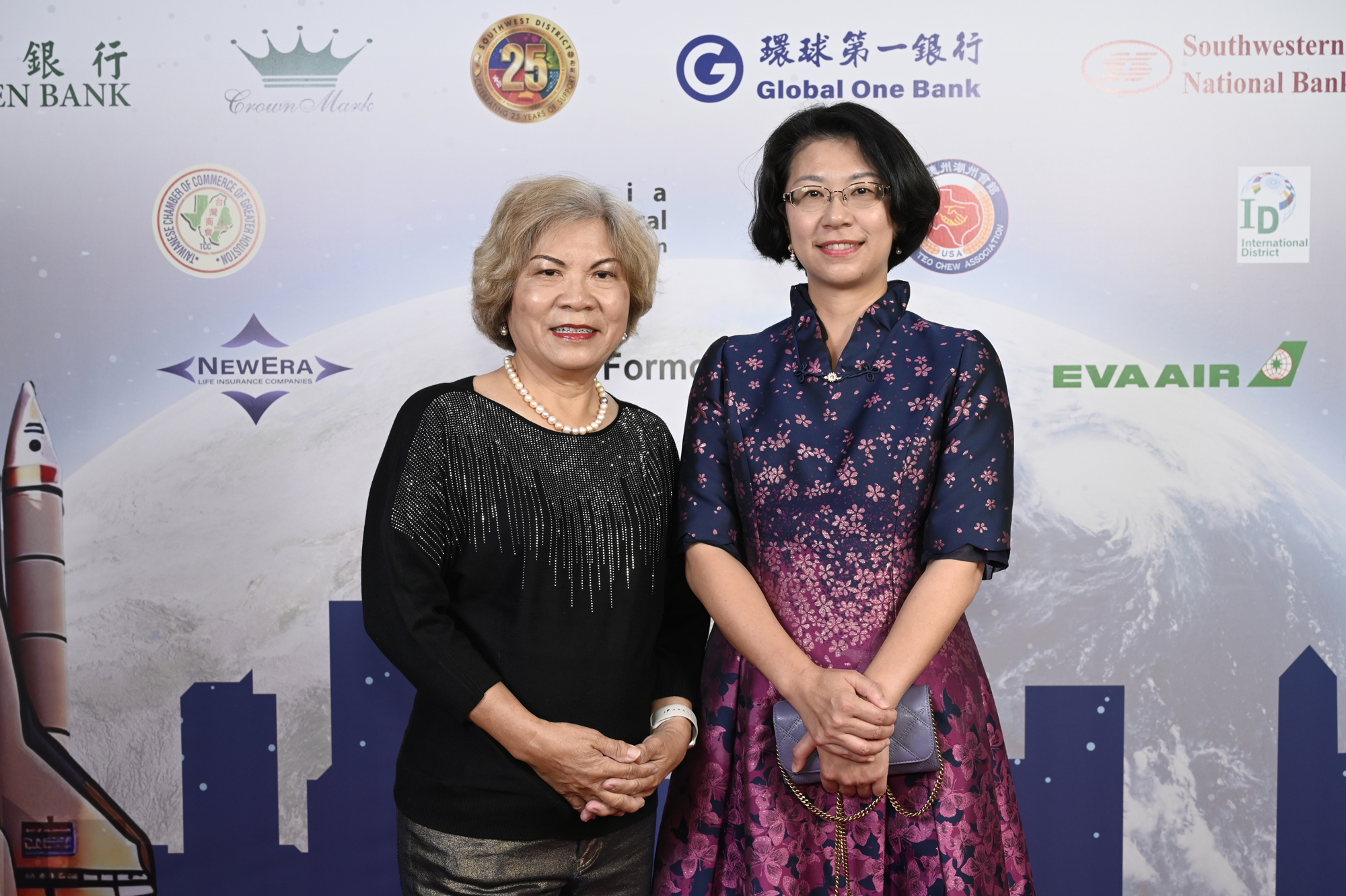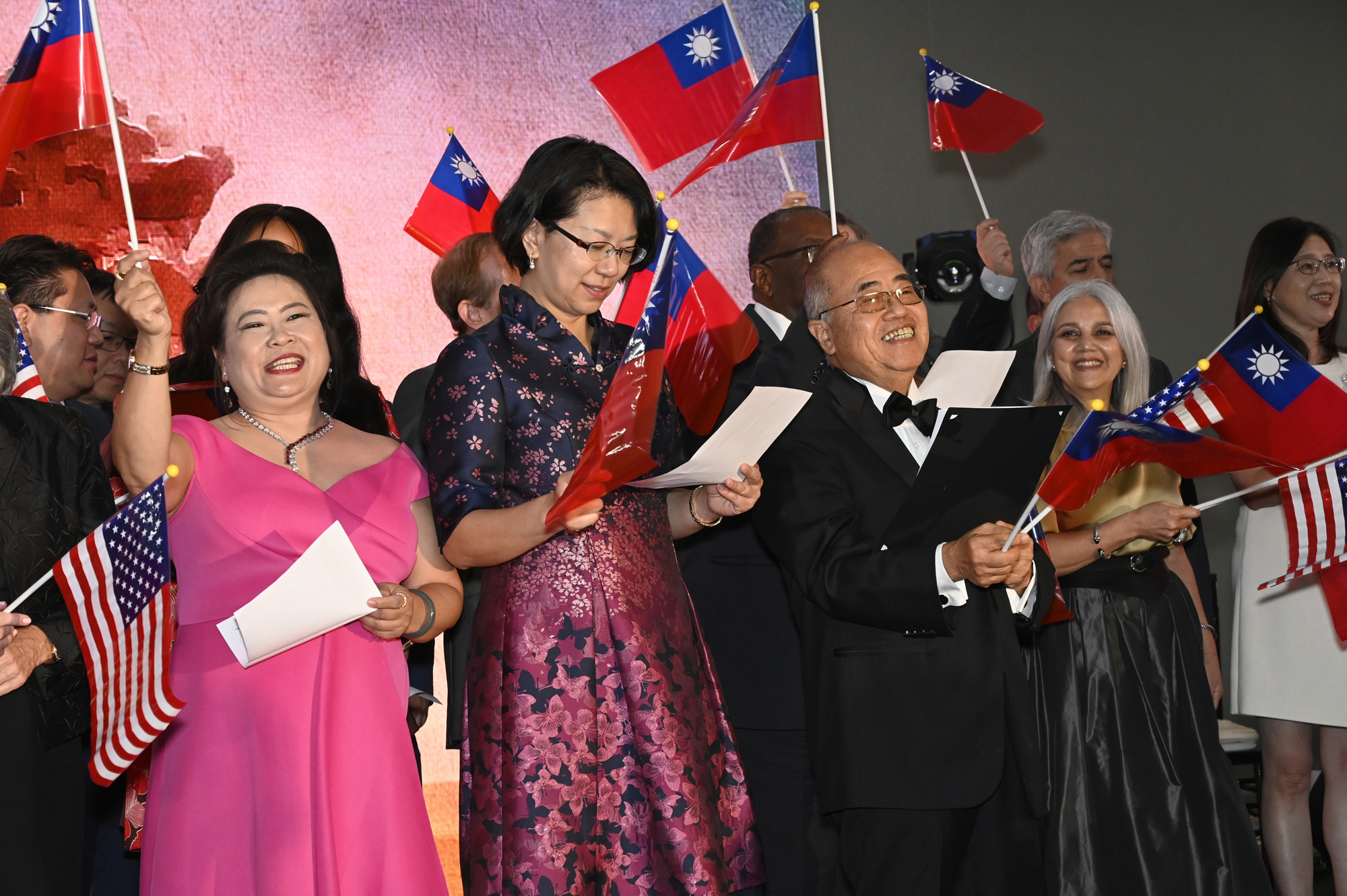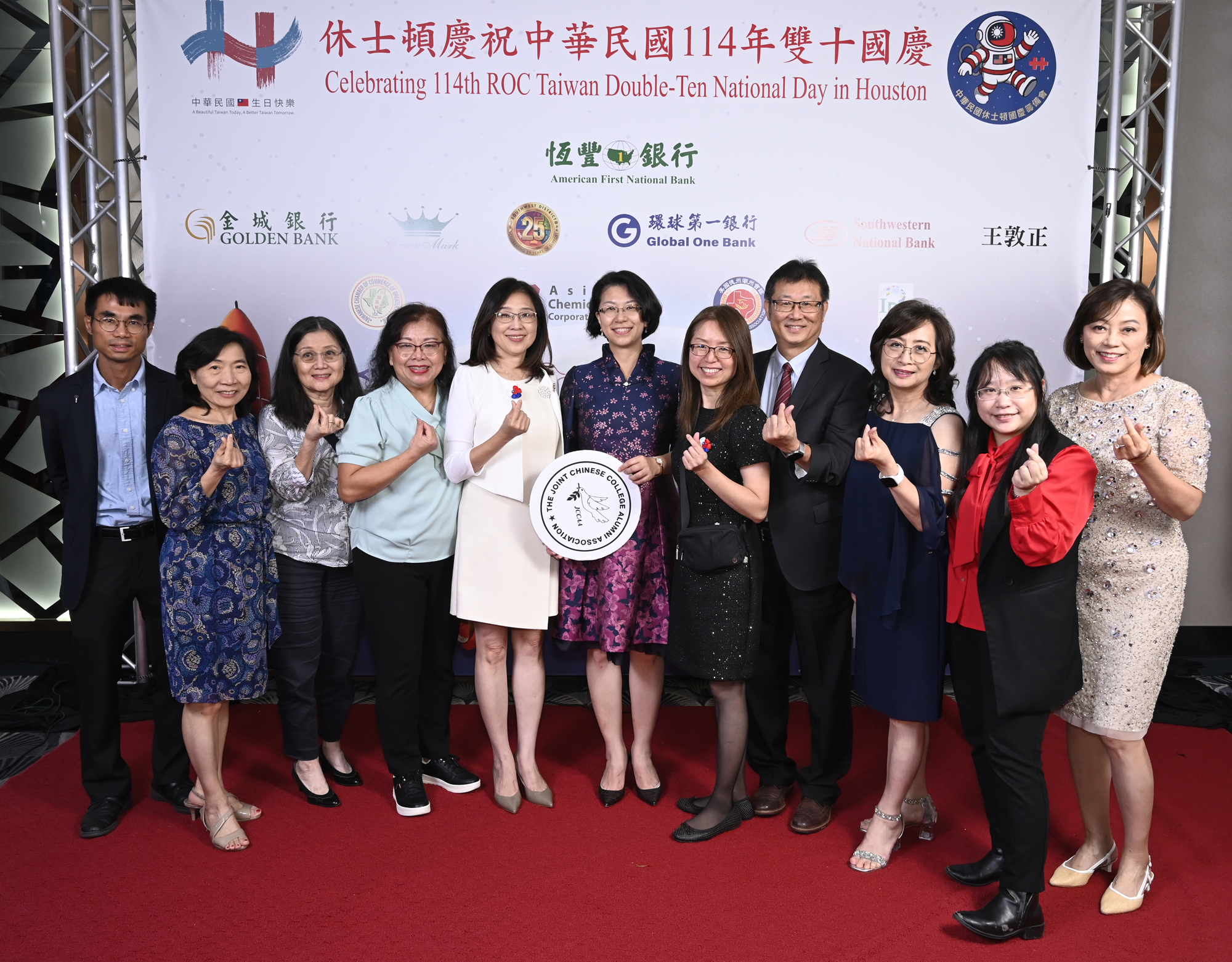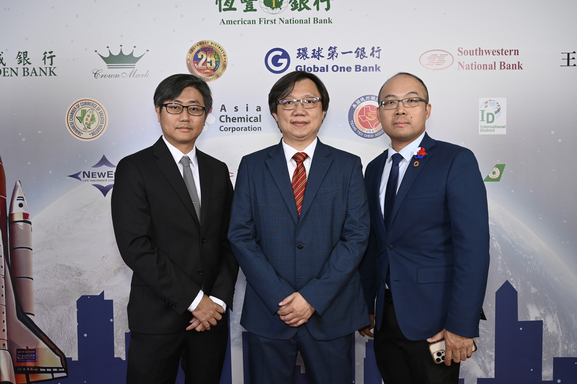 2025年國慶國慶晚宴上,蕭伊芳處長(左一)、林富桂律師(右一)陪同國慶籌備會李雄主任委員(左二)接受國會議員Al Green(右二)致贈賀狀。
