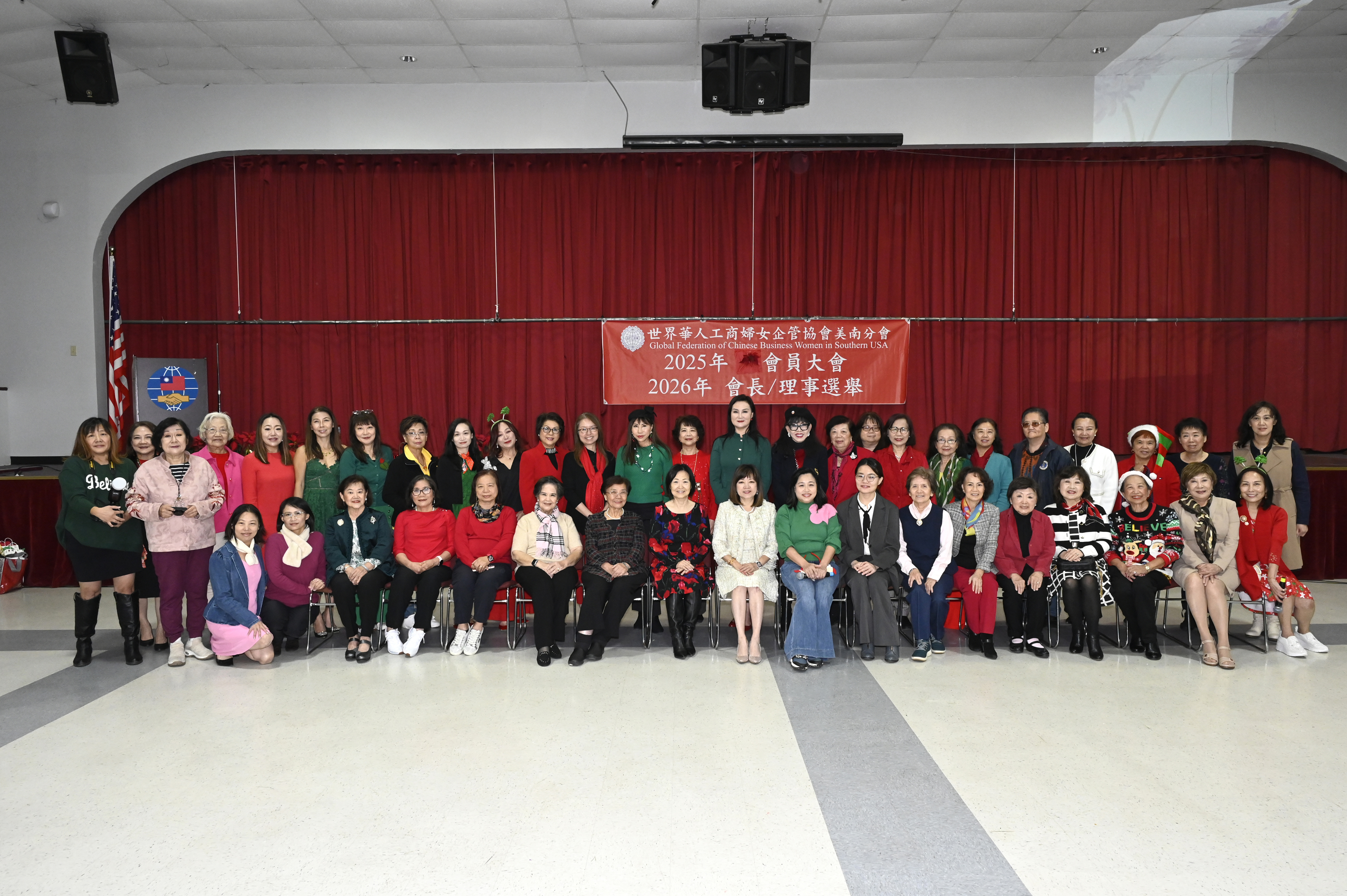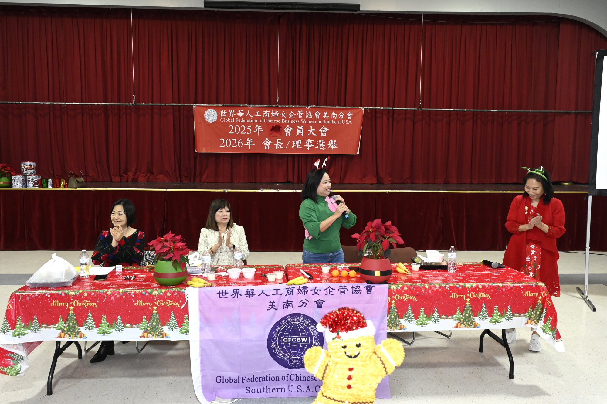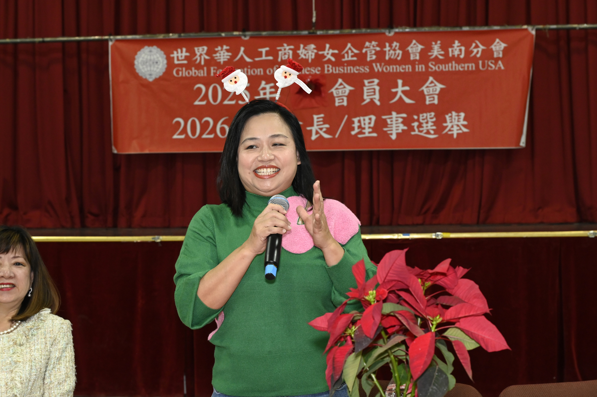 世界華人工商婦女企管協會美南分會,這場年終餐會上,選出了2026年會長及新理事團隊,而裴俊莉會長也將在當天活動後,將為過去一年的所有活動畫下句點,順利卸任。會長正式交接儀式,將安排在2026年的第一季舉行,接任的孫玉玟會長,將於1月1日起開始安排活動會務。