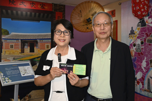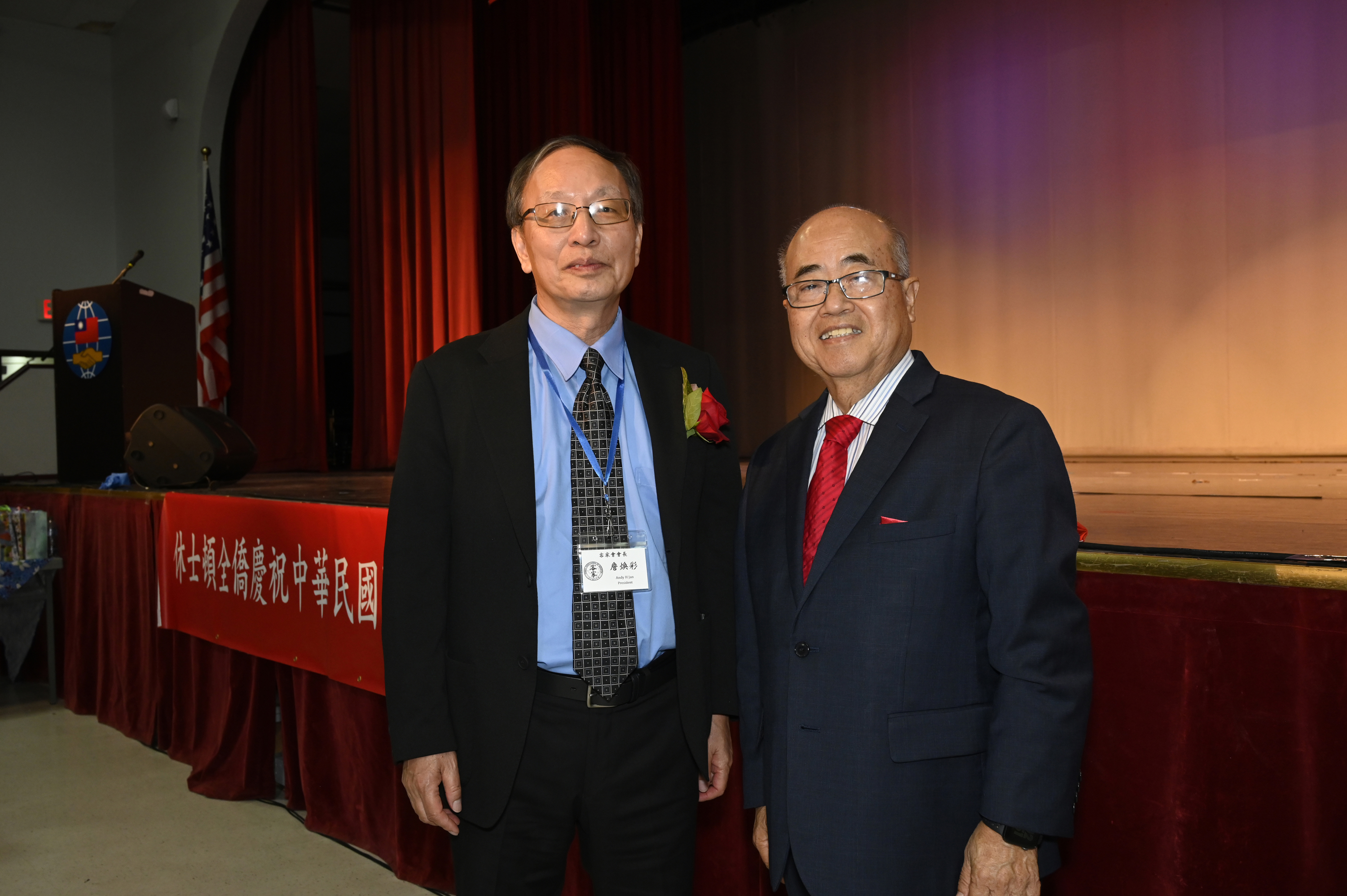 休士頓客家會詹煥彩會長(左)與國慶籌備會主任委員李雄(右),於鄭榮興客家採茶劇團休士頓演出結束後合影。