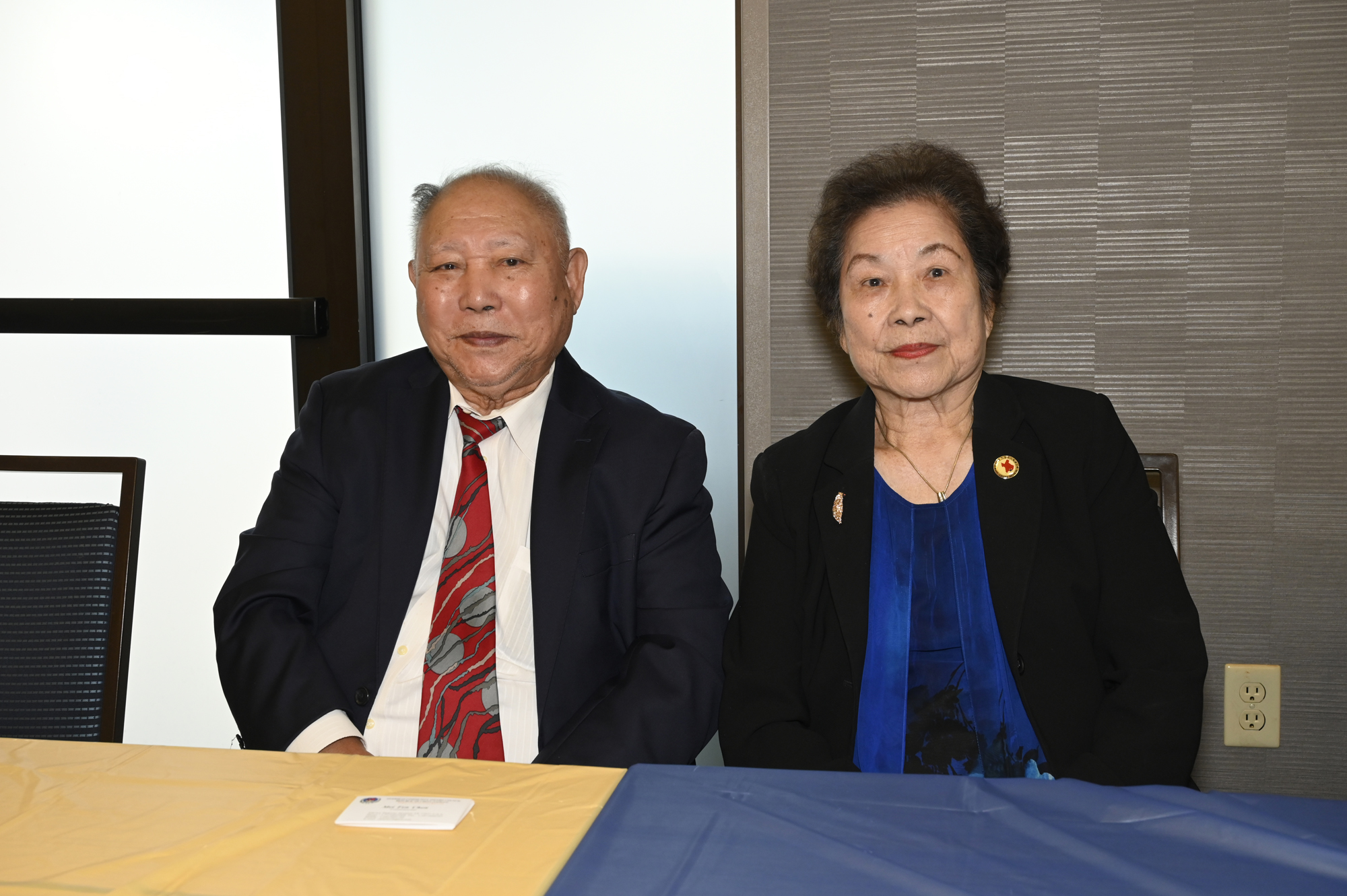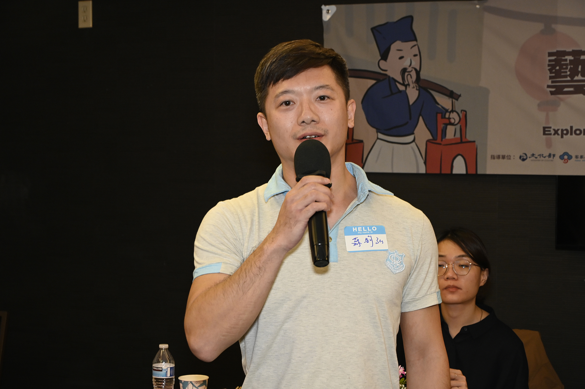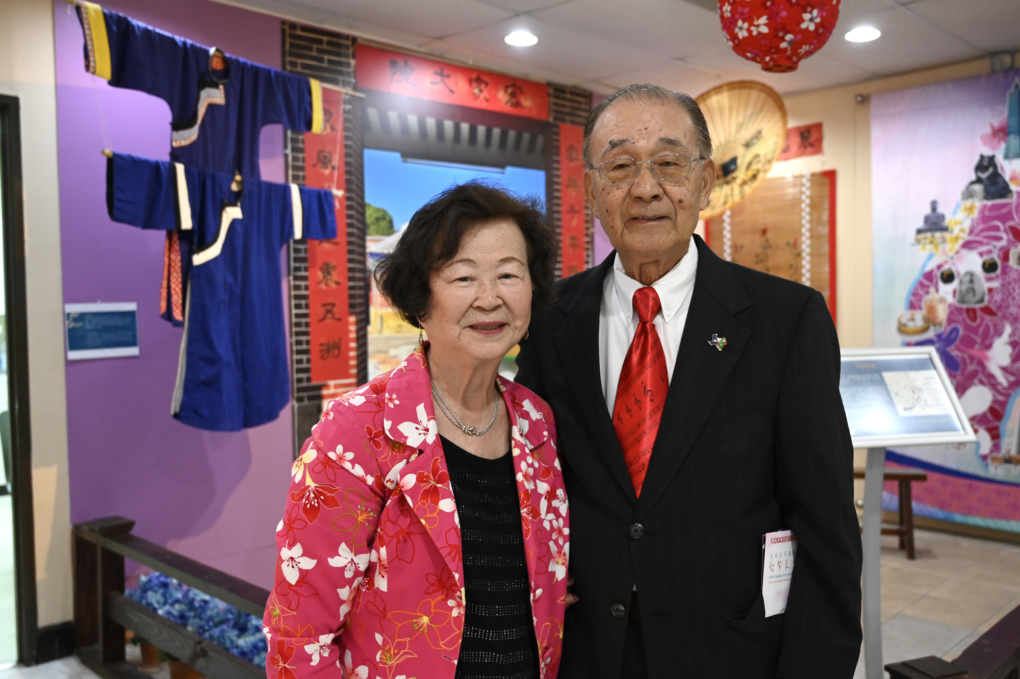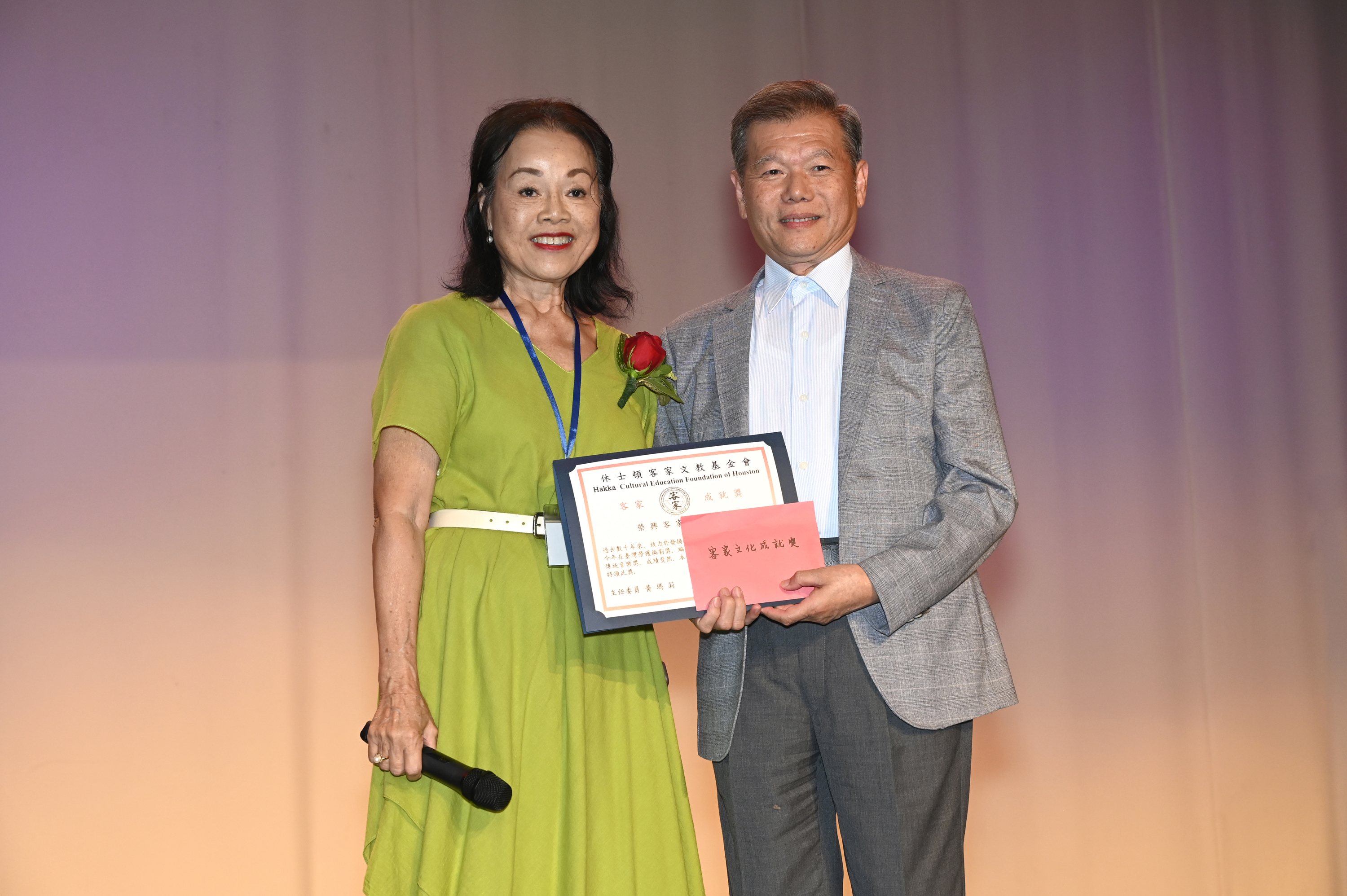 休士頓客家文教基金會黃瑪莉主任委員(左)接受藝術總監鄭榮興(右)贈壯致意。