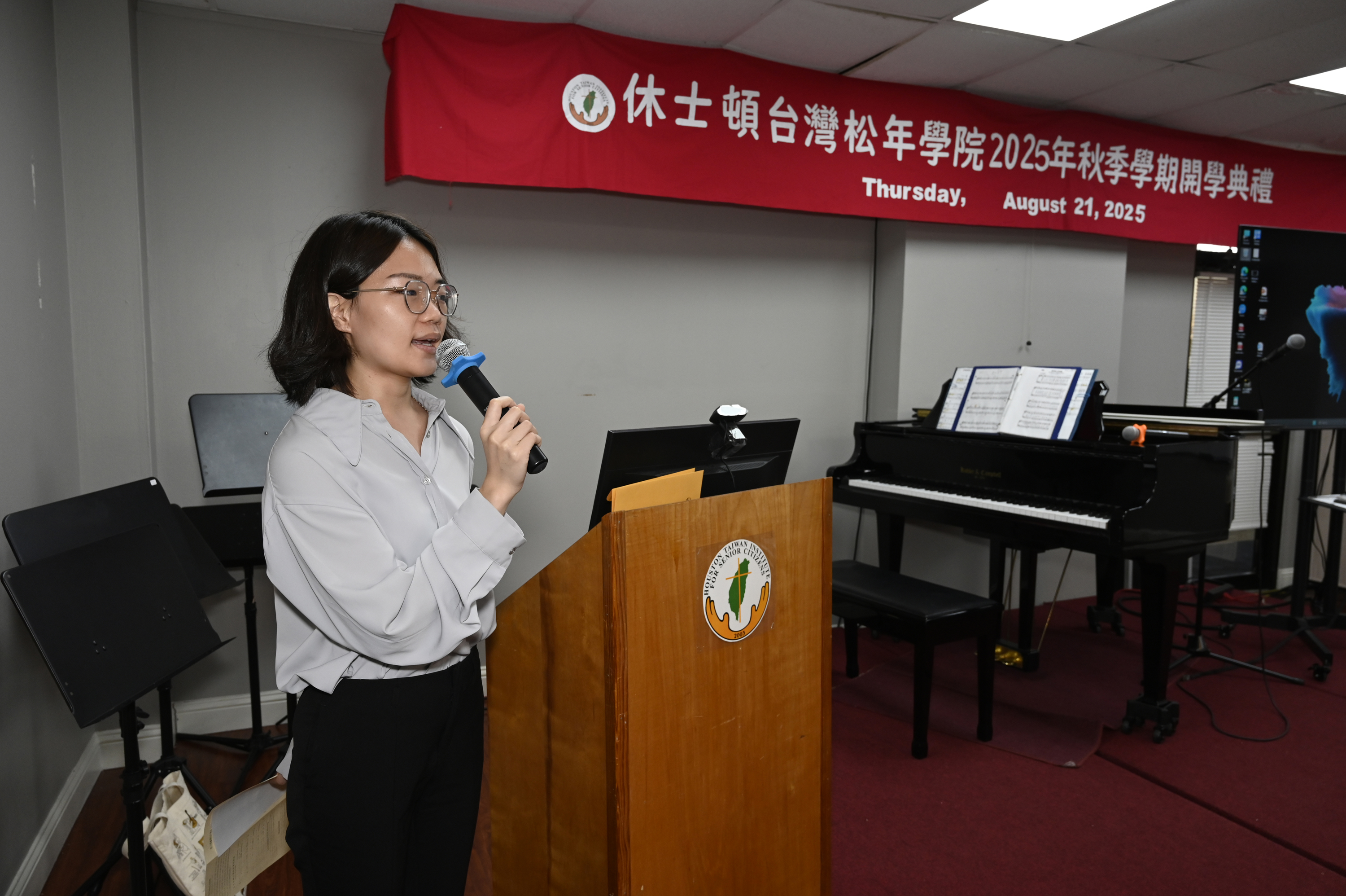 休士頓僑教中心副主任房亭妤在松年學院開學典禮上致詞。(本台檔案照片)