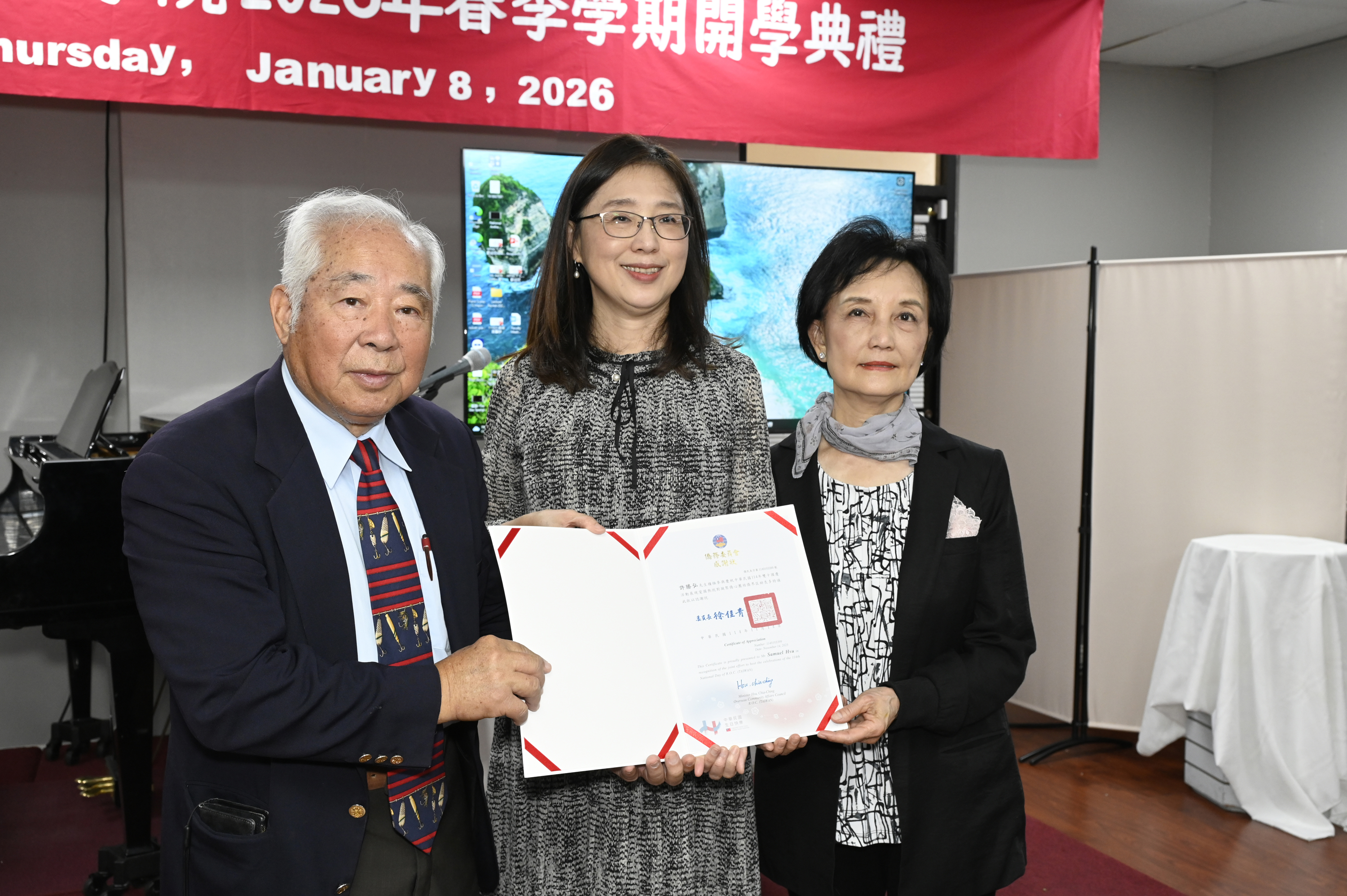 許勝弘院長(左)與張淑貞董事(右)在2026年春季開學典禮上接受王盈蓉主任(中)代頒徐佳青委員長表揚狀。(本台檔案照片)