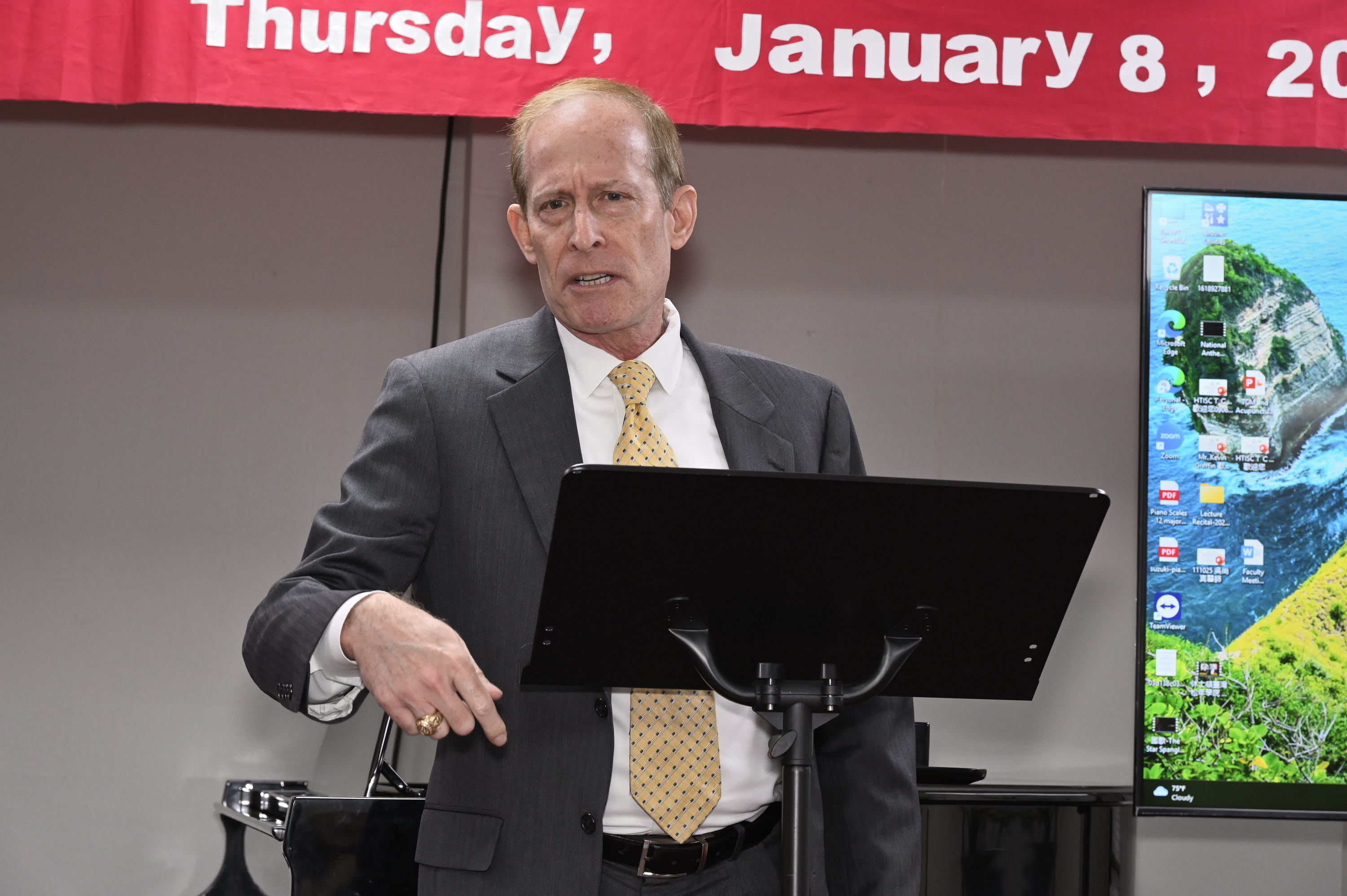 休台姐妹會Greg Meyers會長在休士頓松年學院2026春季開學典禮上致詞。(本台檔案照片)