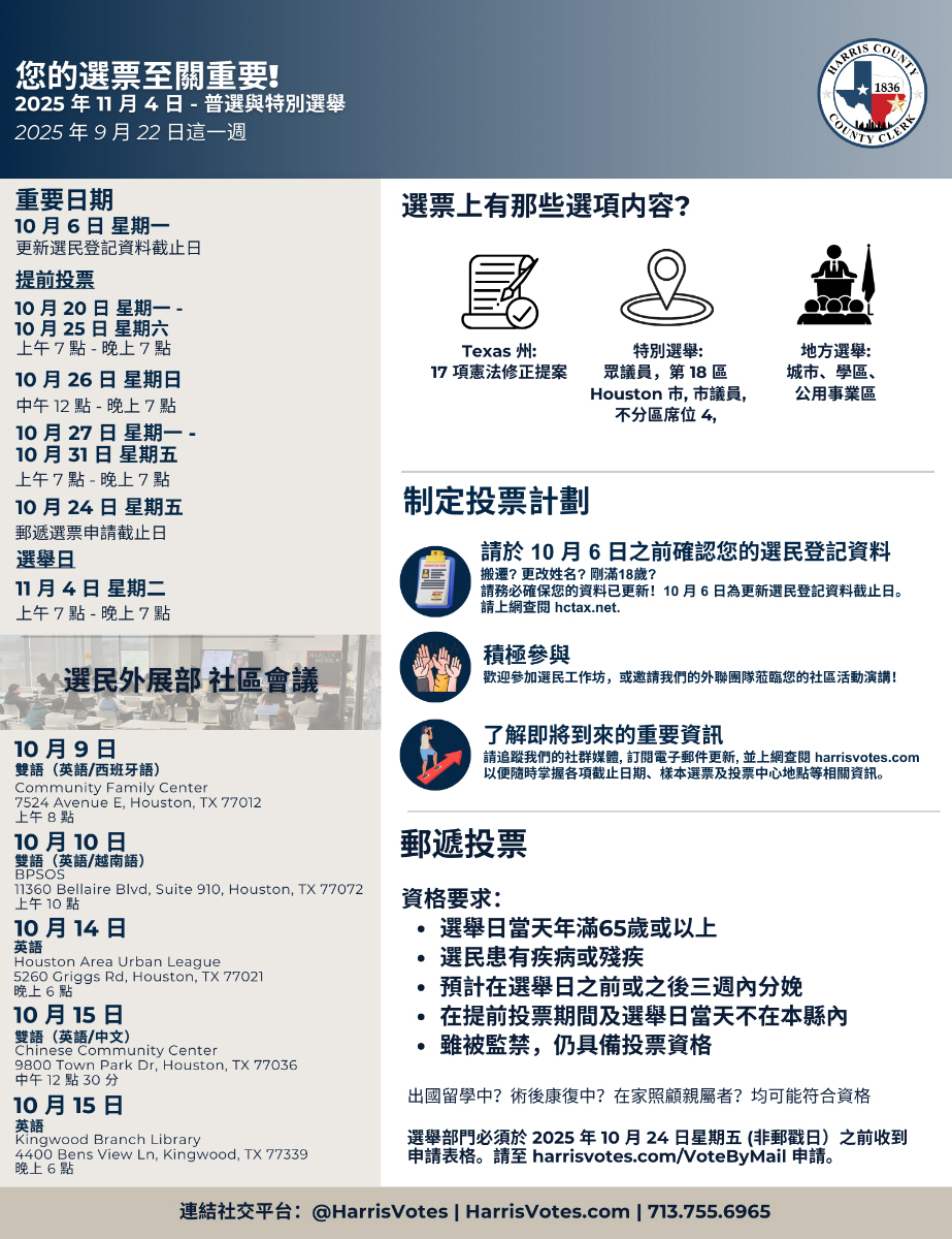 Harris縣行政書記官辦公室選務部將於10月15日中午12點30分,在中華文化服務中心舉行中文及英語社區會議,宣導相關選務注意事項,如需要登記註冊公民選舉權,當天可在社區會議中向相關人員提出申請,但只能在下次選舉中投票。