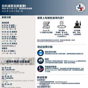 Harris 縣行政書記官辦公室提醒選民即將到來的 2025 年 11 月 4 日普選與特別選舉,以及CD-18極可能在 2026 年 1 月舉行決選...