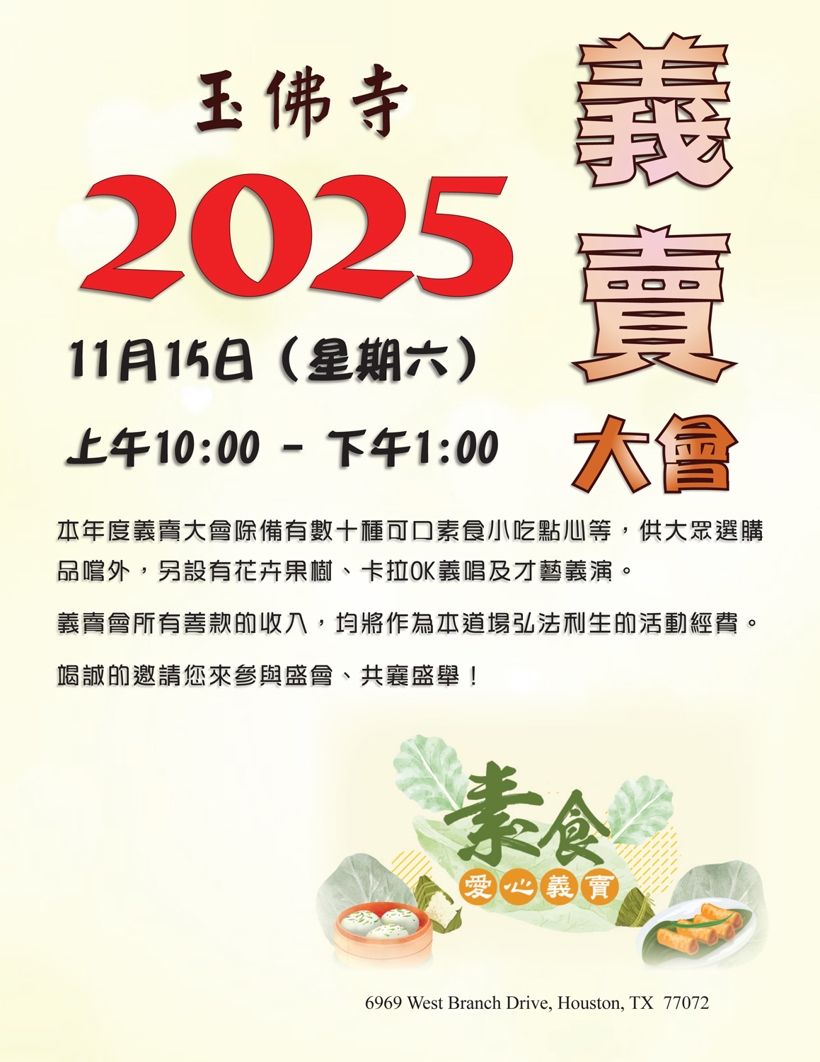 德州佛教會玉佛寺,2025年的義賣大會,將於11月15日上午10點登場,現場除了備有數十種可口素食小吃點心外,另外還準備了花卉果樹讓大家選擇,並有卡拉OK義唱及才藝演出,為現場增添熱鬧氣氛。地點在玉佛寺,地址6969 West Branch Drive, Houston, TX 77072