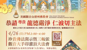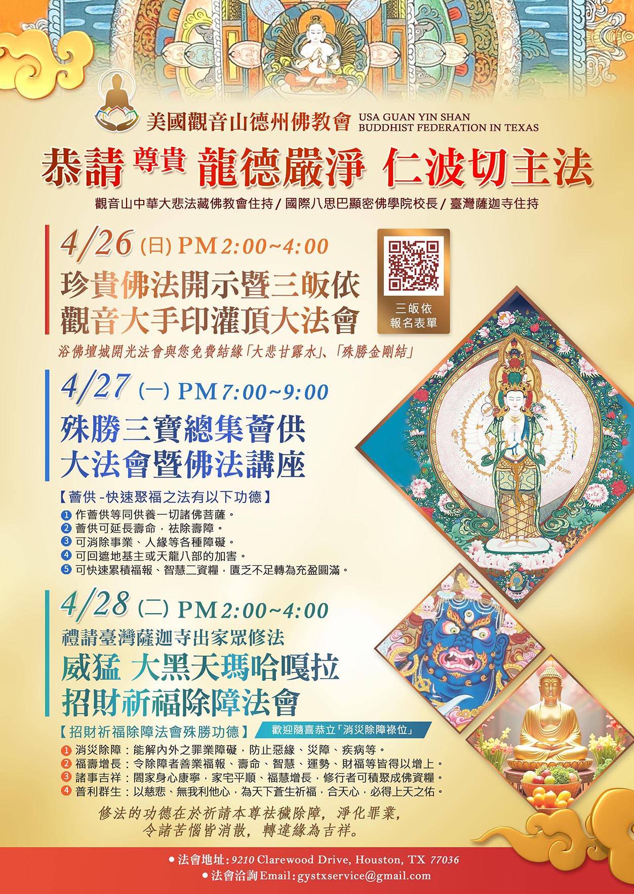 「美國觀音山德州佛教會」是休士頓的一方淨土,主辦連續三日的佛法殊勝法筵,於4月26日至4月28日隆重舉行法會,將恭請尊貴 龍德嚴淨仁波切親臨主法,賜予大眾珍貴契機的佛法開示與慈悲的加持。