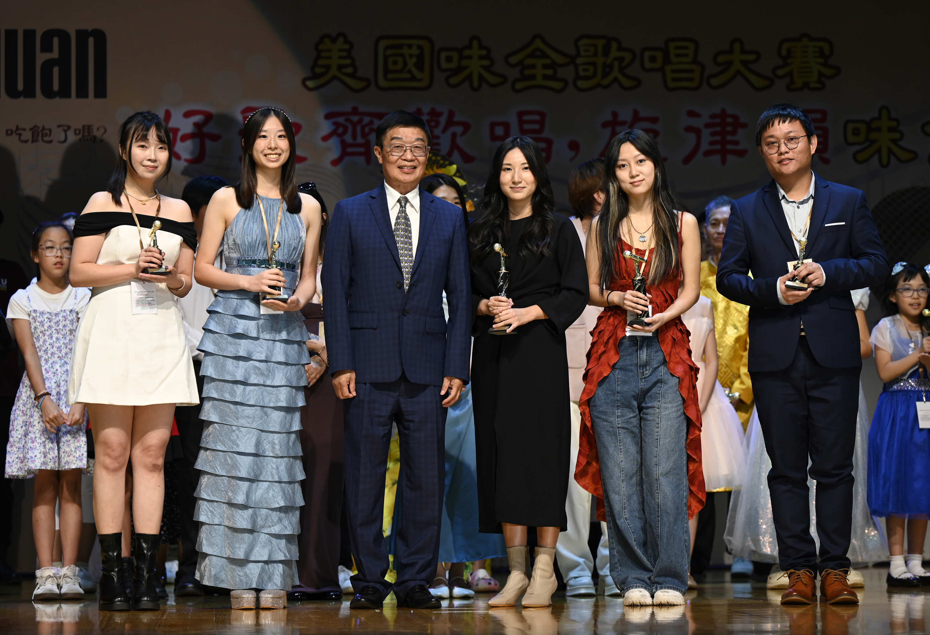 2025美國味全「好歌齊歡唱 旋律韻味全」歌唱大賽,青年組獲獎人接受獎座殊榮,前排手持獎座者左起賴筱珺、詹志真、美國味全副總經理施教敦、于穎、潘澍、郭宇安。