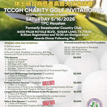 休士頓台灣商會與慈濟聯合舉辦的慈善高爾夫球賽,5月16日將於TPC Houston Formerly Sweetwater Country Club舉行,歡迎有志一同的球友共襄盛舉...