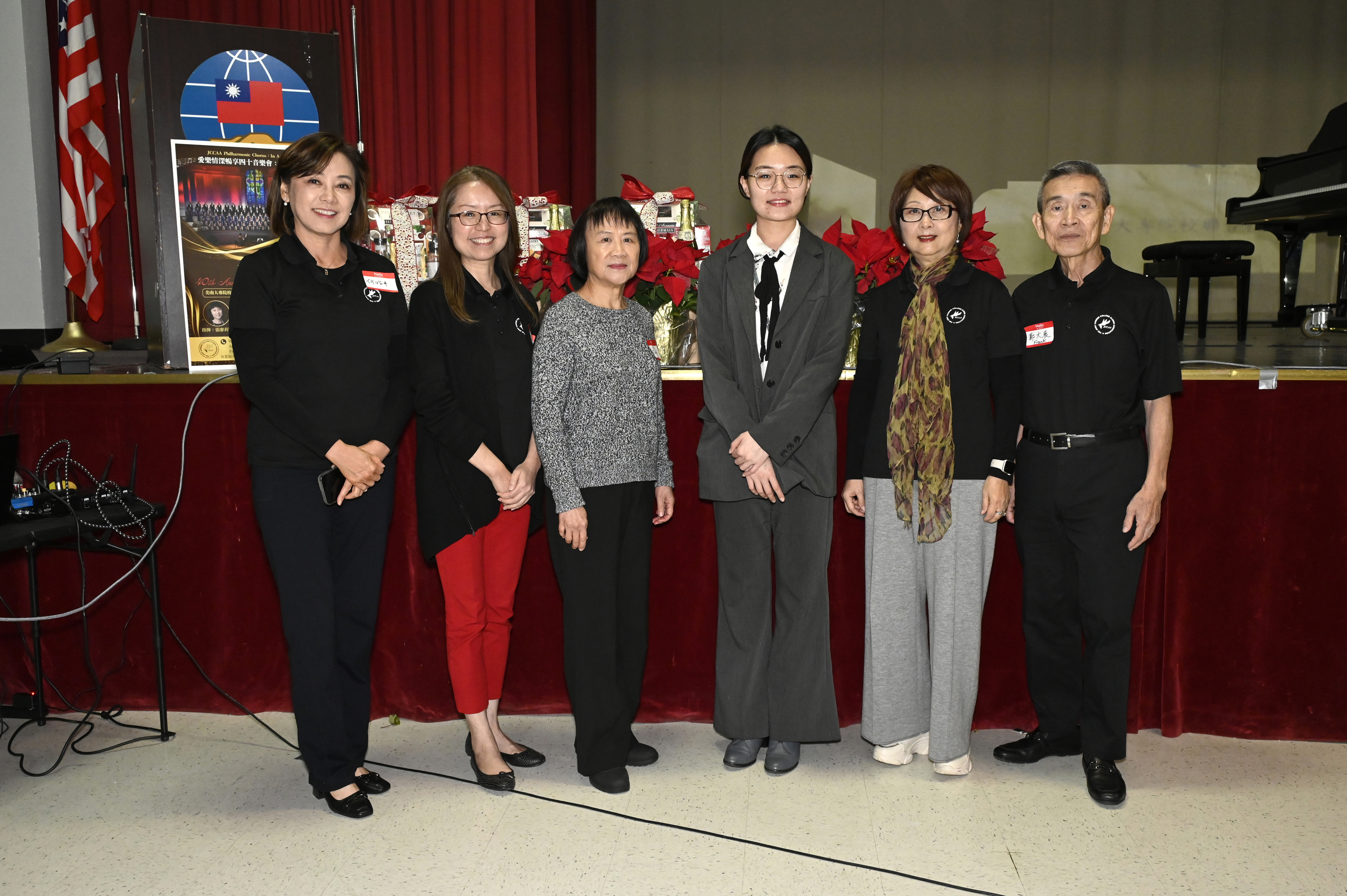 2025年12月美南大專院校聯合校友會「愛樂情深 暢享四十」音樂會新聞發布會上,活動關鍵人合影,左起共同召集人何怡中、邱佩冠會長、指揮張廖莉娜、副主任房亭妤、召集人謝家鳳、鄭大展團長。