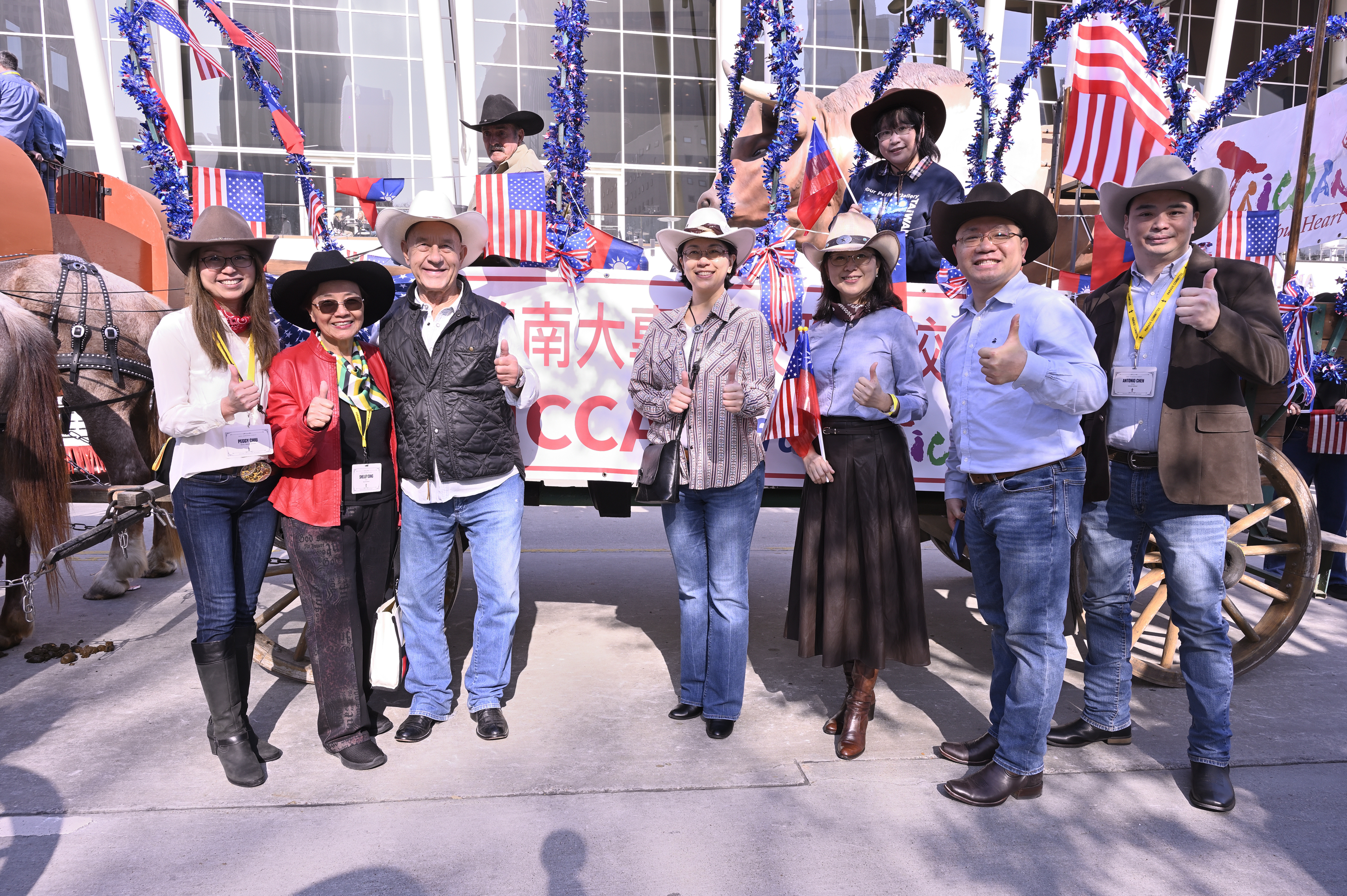 沿途馬車上的蕭伊芳處長、王盈蓉主任、陳育仁副處長、李俊毅副組長、僑務委員劉秀美、大專校聯會邱佩冠會長、劉美玲、辜千慈前會長、揮舞著中華民國國旗及美國國旗,與夾道民眾熱烈吶喊呼應,每到路口轉角處,大會隨即宣告介紹遊行隊伍,加深了民眾對台灣的印象,讓休士頓僑胞再一次成功,將中華民國台灣推向主流,增加能見度。