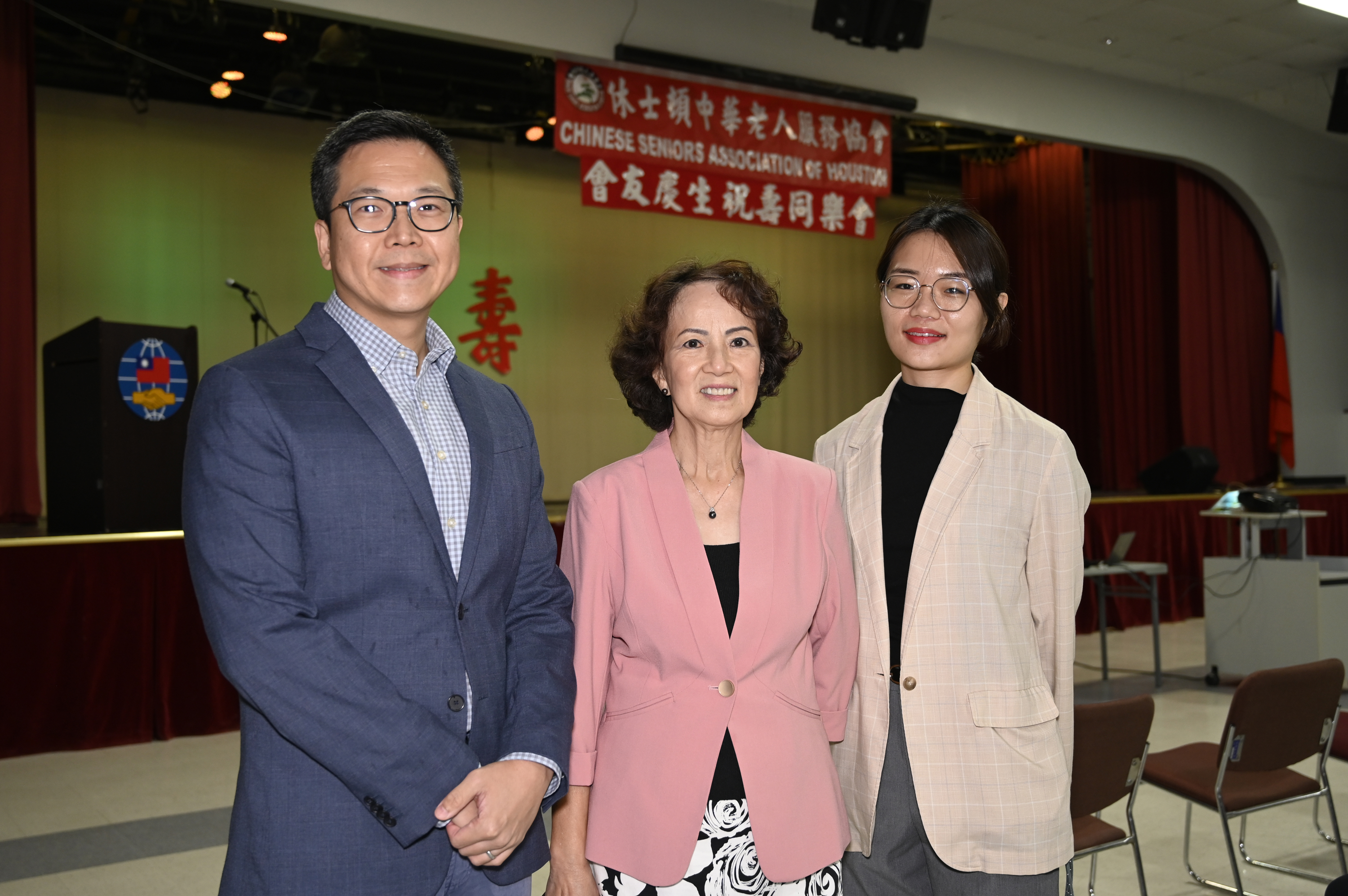 中華老人服務協會趙婉兒會長(中)與房亭妤副主任(右)、許環麟醫師(左)在第三季慶生會上合影。