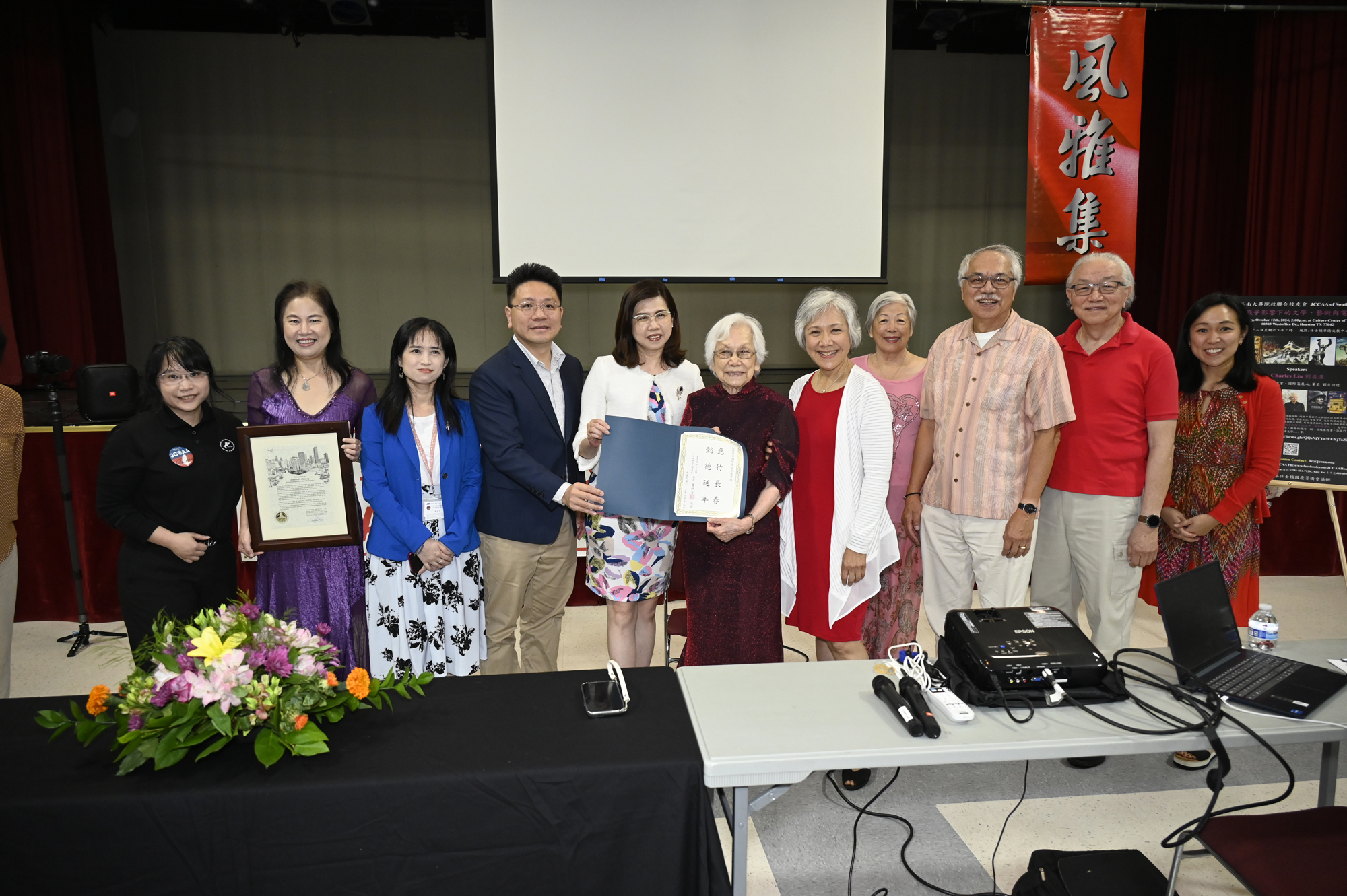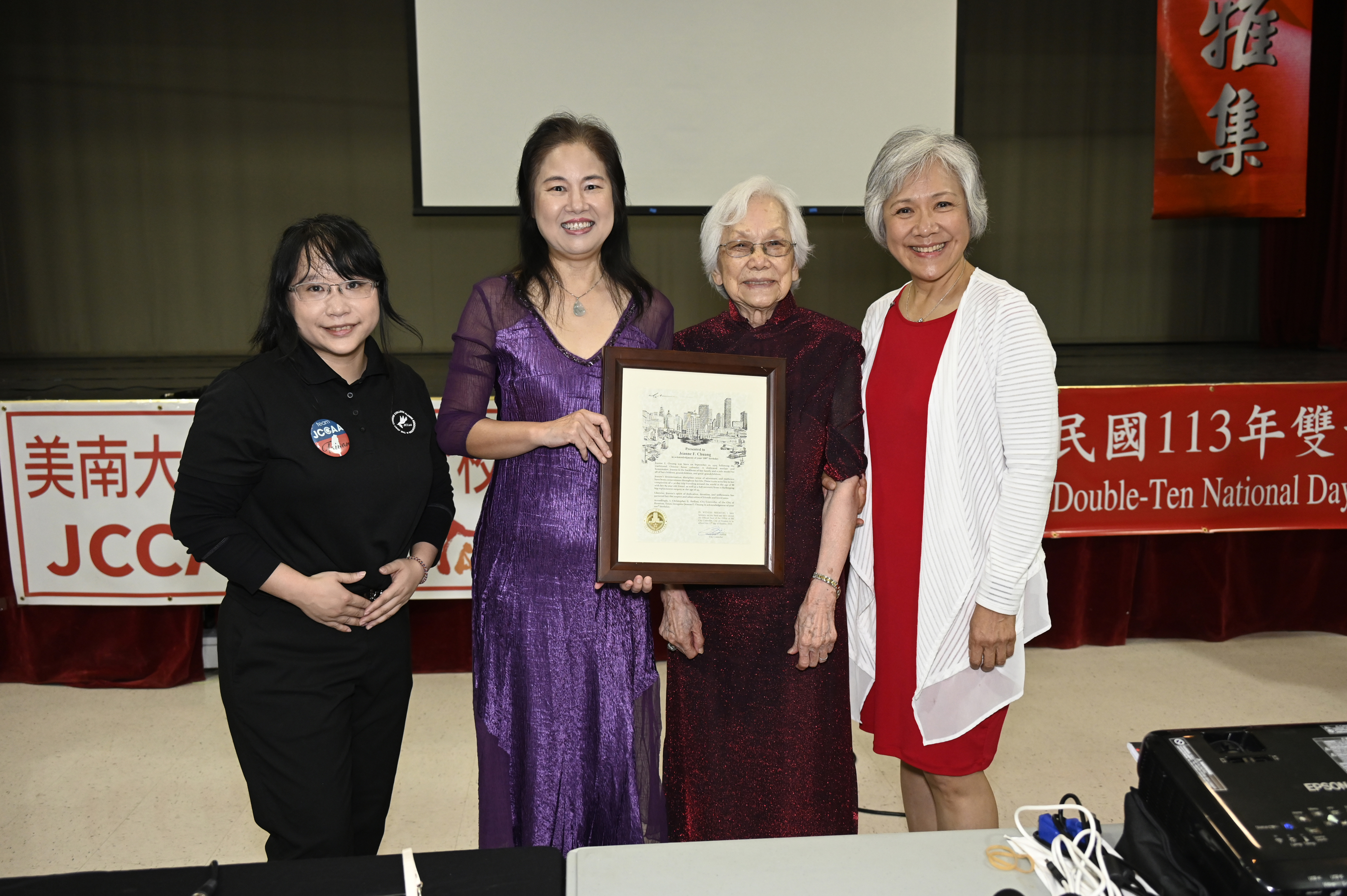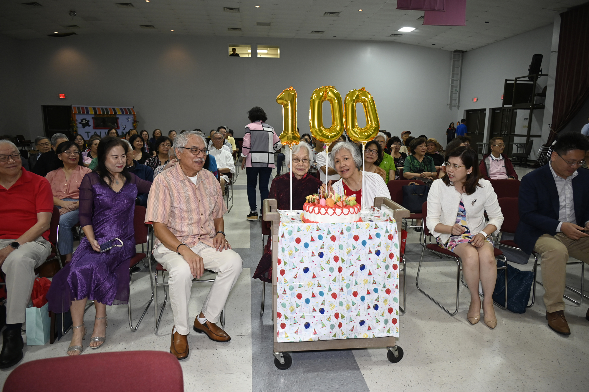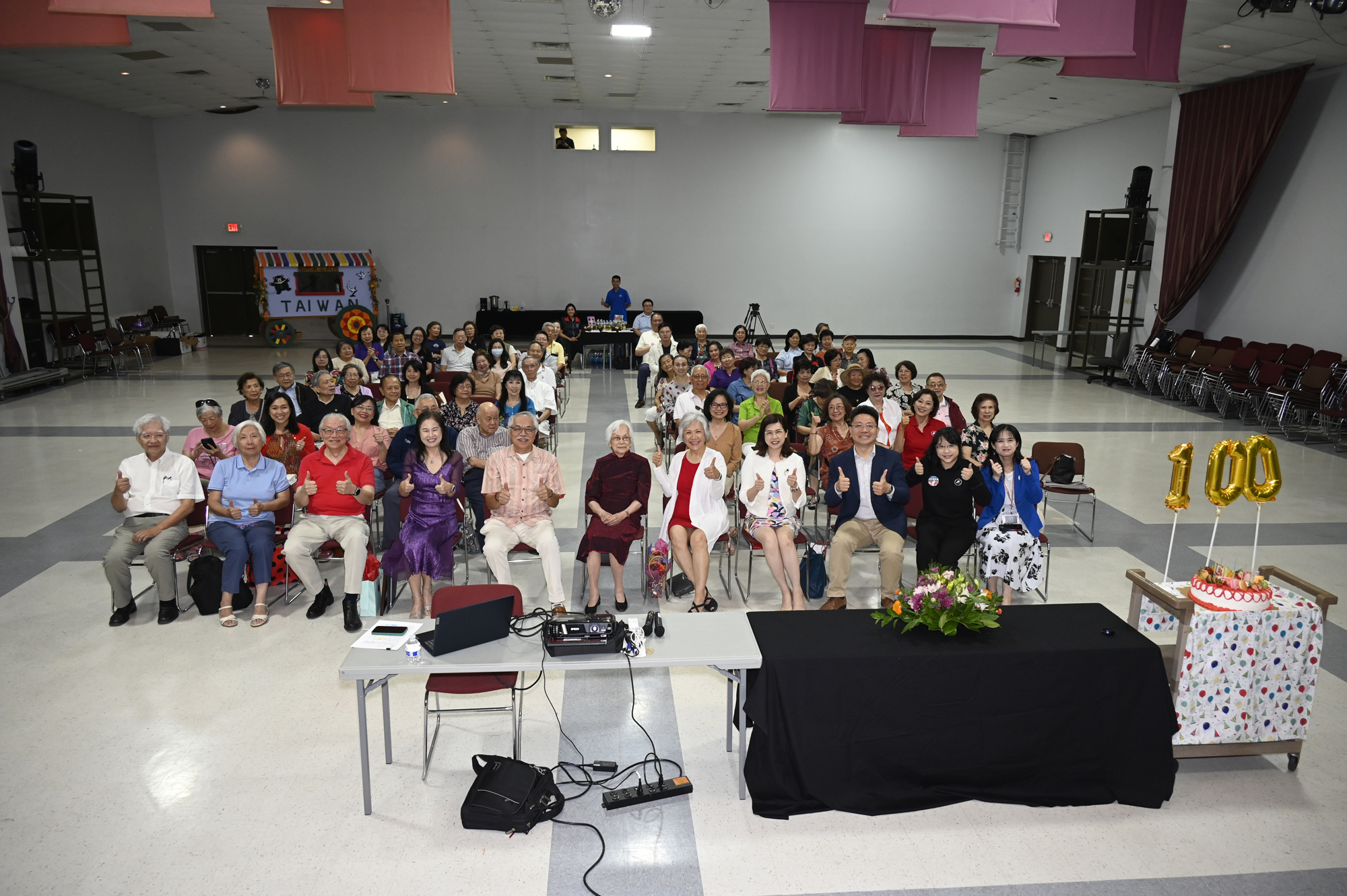 主辦單位的兩位代表辜千慈會長(左一)、楊嘉玲主任委員(左二)祝賀壽星莊黃福珍(右二)百歲生日。