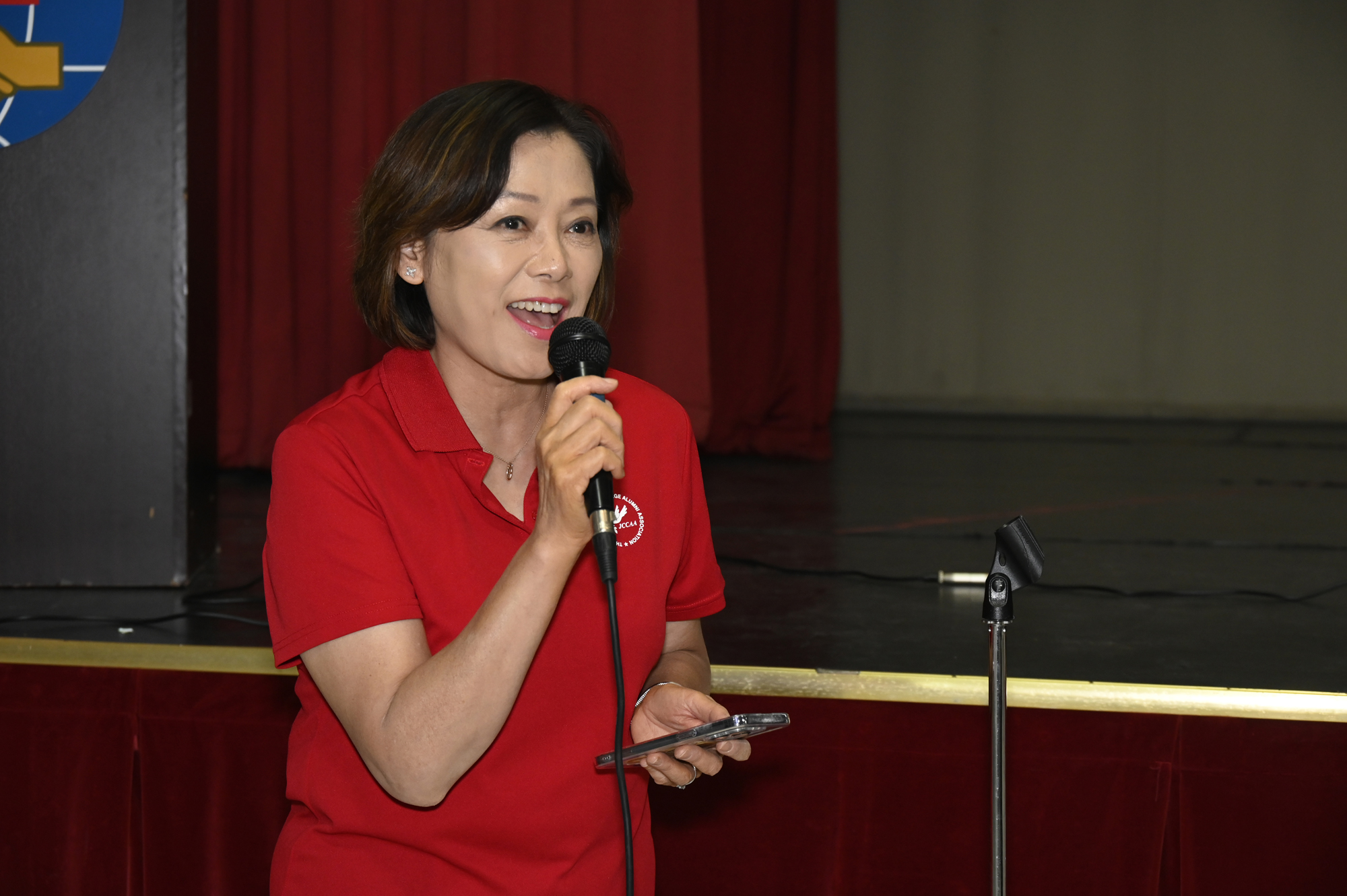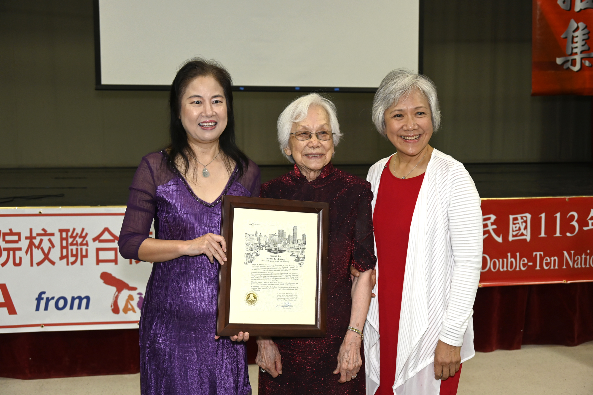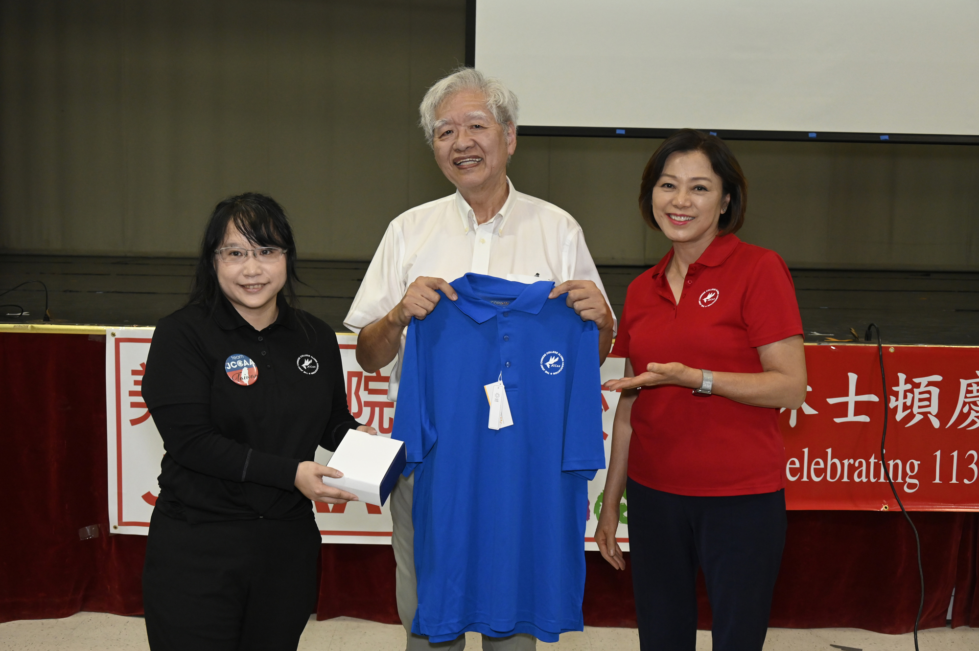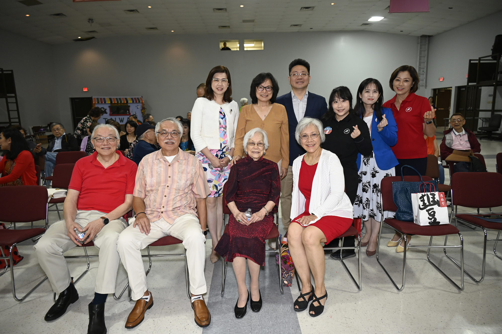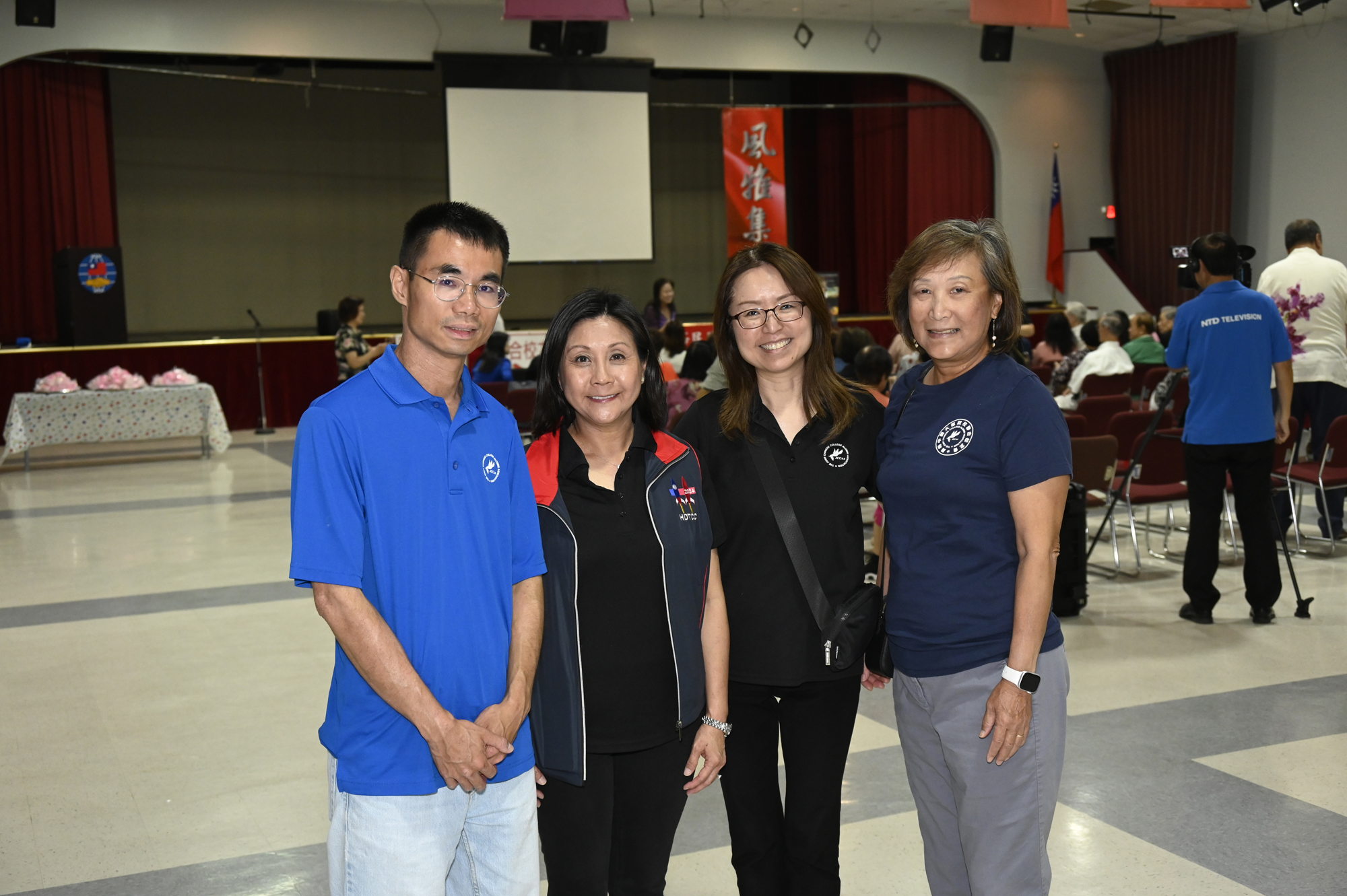 主辦單位的兩位代表辜千慈會長(左一)、楊嘉玲主任委員(左二)祝賀壽星莊黃福珍(右二)百歲生日。