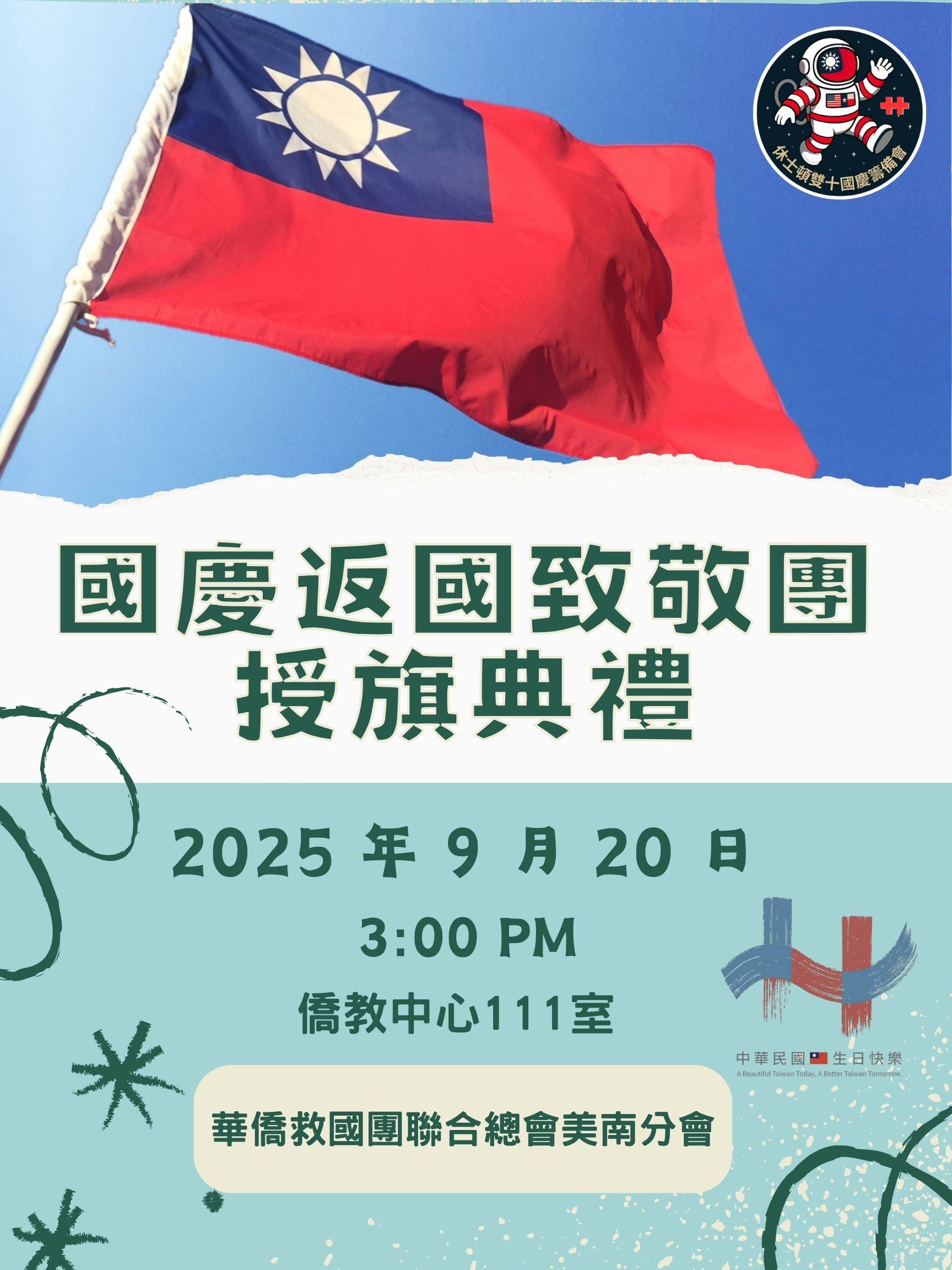 由華僑救國團聯合總會美南分會組成的返國致敬團,9月20日下午3點將於僑教中心展覽室,舉行授旗儀式,將代表休士頓僑胞回台同慶雙十,同時旅遊一番。雙十慶典期間希望回台輕鬆一下的僑胞,可向李迎霞詢問旅遊內容,報名參加。