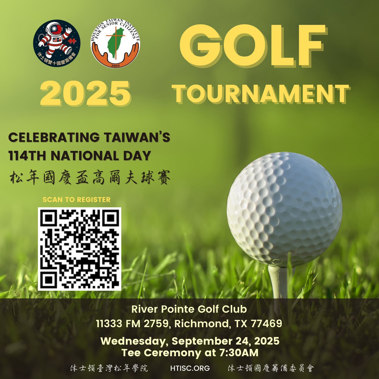 松年國慶盃高爾夫球賽開打在即,今年賽事地點改在River Pointe Golf Club,地址 11133 FM 2759, Richmond, TX 77469,日期為9月24日上午開打,希望感受在涼爽的秋季早晨,馳騁在大自然中的舒暢感,就要趕快報名參賽。早晨7:30開球典禮,可在線上報名。