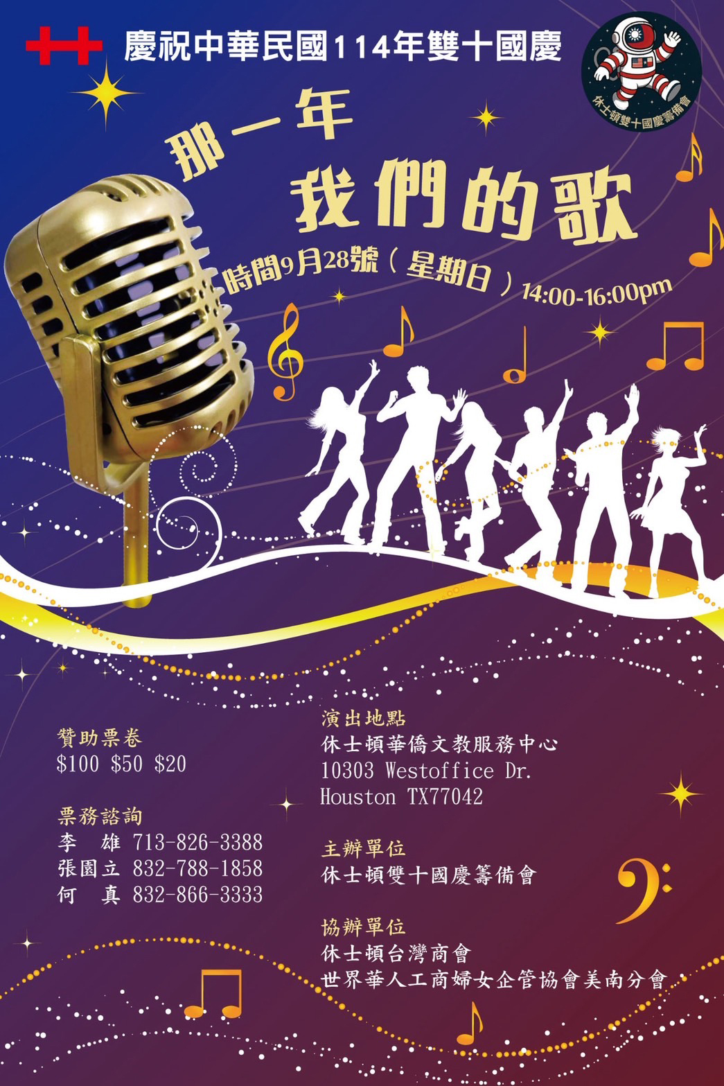 這場由休士頓雙十國慶籌備會主導,台灣商會及世華美南分會全力支援的演唱會,全場演唱將由現場樂隊伴奏,帶您一起聆聽過去熟悉的歌曲,在雙十慶典期間,齊聚一堂,以歡樂的心情,慶祝國慶。 演唱會時間為9月28日下午2點開始,地點在僑教中心。