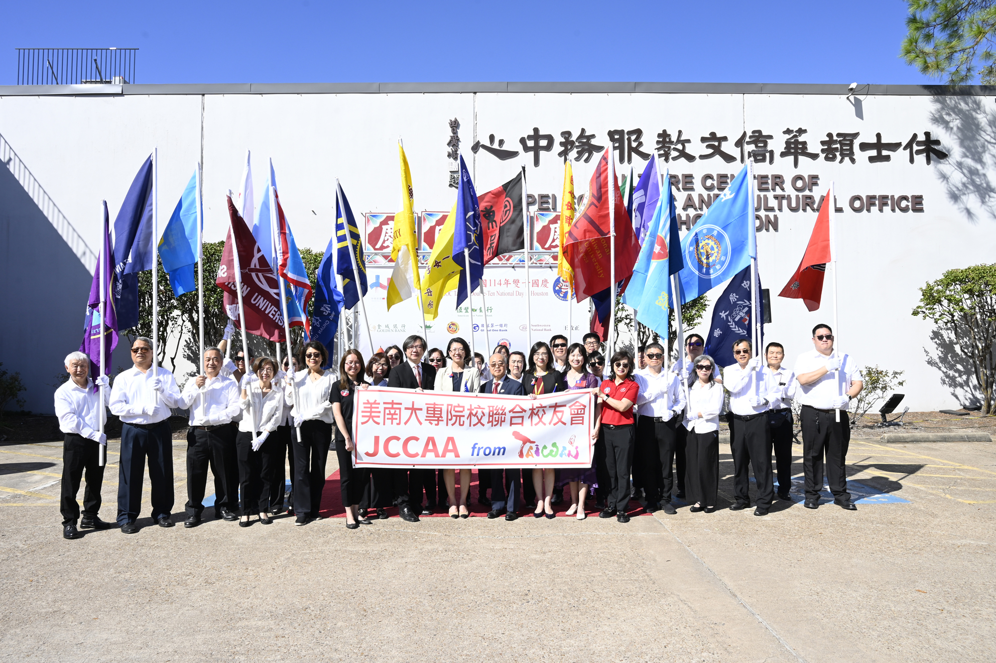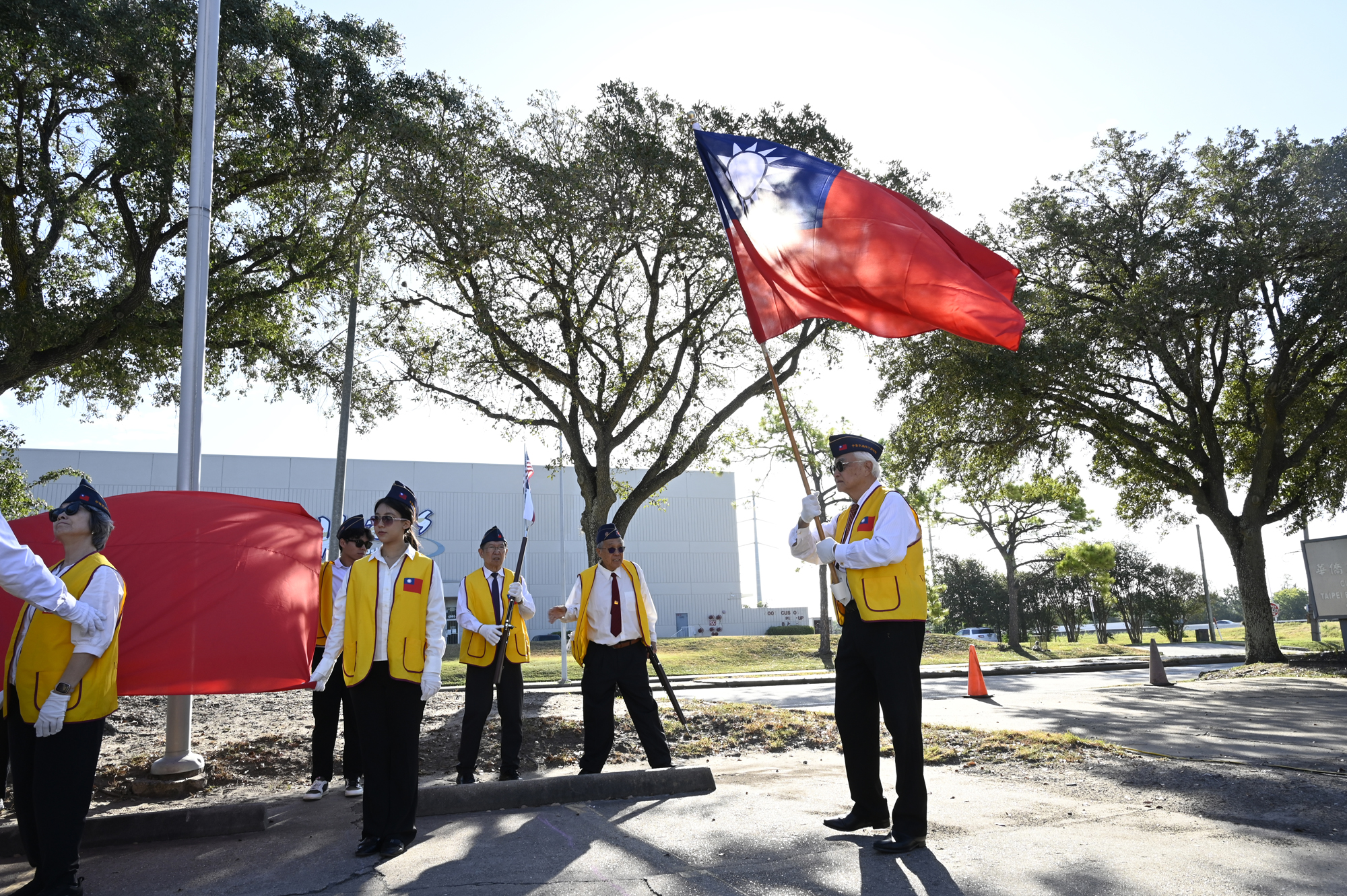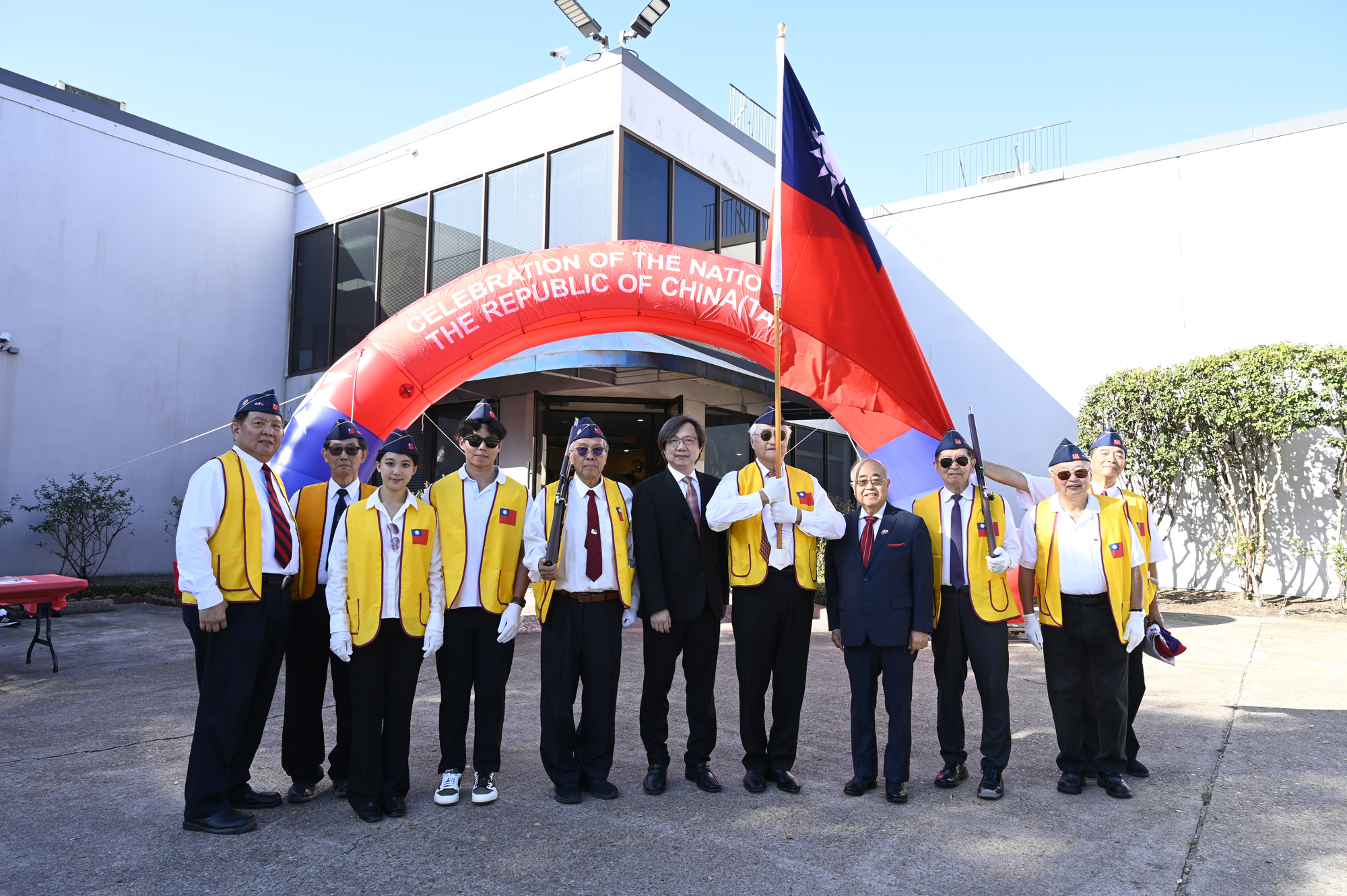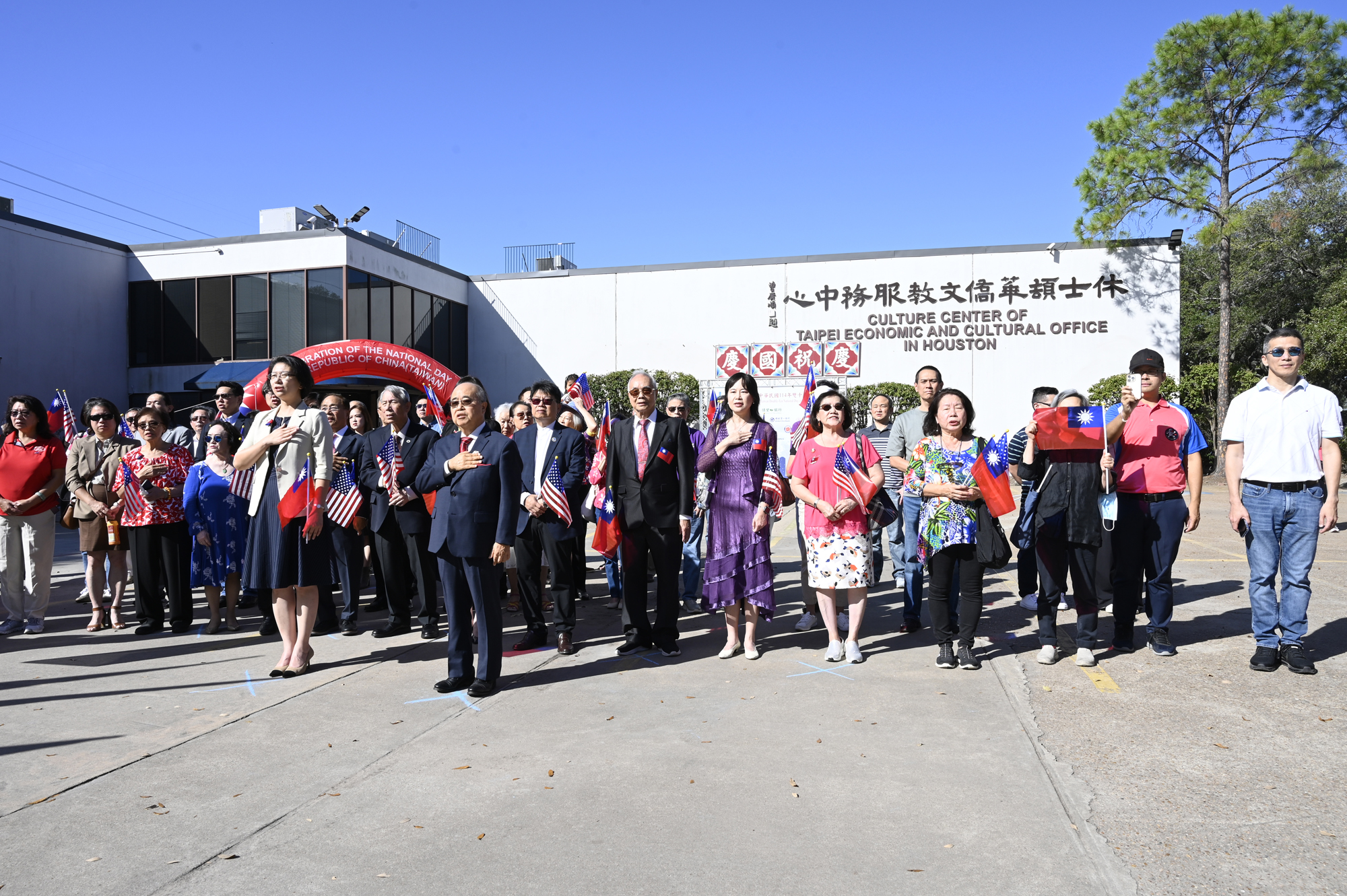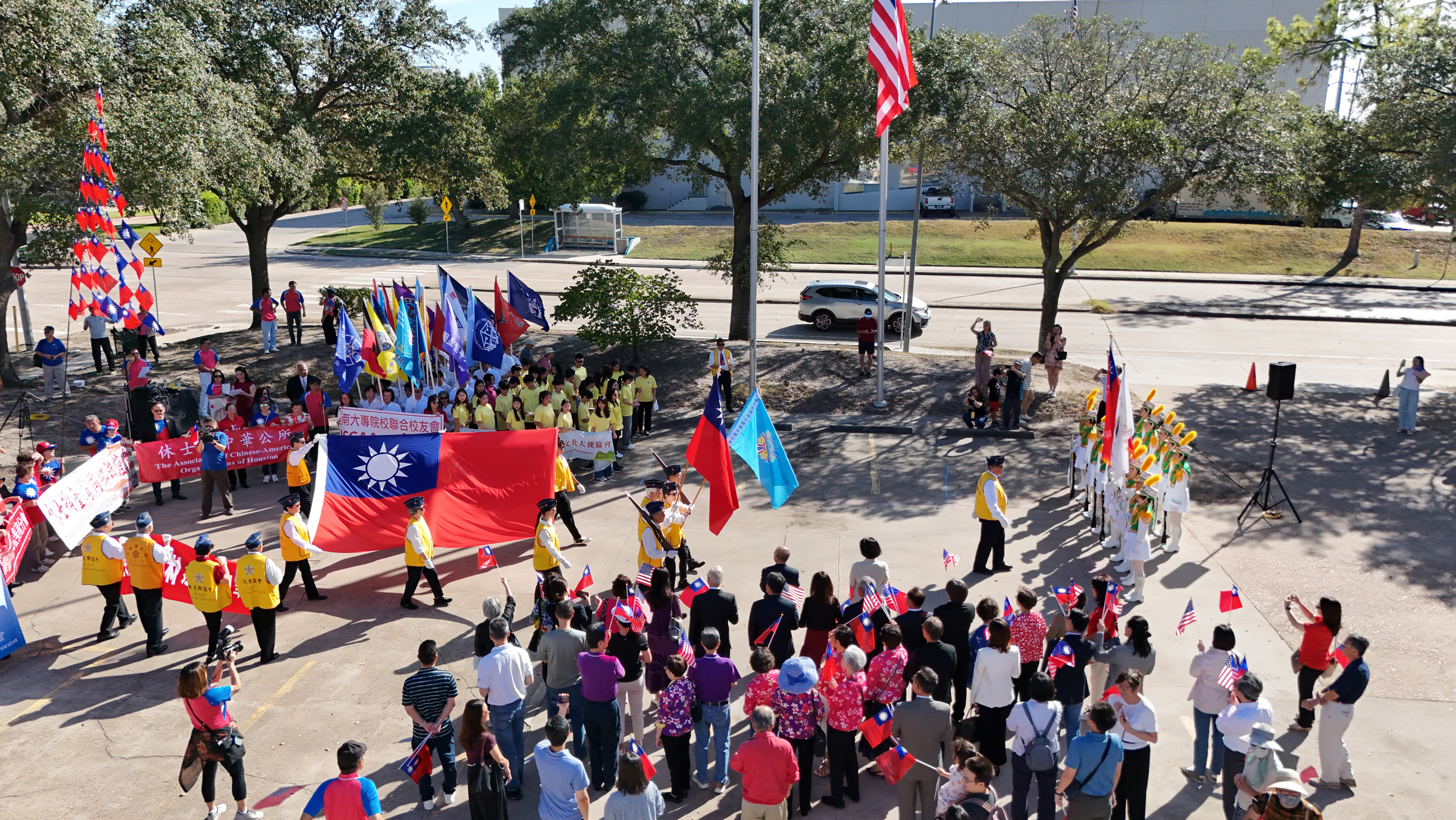 2025年休士頓僑教中心前廣場的國慶國升旗典禮一景。