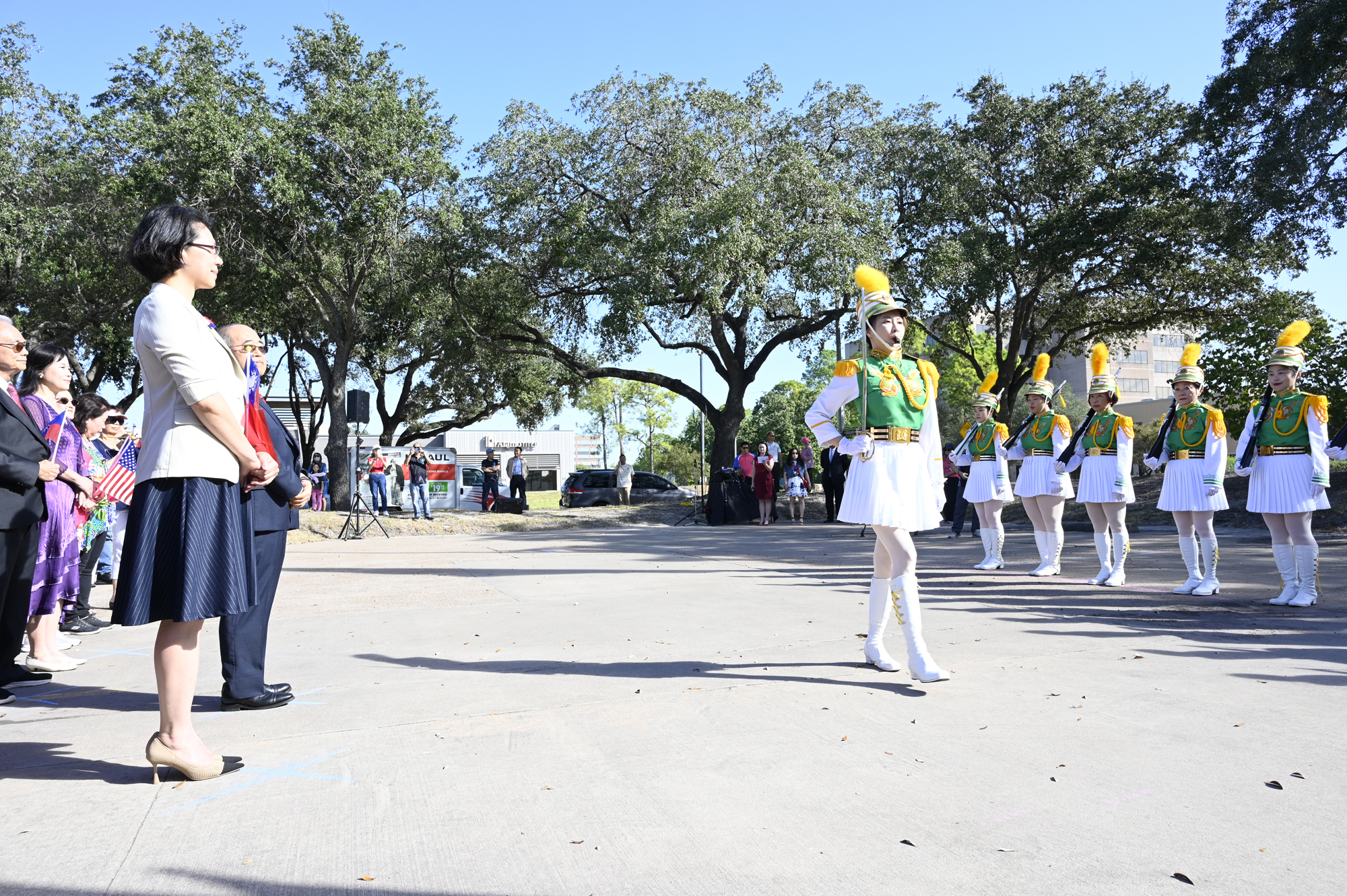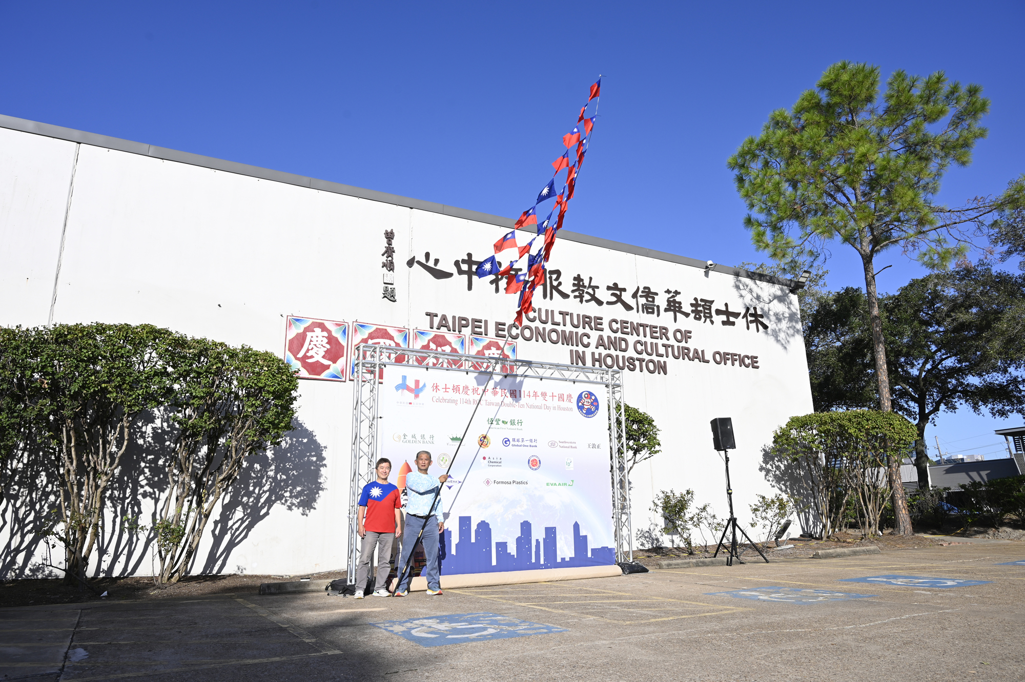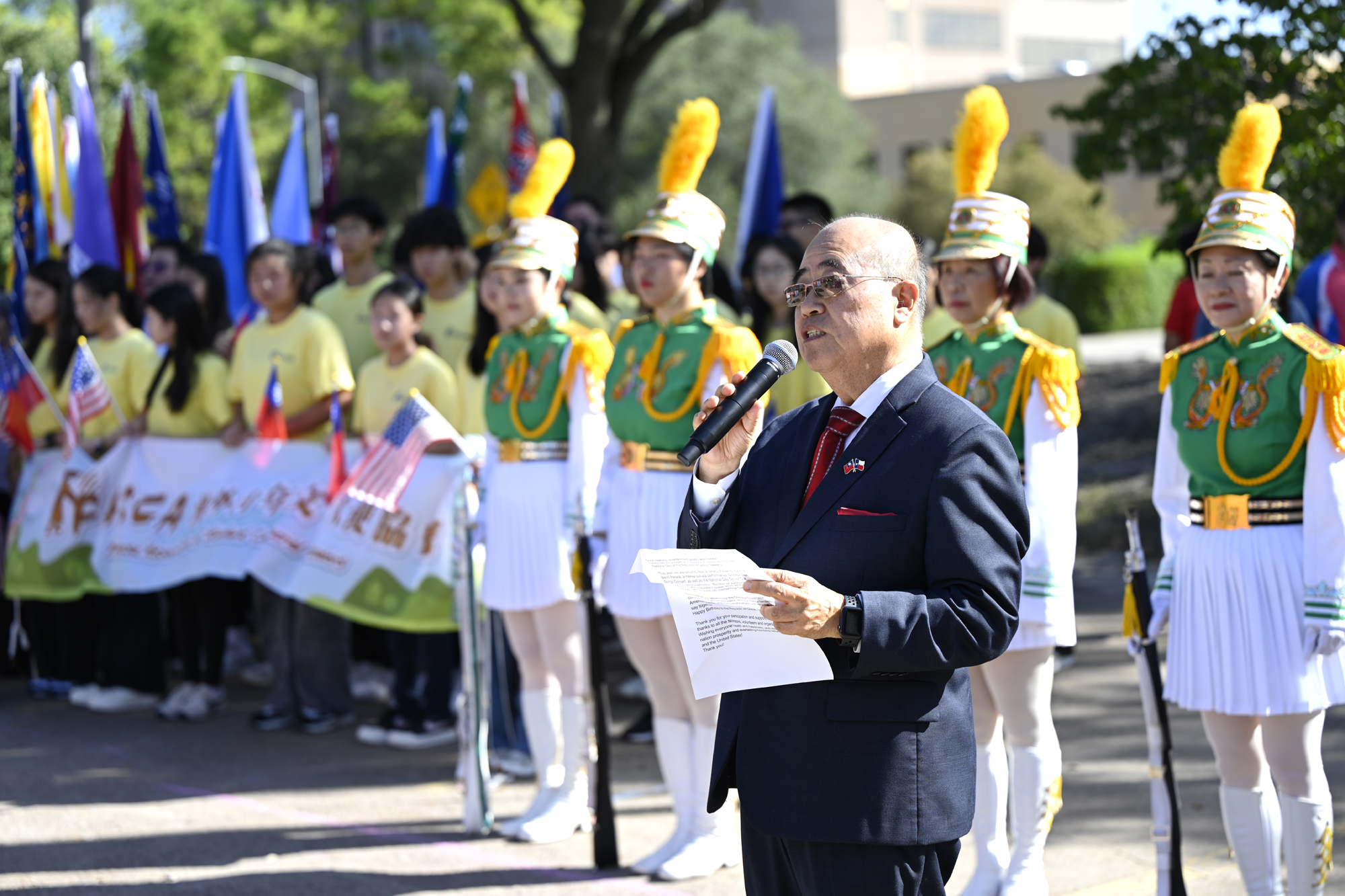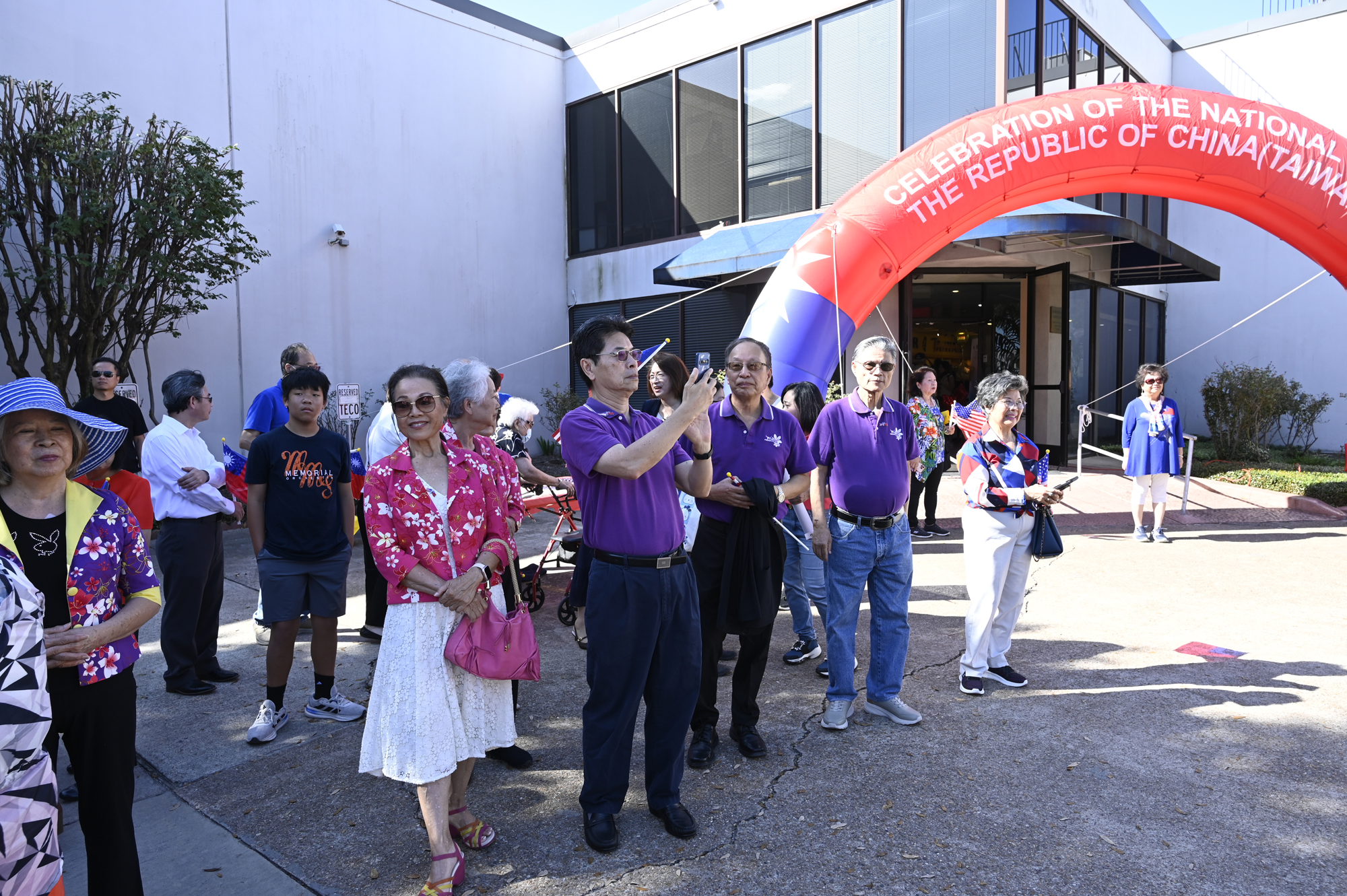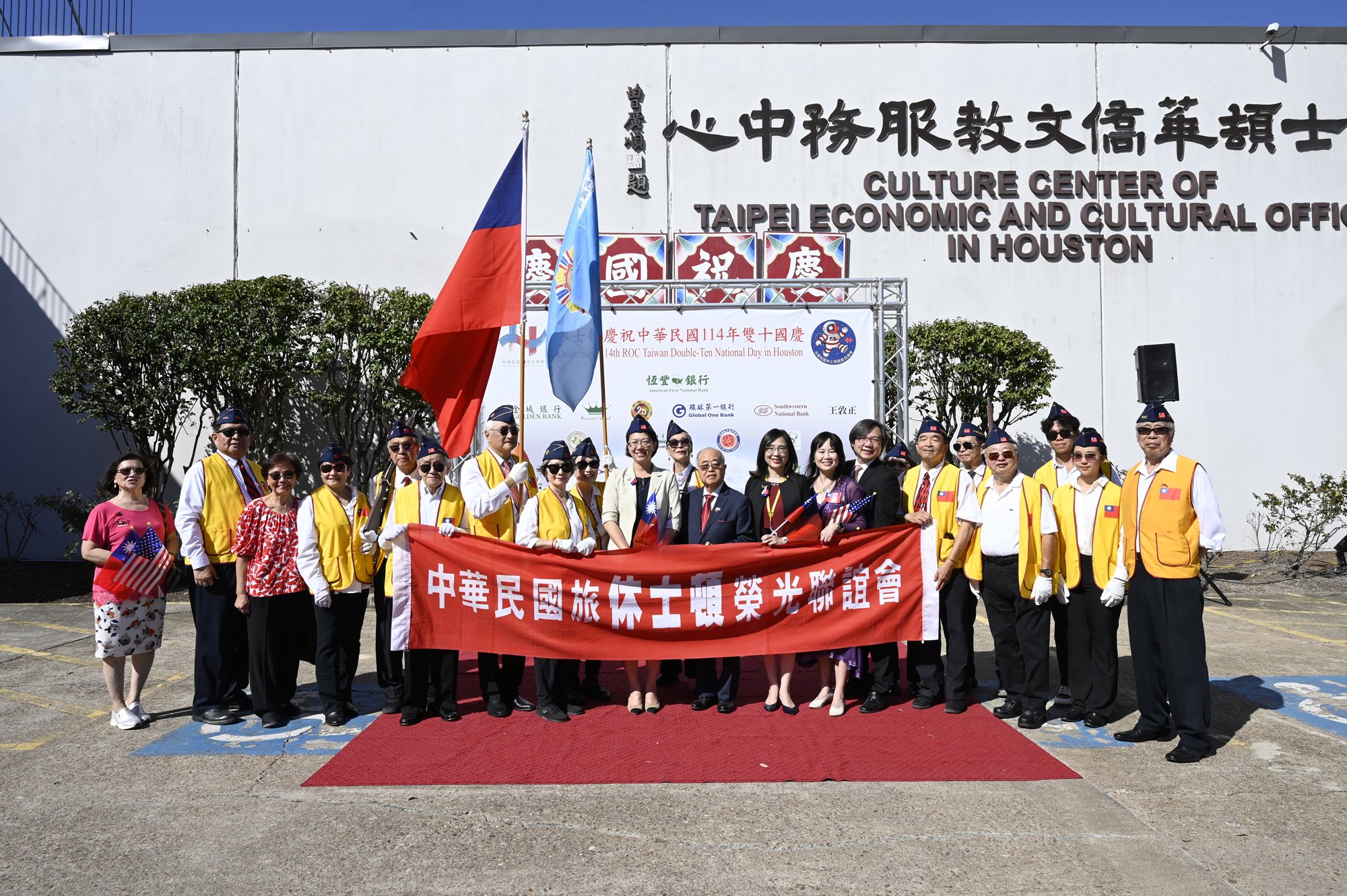 2025年休士頓僑教中心前廣場的國慶國升旗典禮一景。