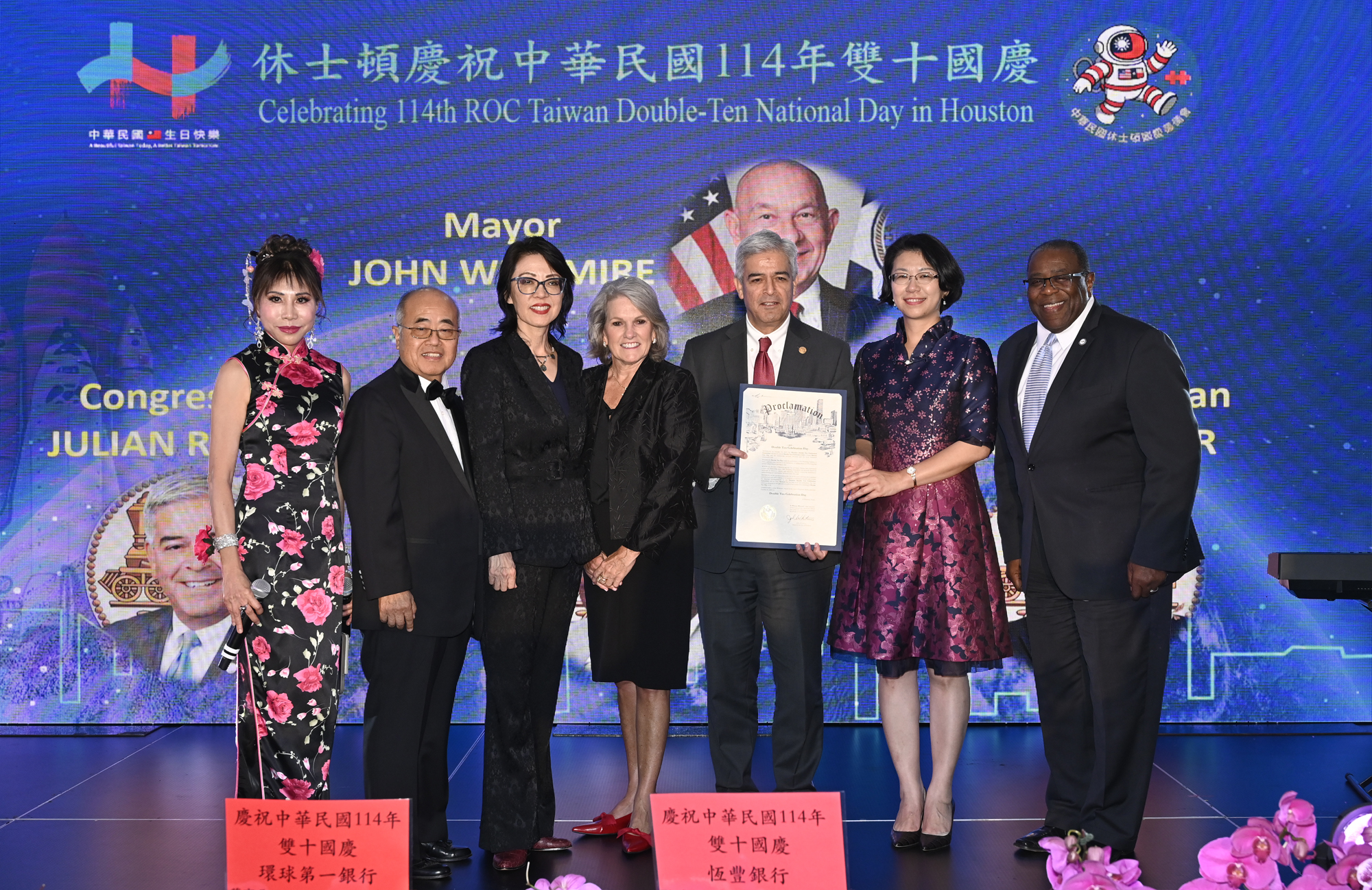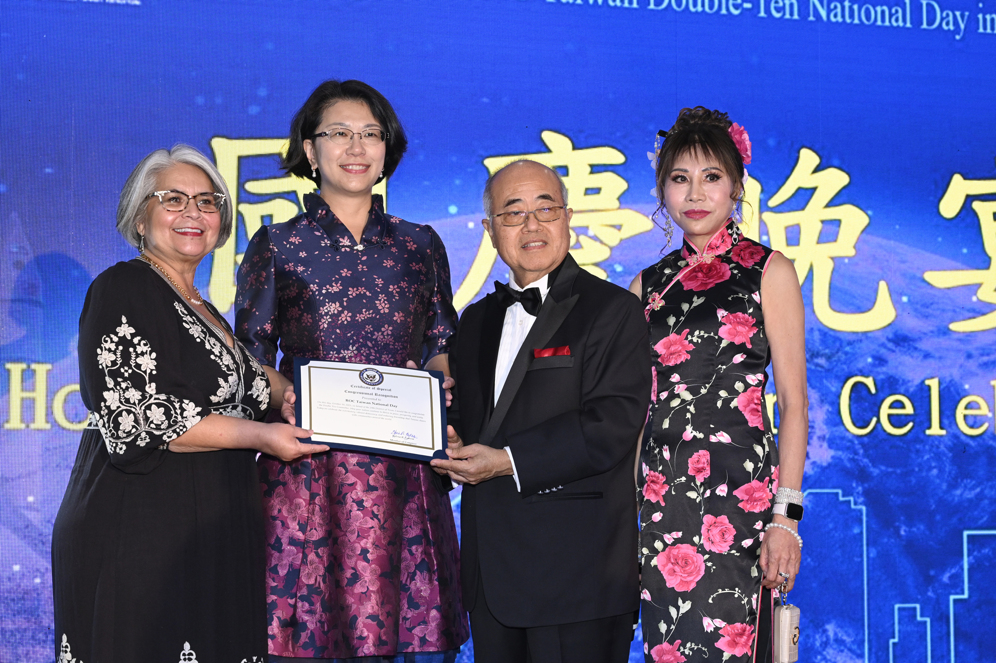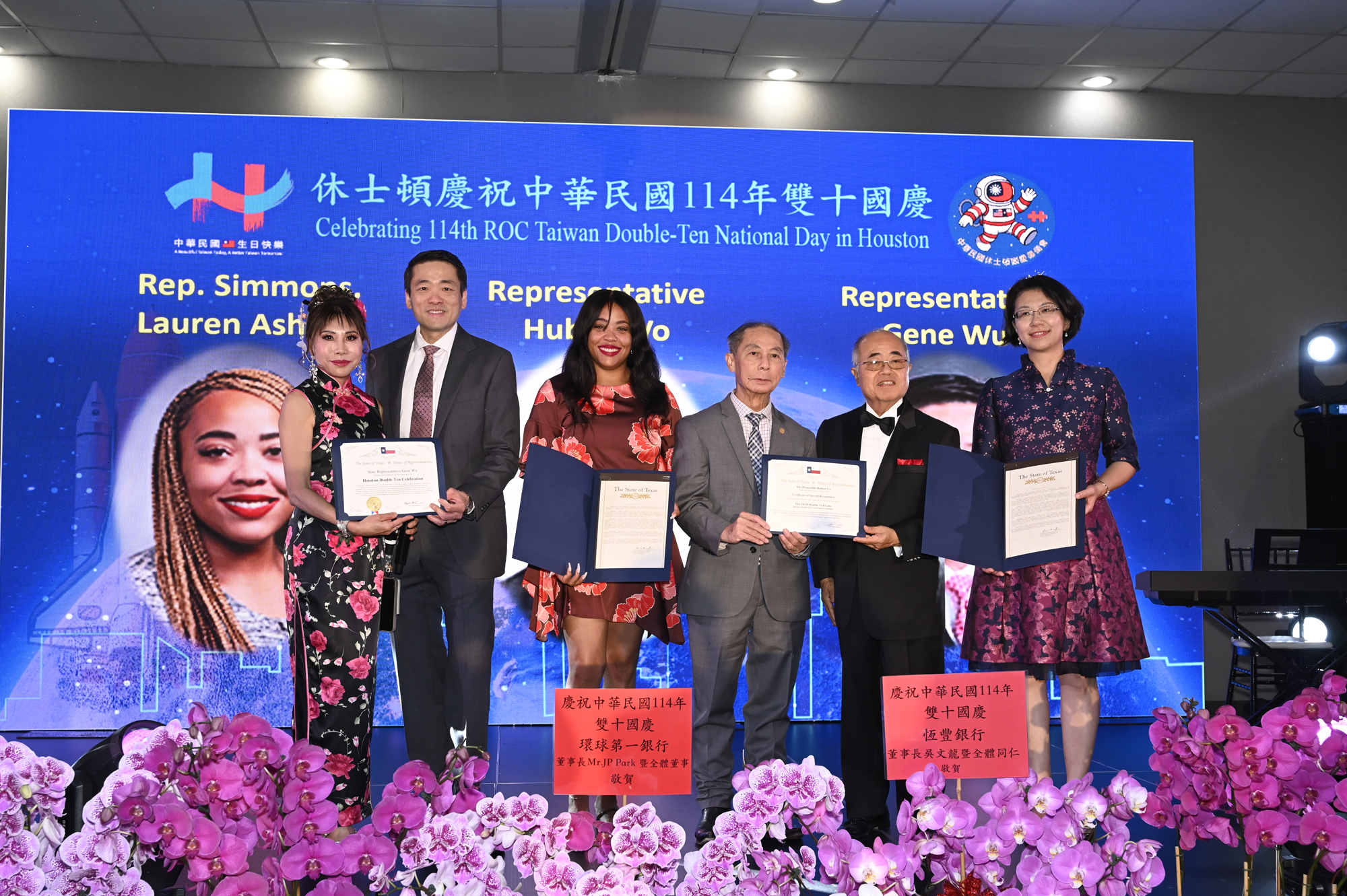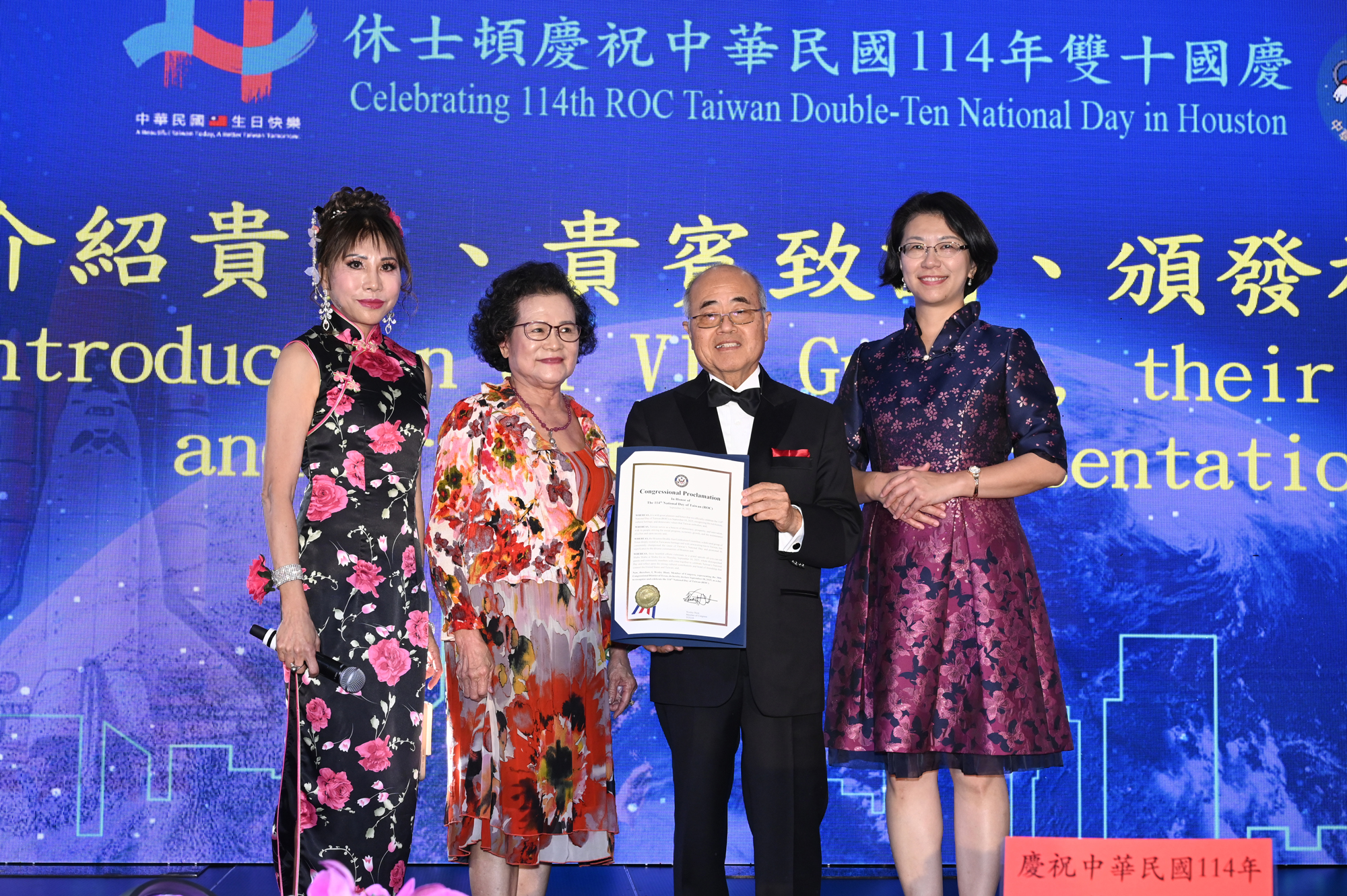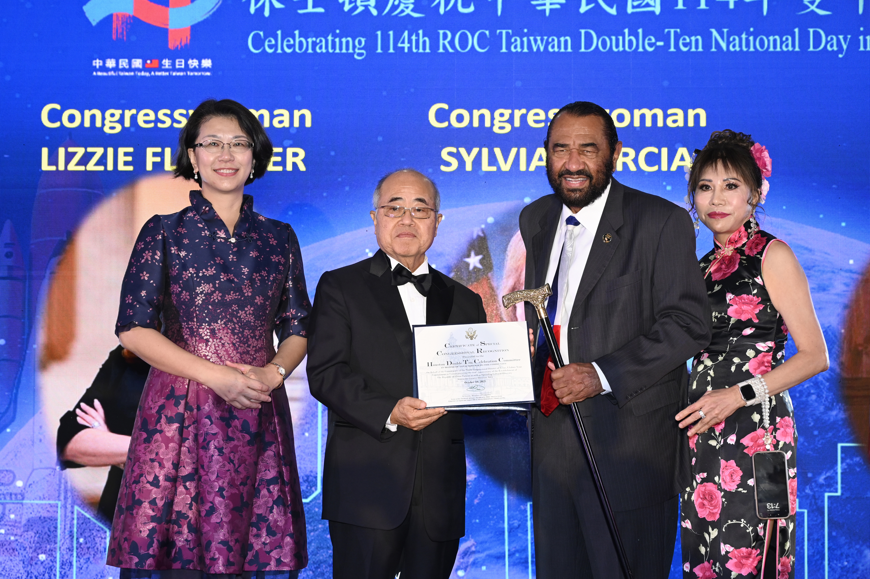 2025年國慶國慶晚宴上,蕭伊芳處長(左一)、林富桂律師(右一)陪同國慶籌備會李雄主任委員(左二)接受國會議員Al Green(右二)致贈賀狀。