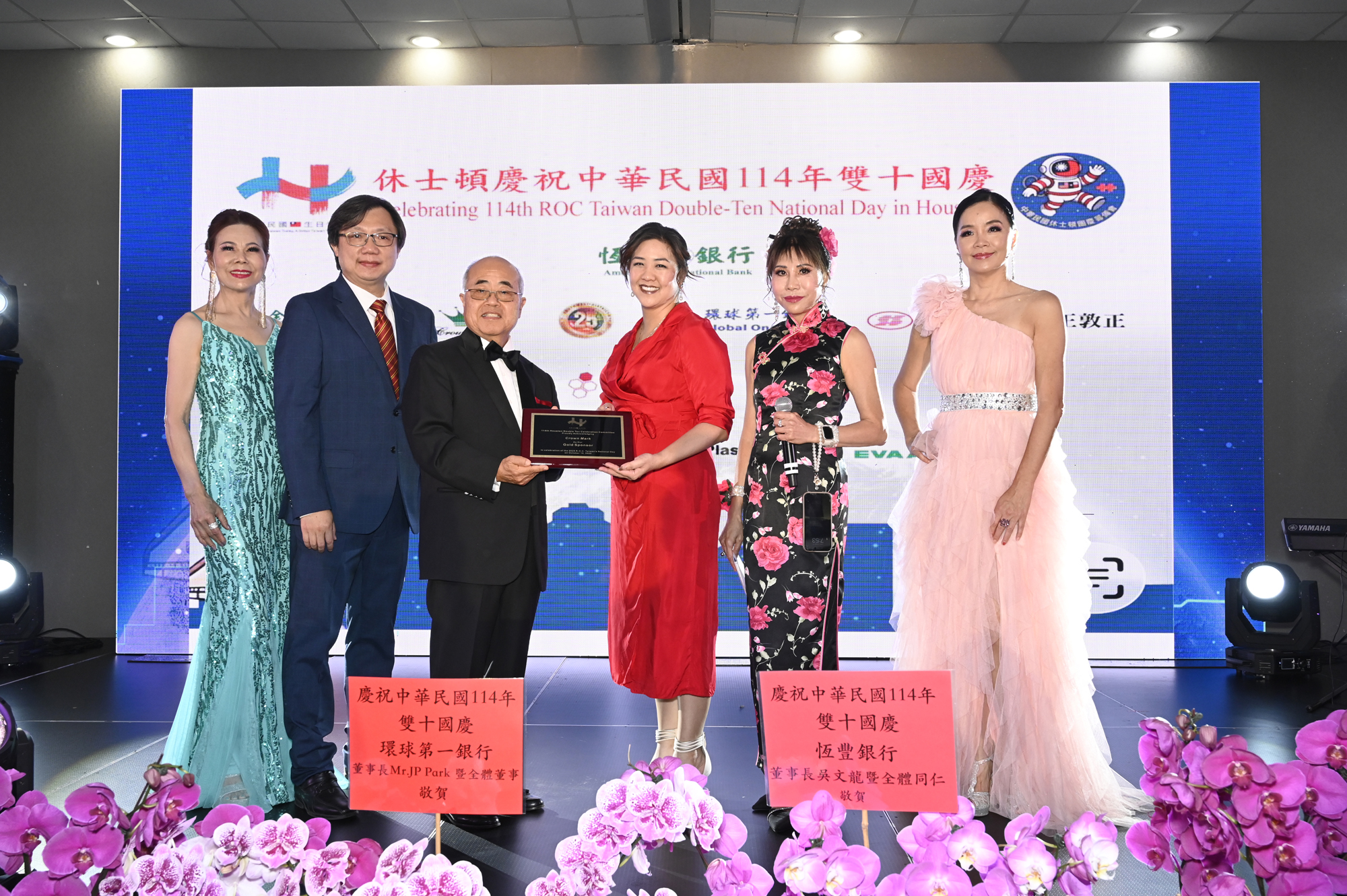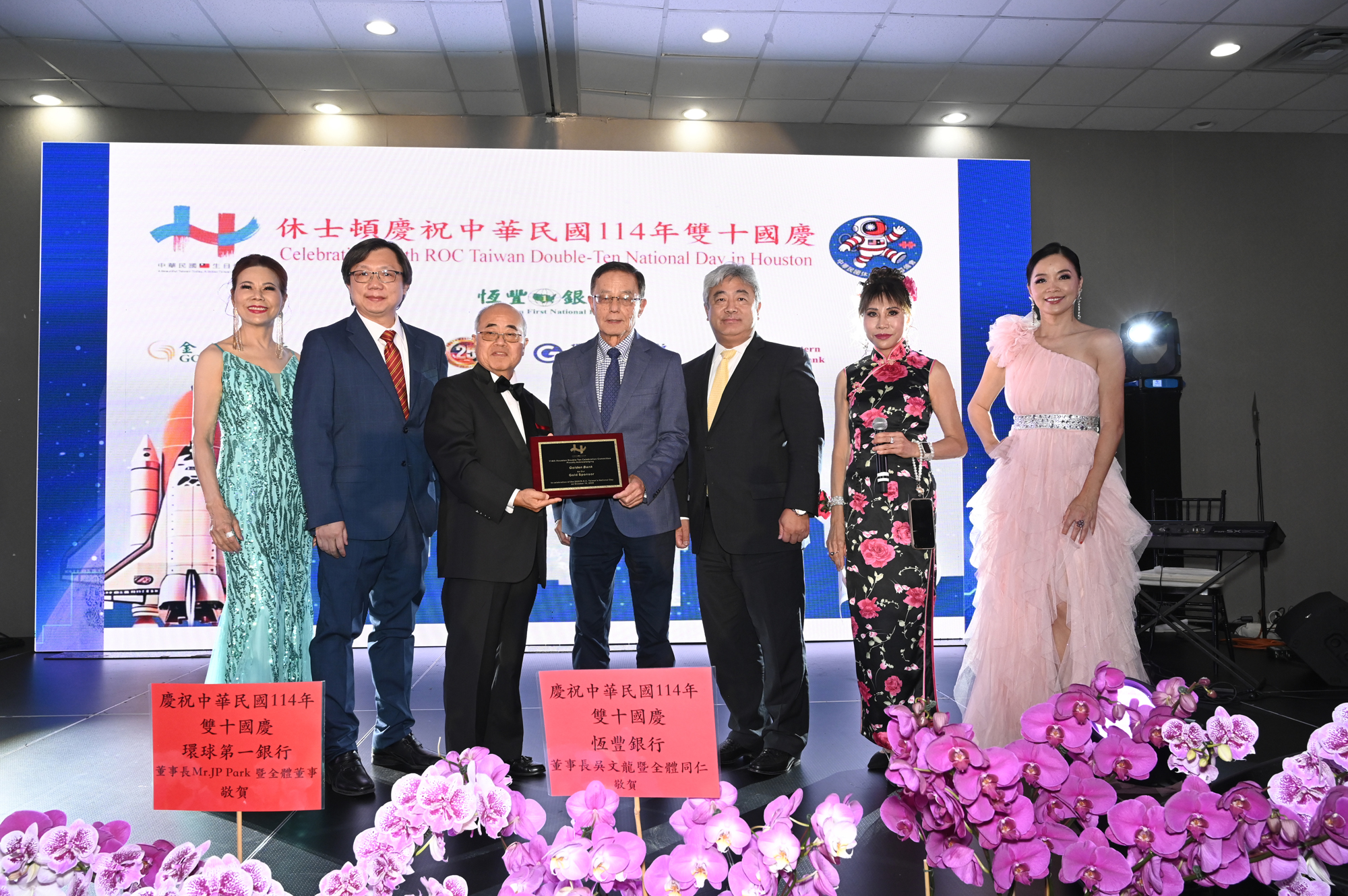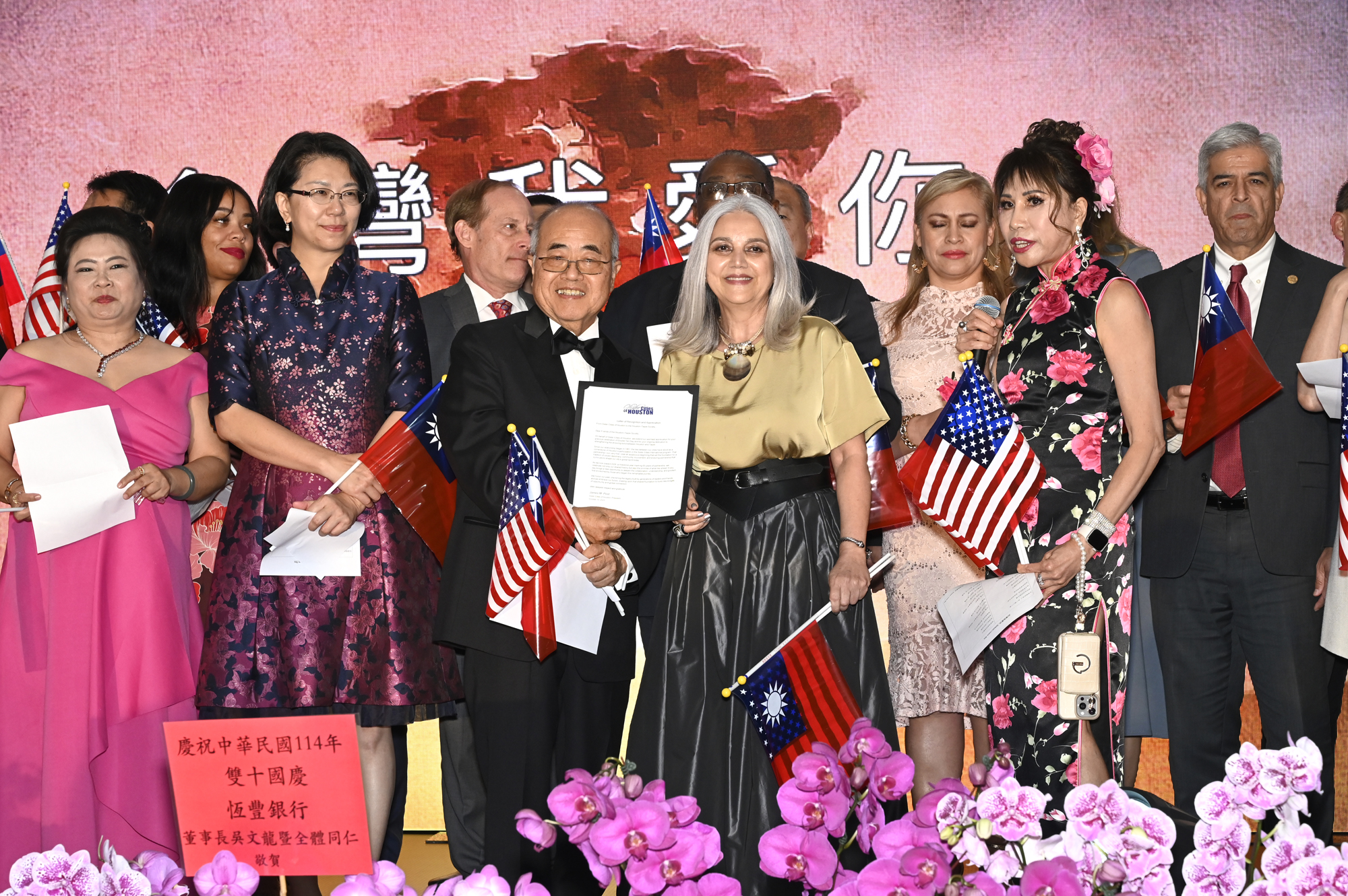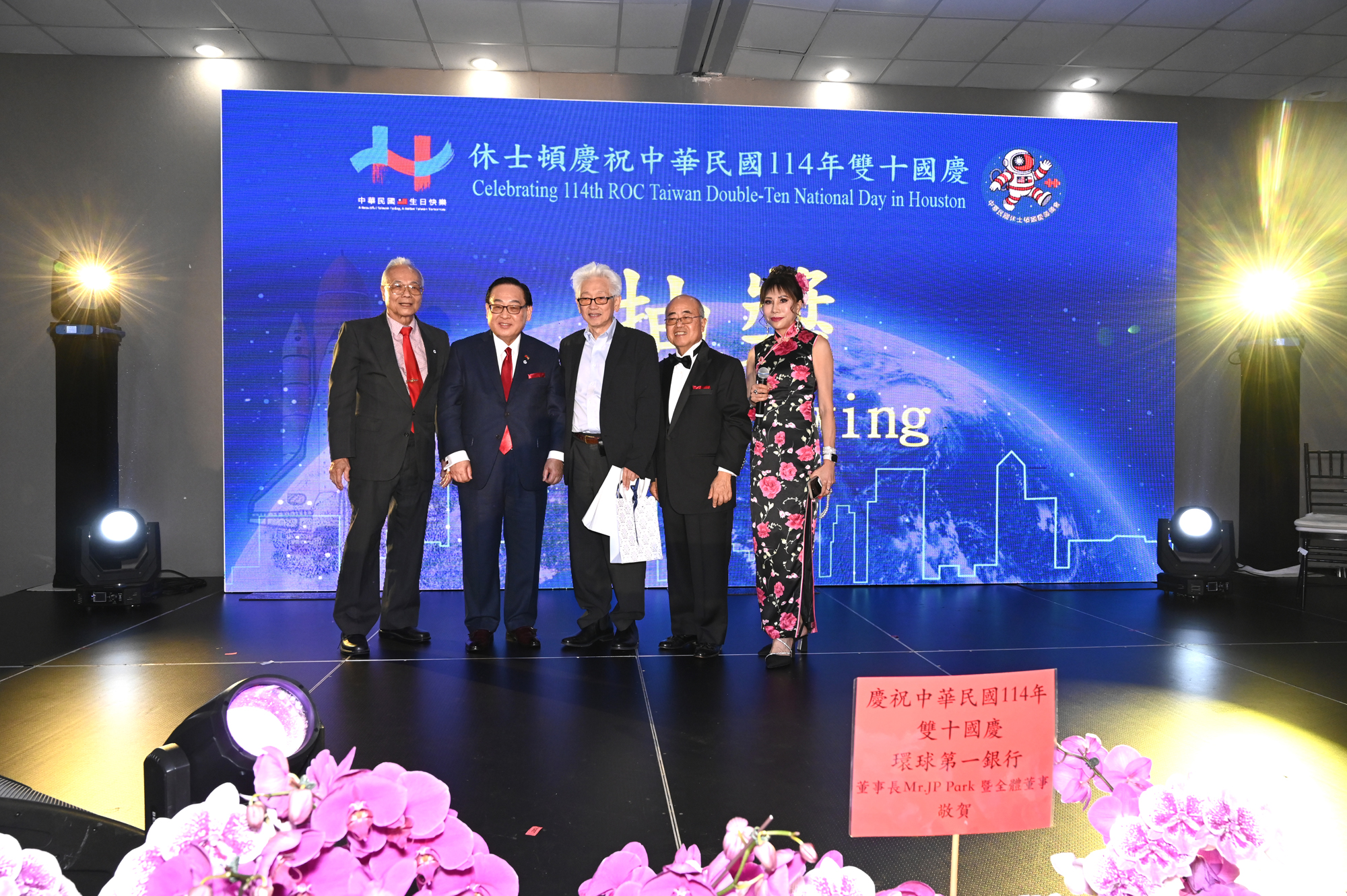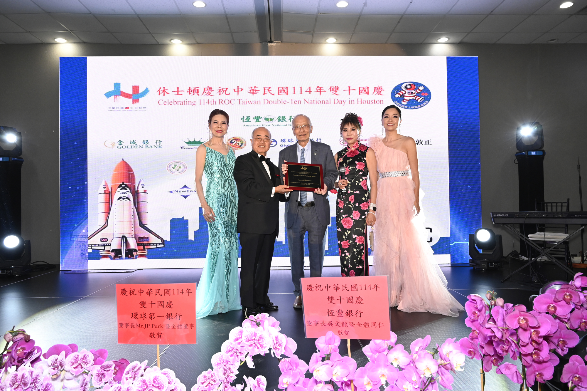 2025年國慶國慶晚宴上,蕭伊芳處長(左一)、林富桂律師(右一)陪同國慶籌備會李雄主任委員(左二)接受國會議員Al Green(右二)致贈賀狀。