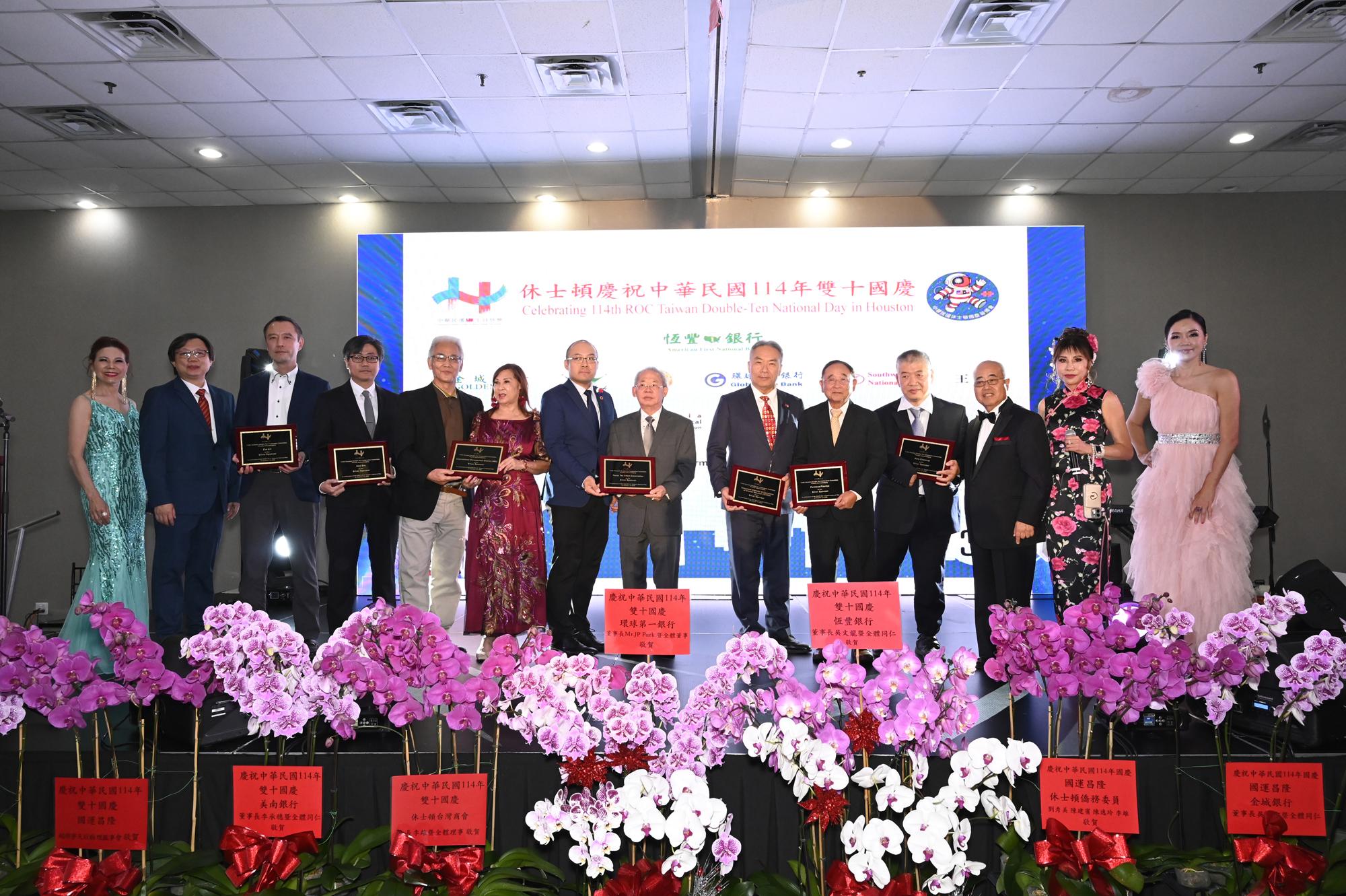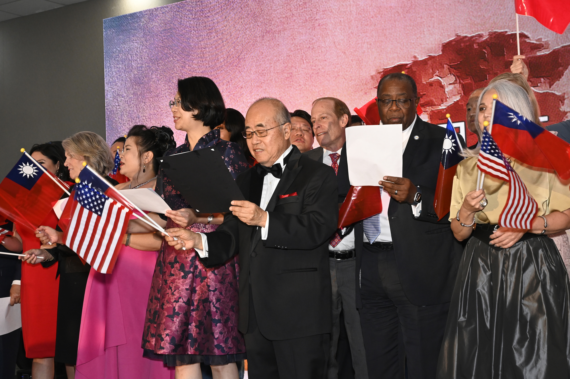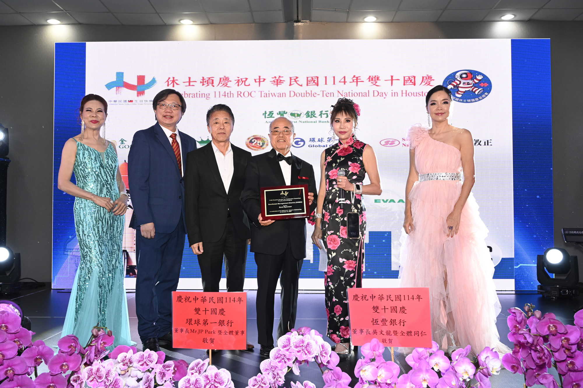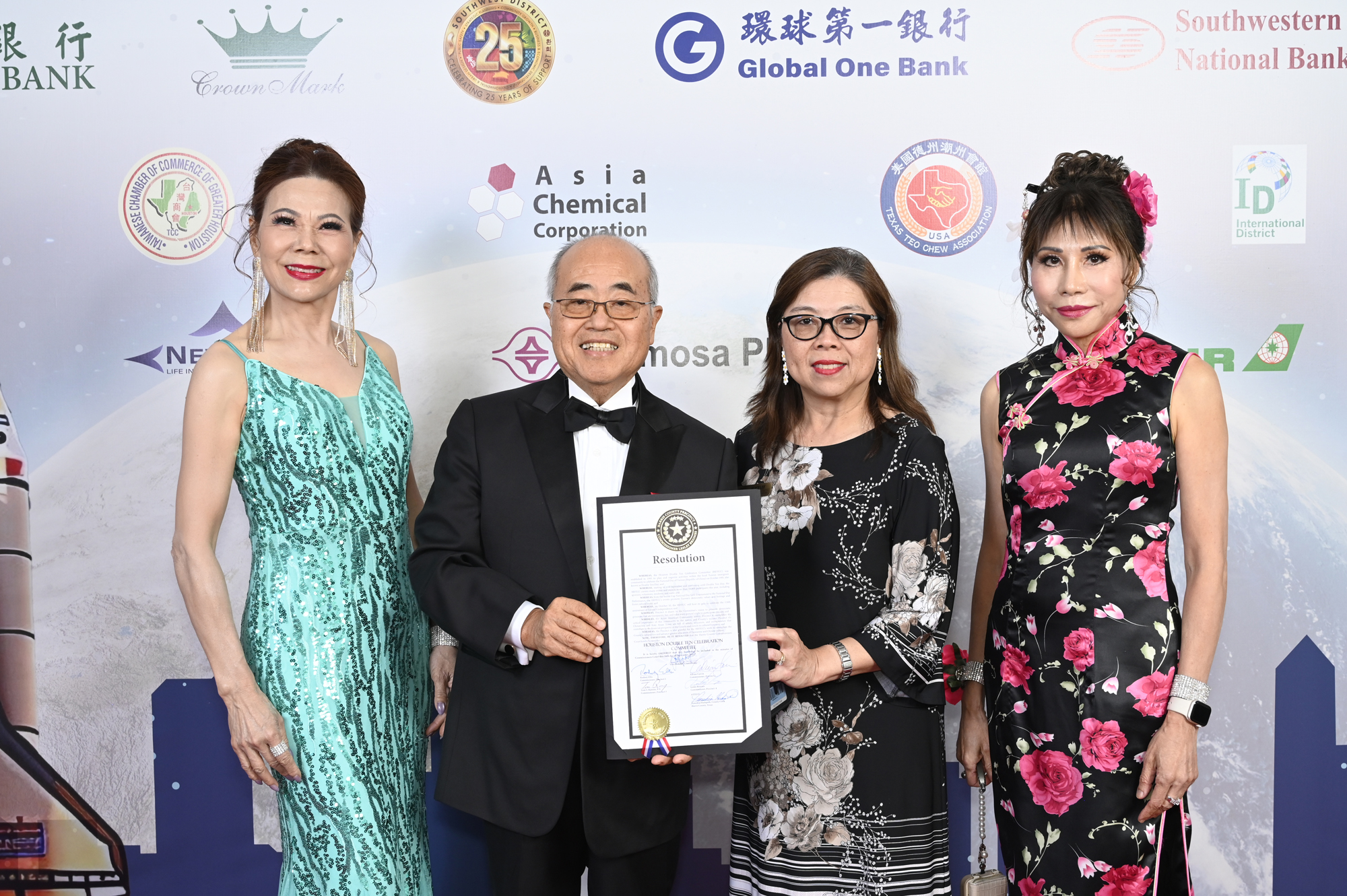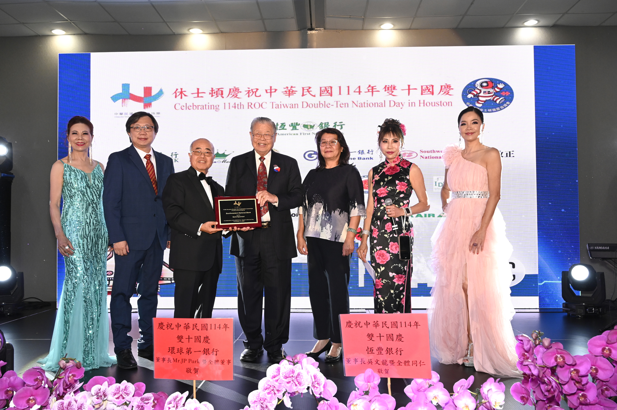 2025年國慶國慶晚宴上,蕭伊芳處長(左一)、林富桂律師(右一)陪同國慶籌備會李雄主任委員(左二)接受國會議員Al Green(右二)致贈賀狀。
