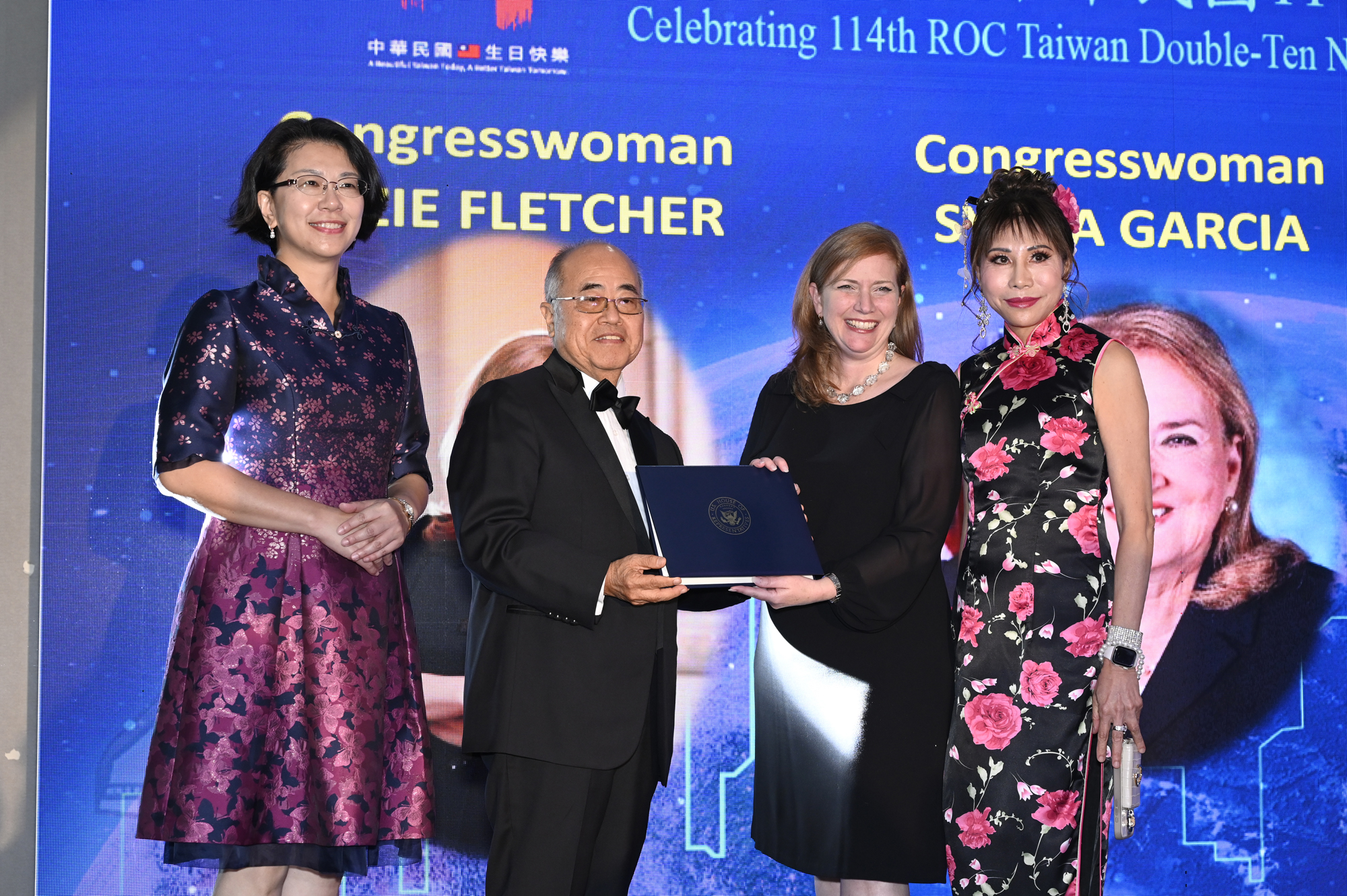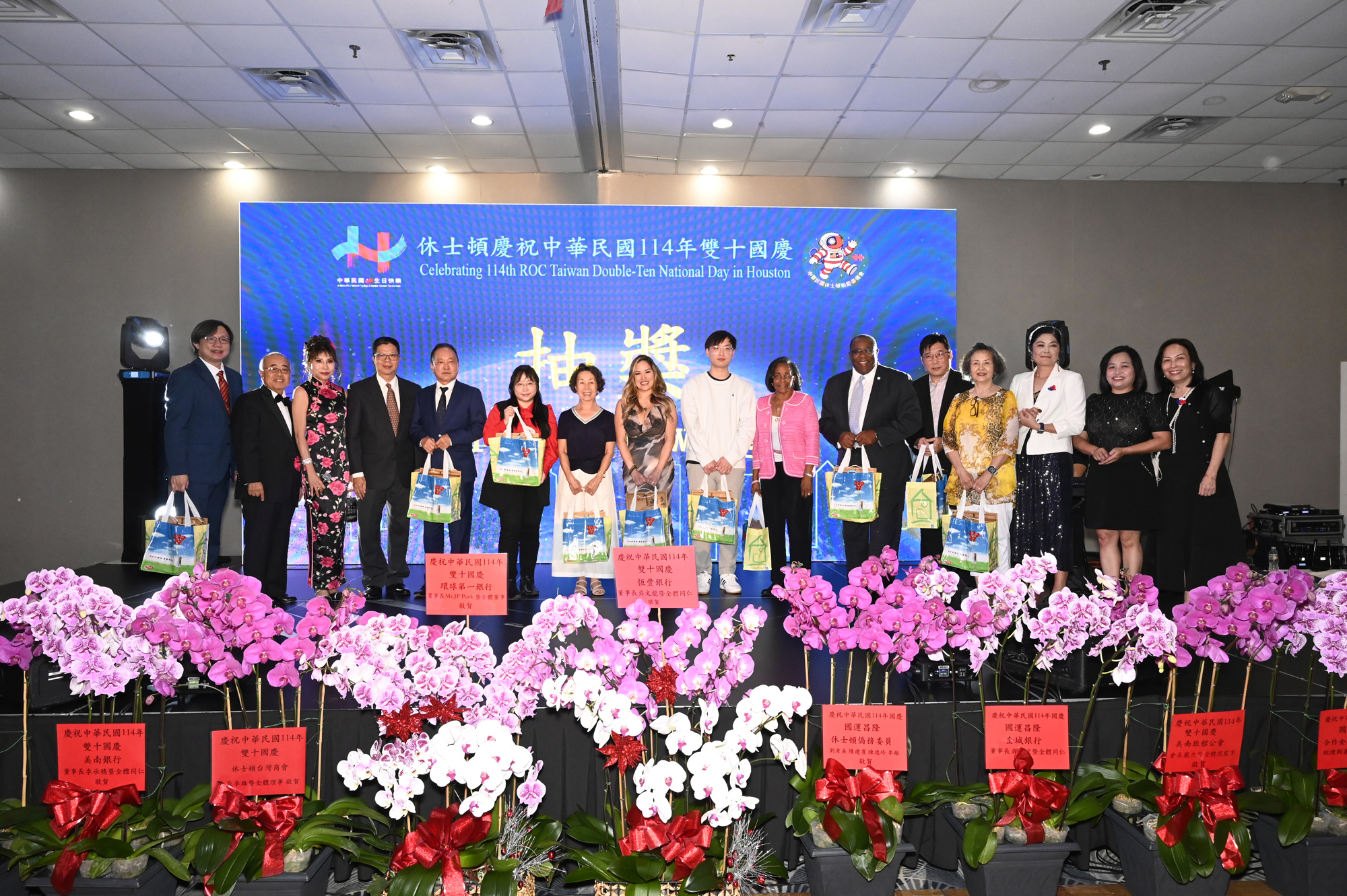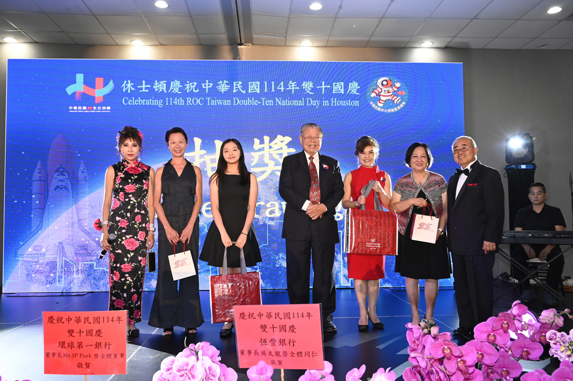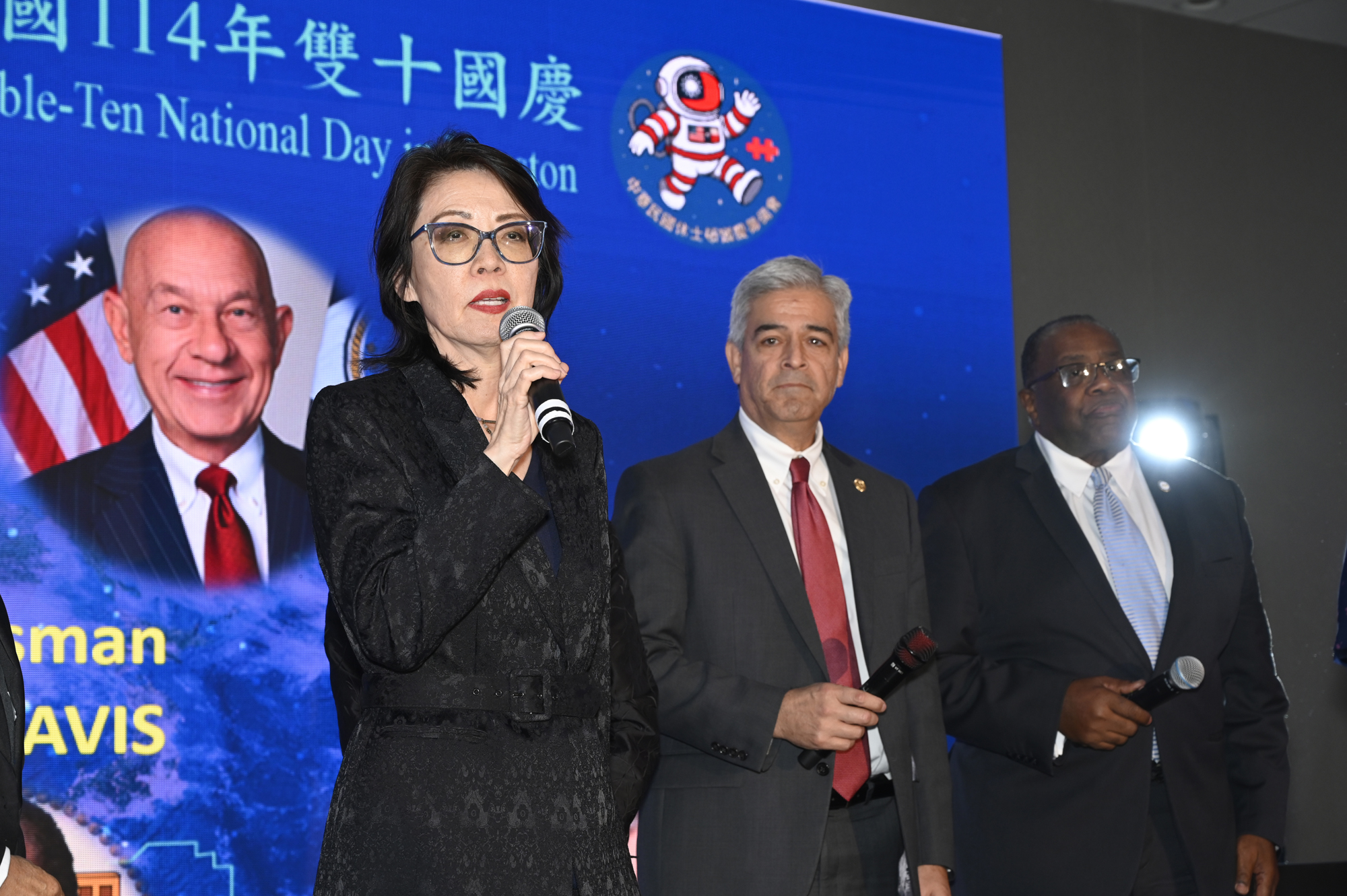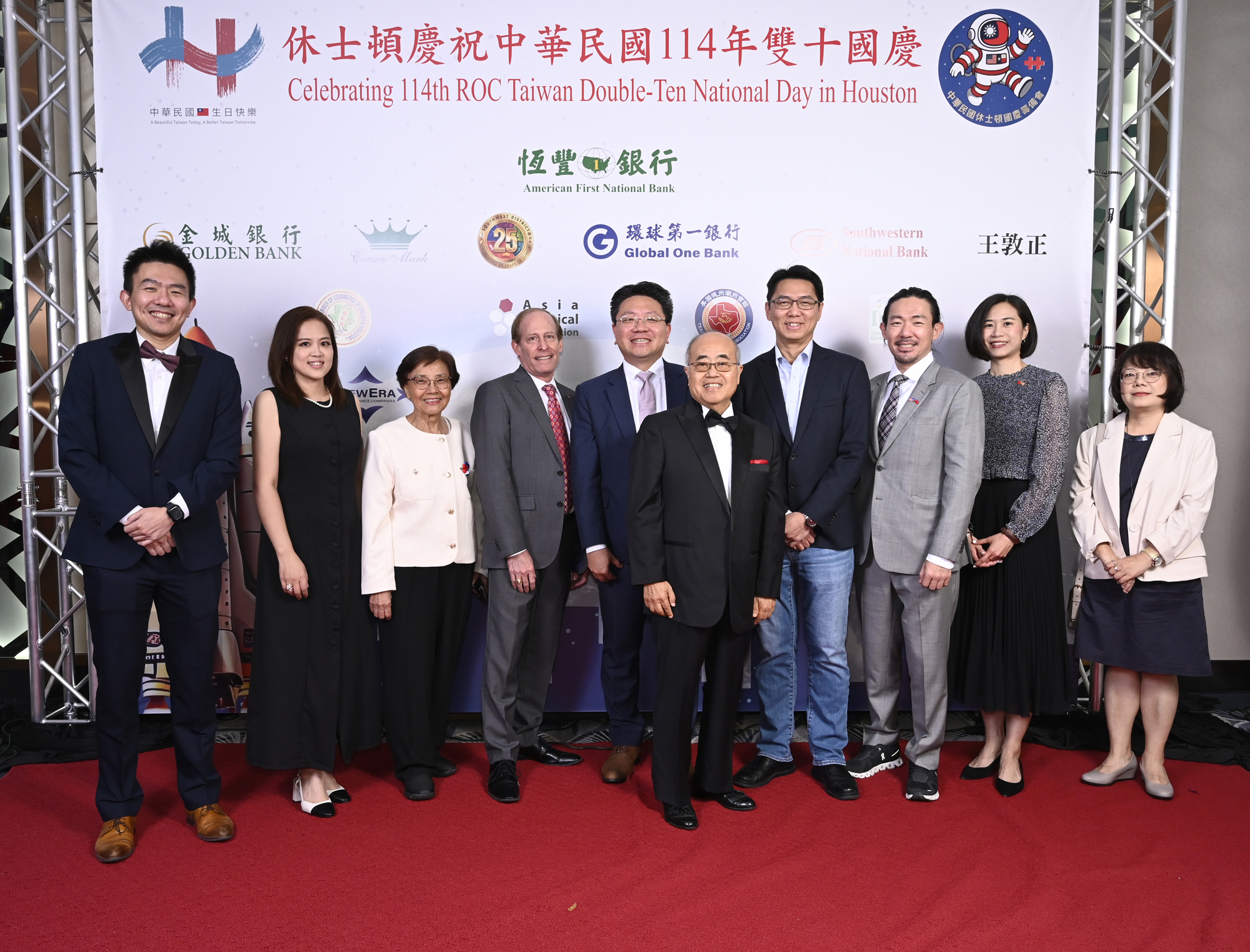 2025年國慶國慶晚宴上,蕭伊芳處長(左一)、林富桂律師(右一)陪同國慶籌備會李雄主任委員(左二)接受國會議員Al Green(右二)致贈賀狀。