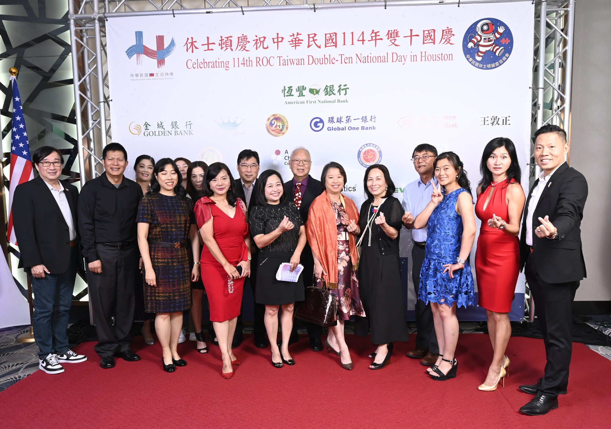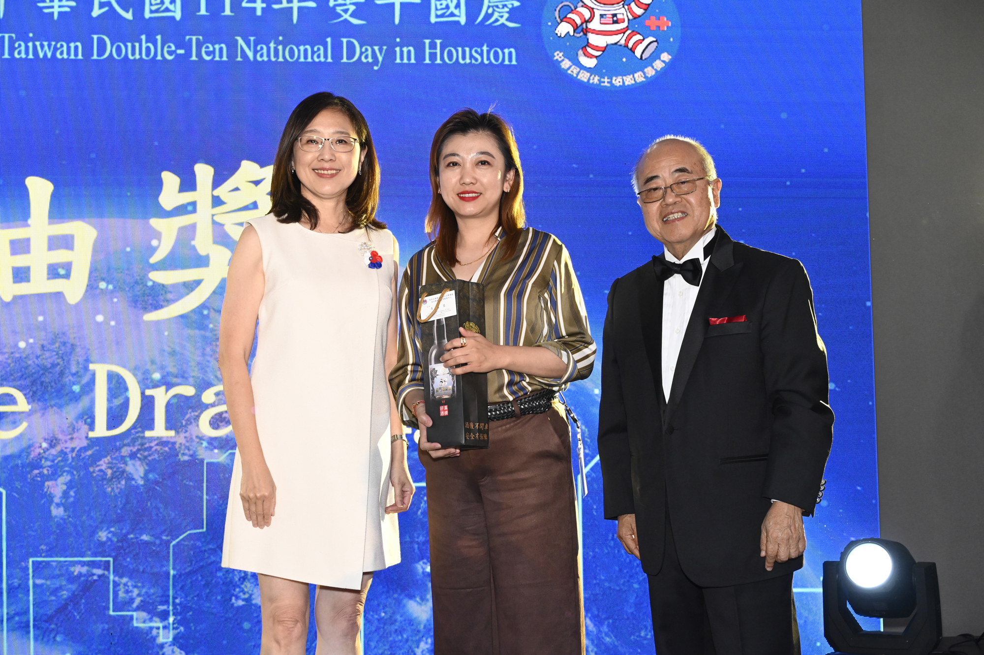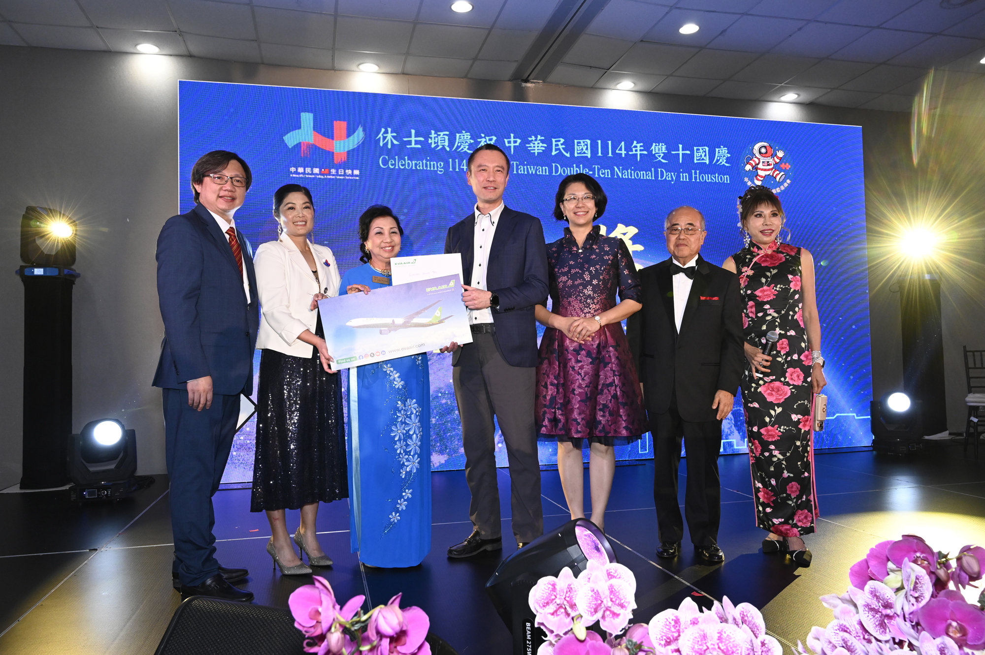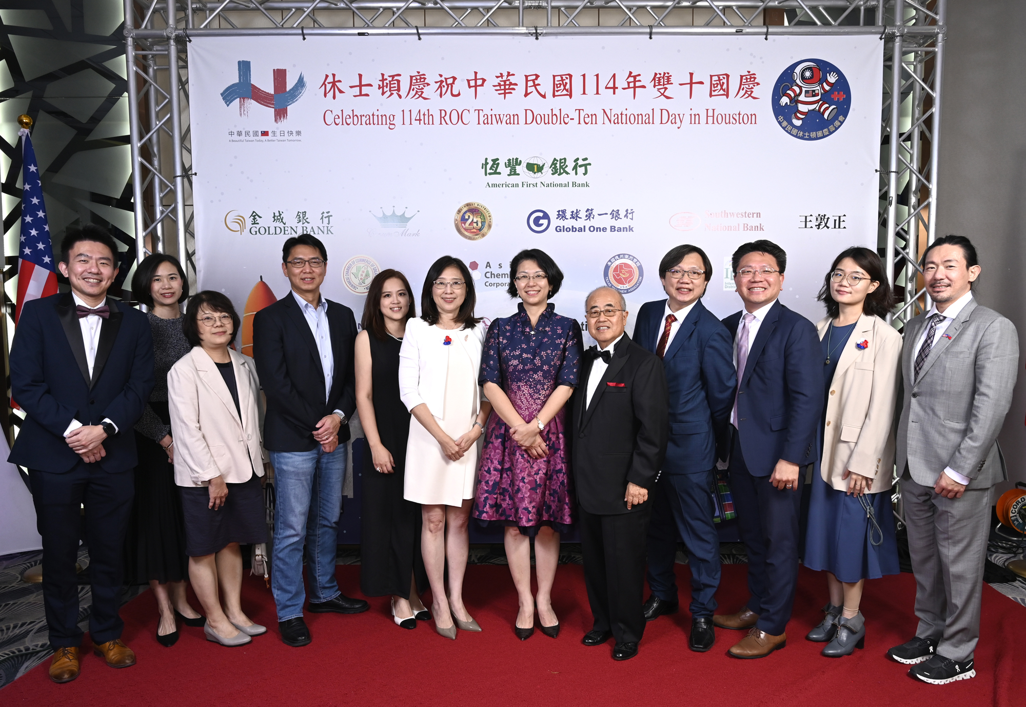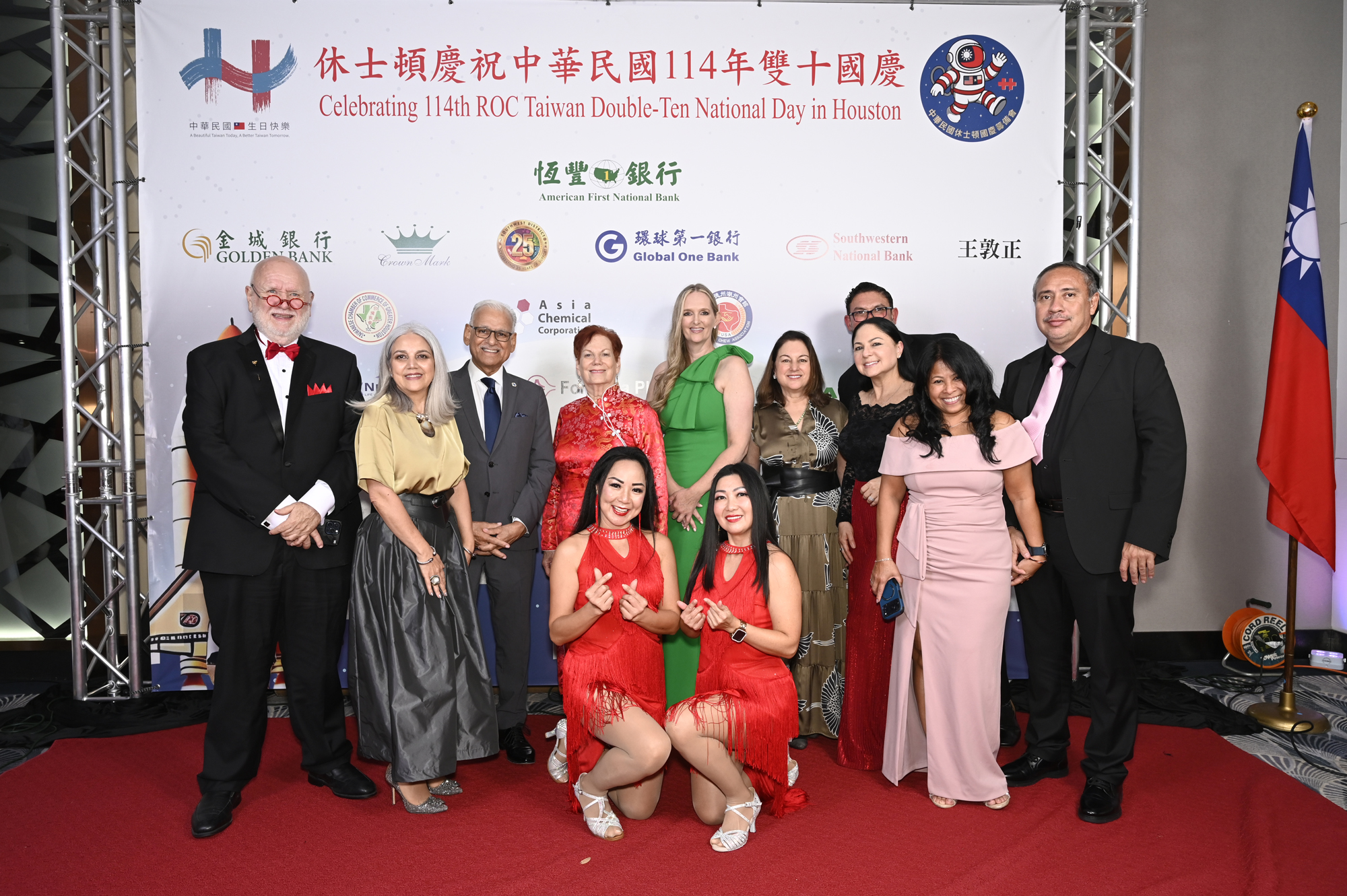 2025年國慶國慶晚宴上,蕭伊芳處長(左一)、林富桂律師(右一)陪同國慶籌備會李雄主任委員(左二)接受國會議員Al Green(右二)致贈賀狀。