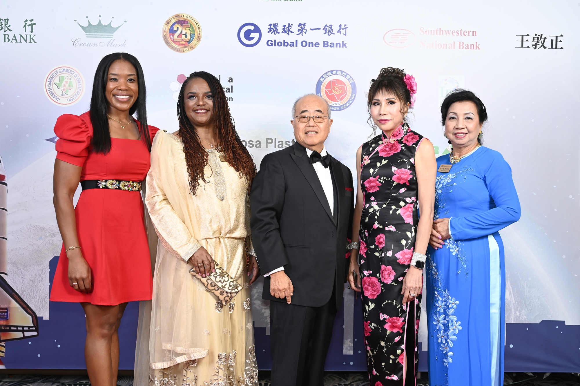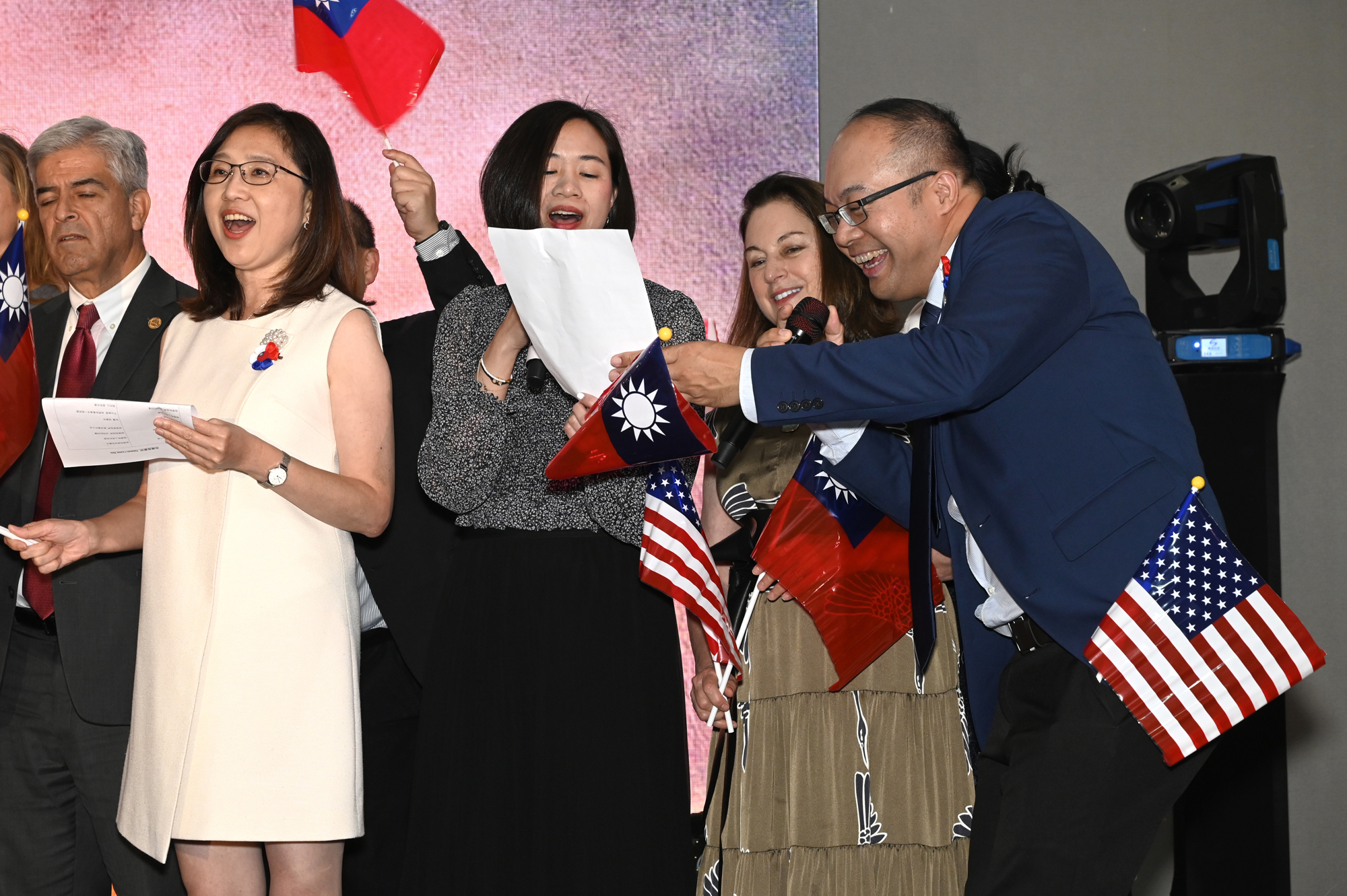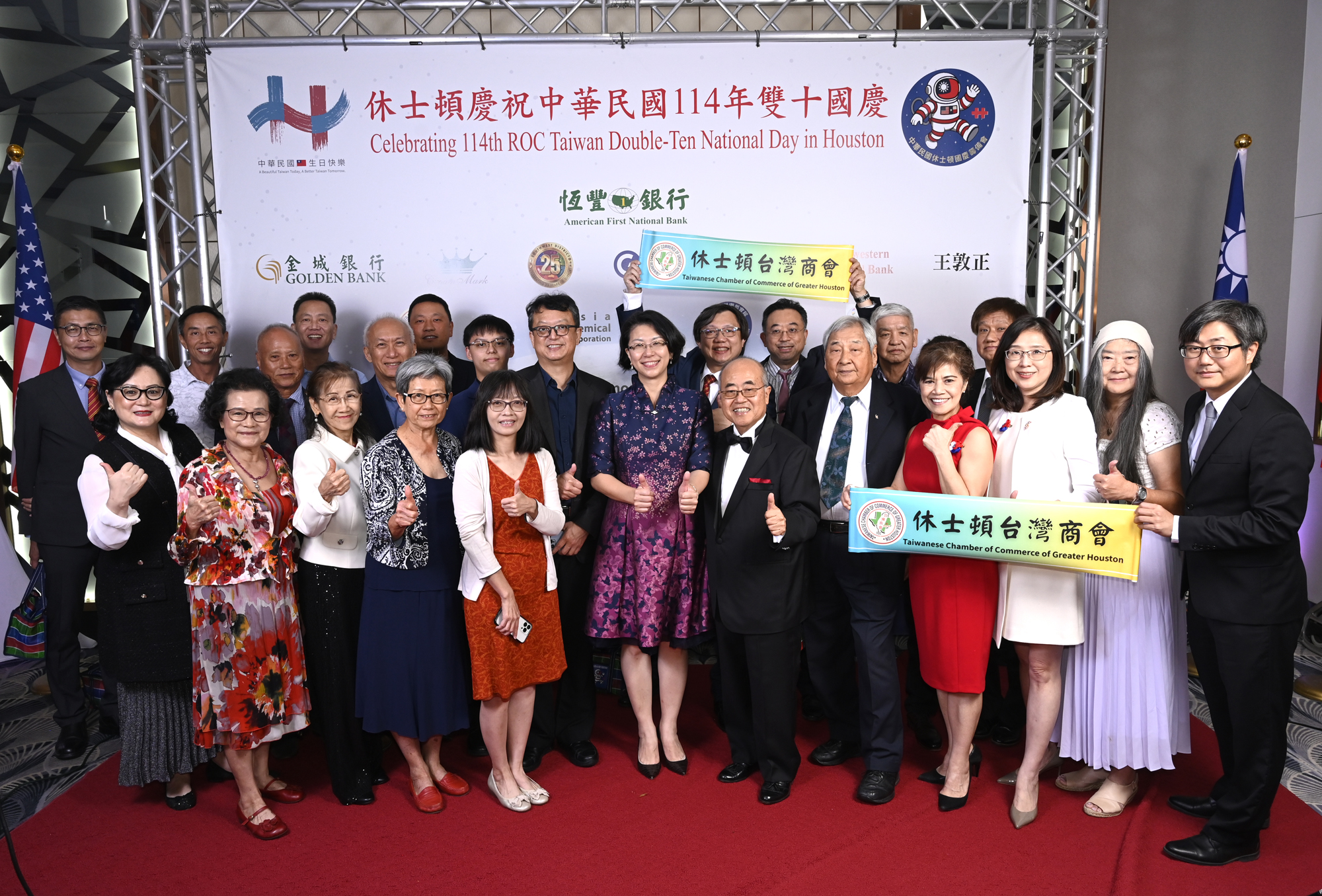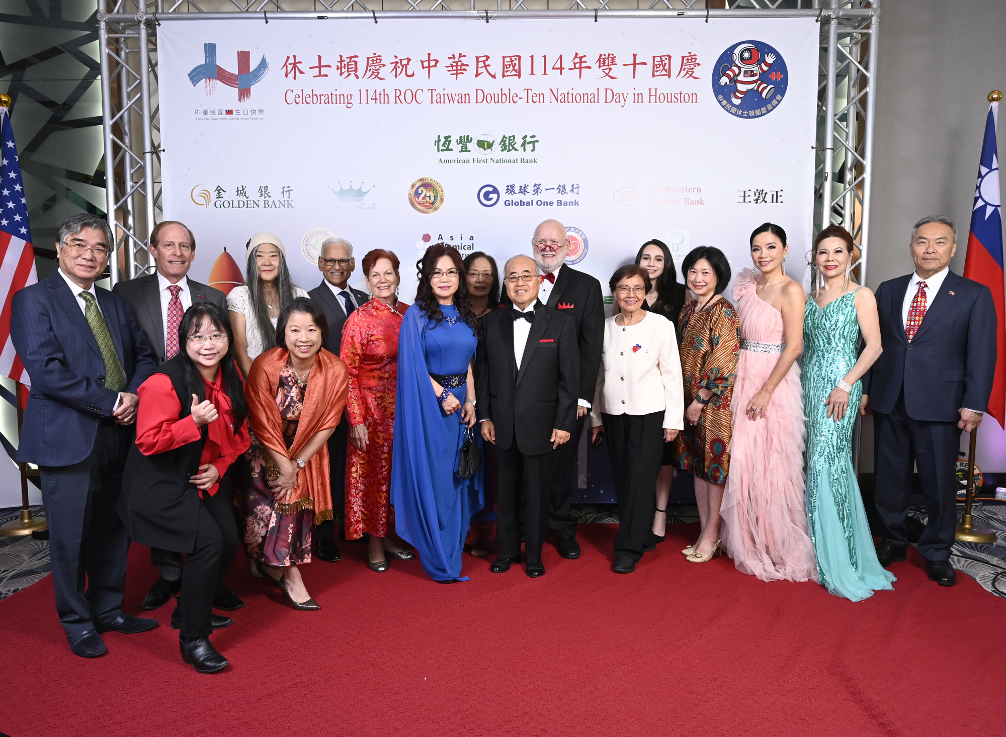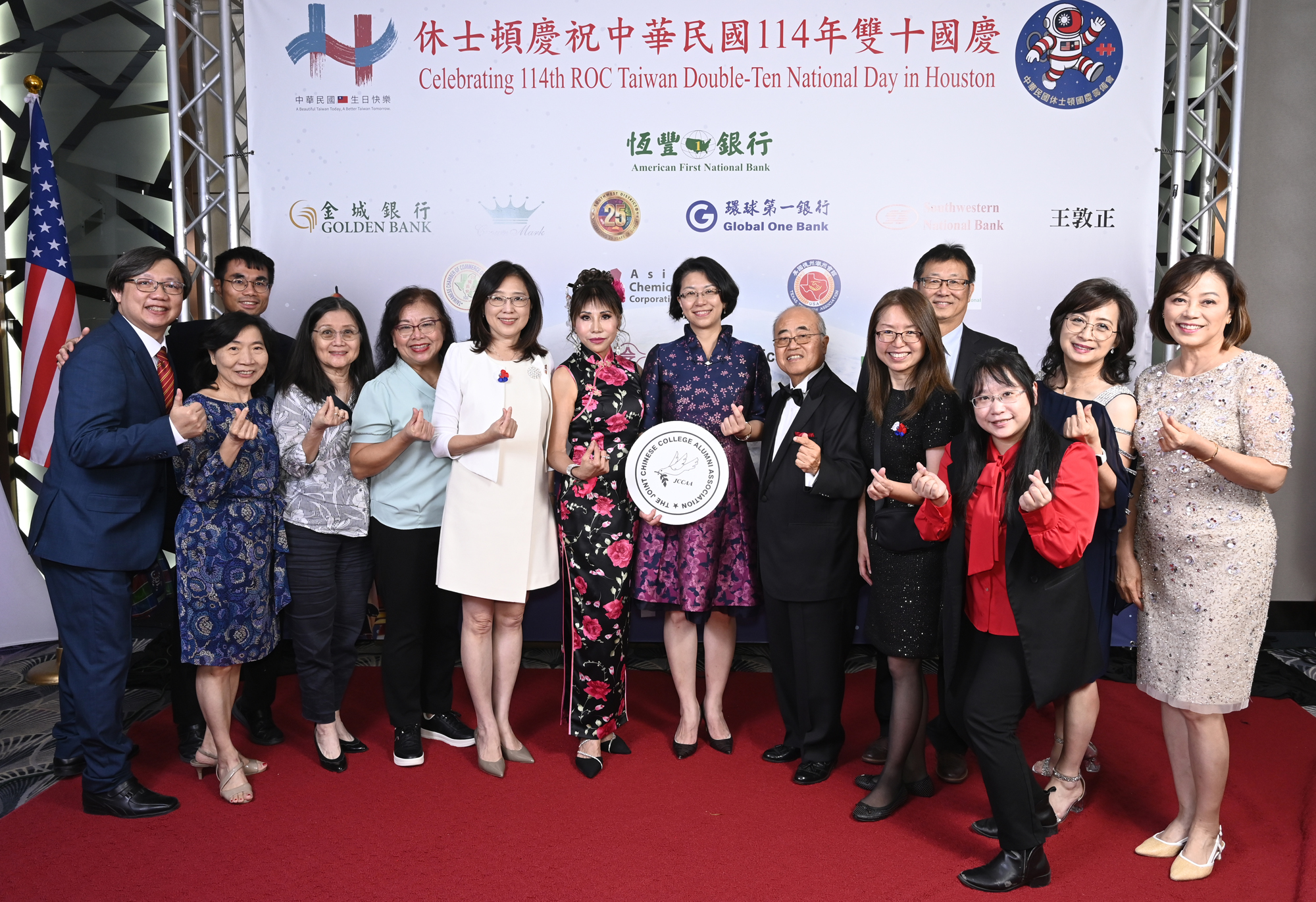 2025年國慶國慶晚宴上,蕭伊芳處長(左一)、林富桂律師(右一)陪同國慶籌備會李雄主任委員(左二)接受國會議員Al Green(右二)致贈賀狀。