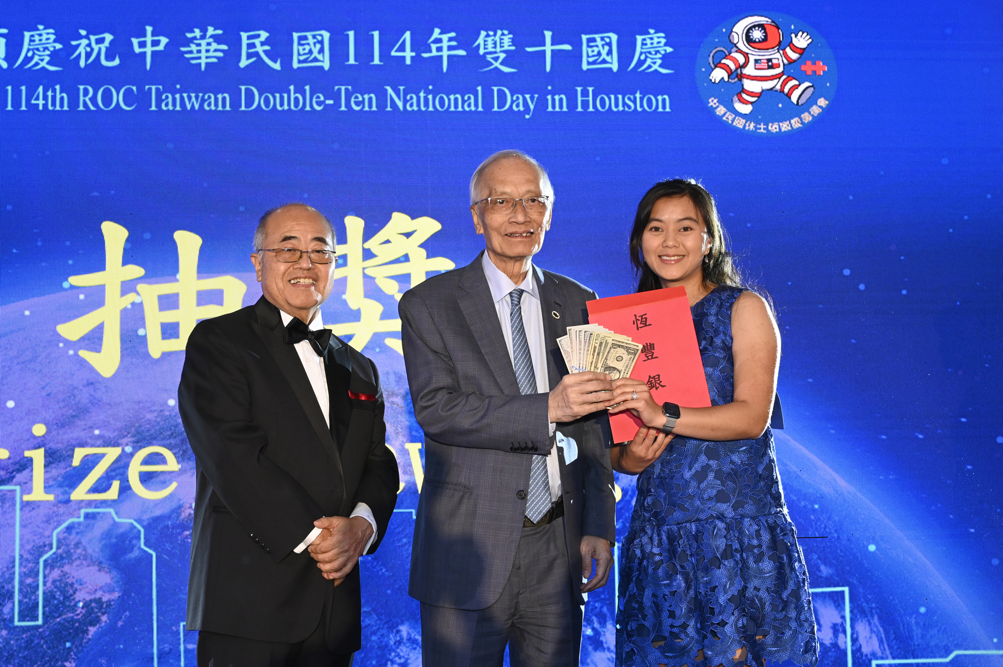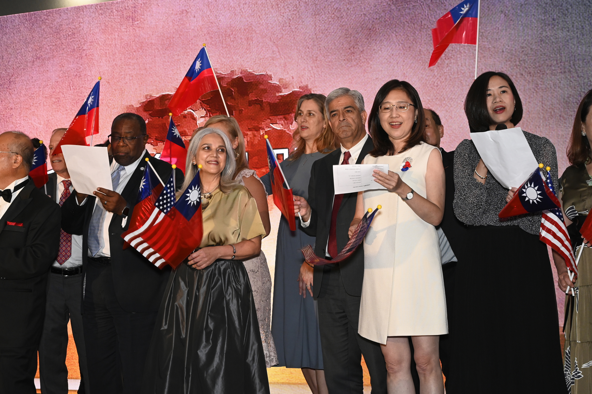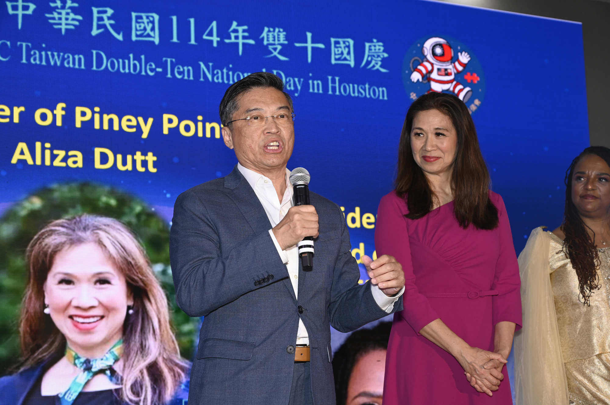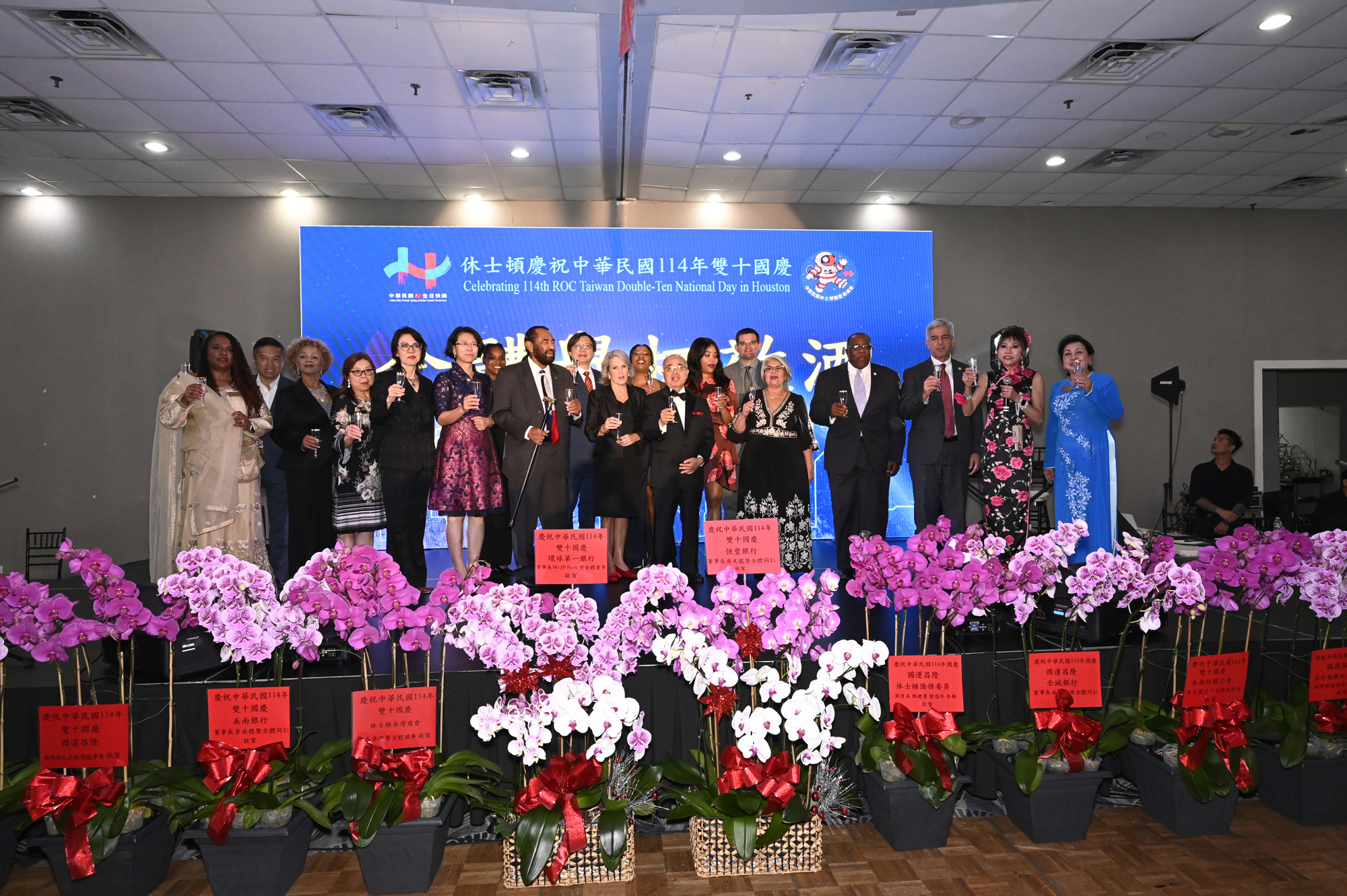 2025年國慶國慶晚宴上,蕭伊芳處長(左一)、林富桂律師(右一)陪同國慶籌備會李雄主任委員(左二)接受國會議員Al Green(右二)致贈賀狀。