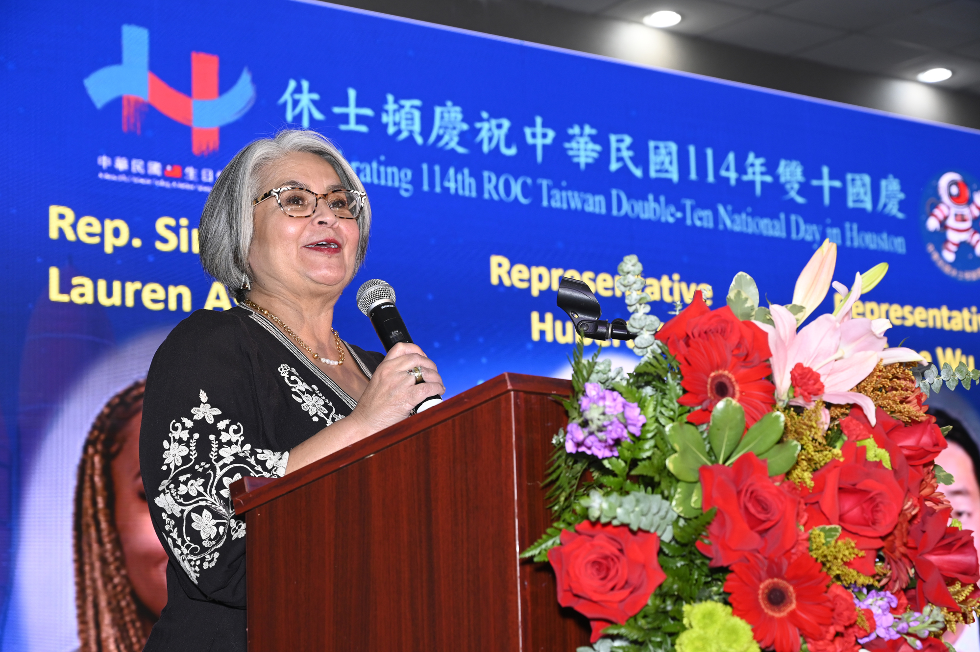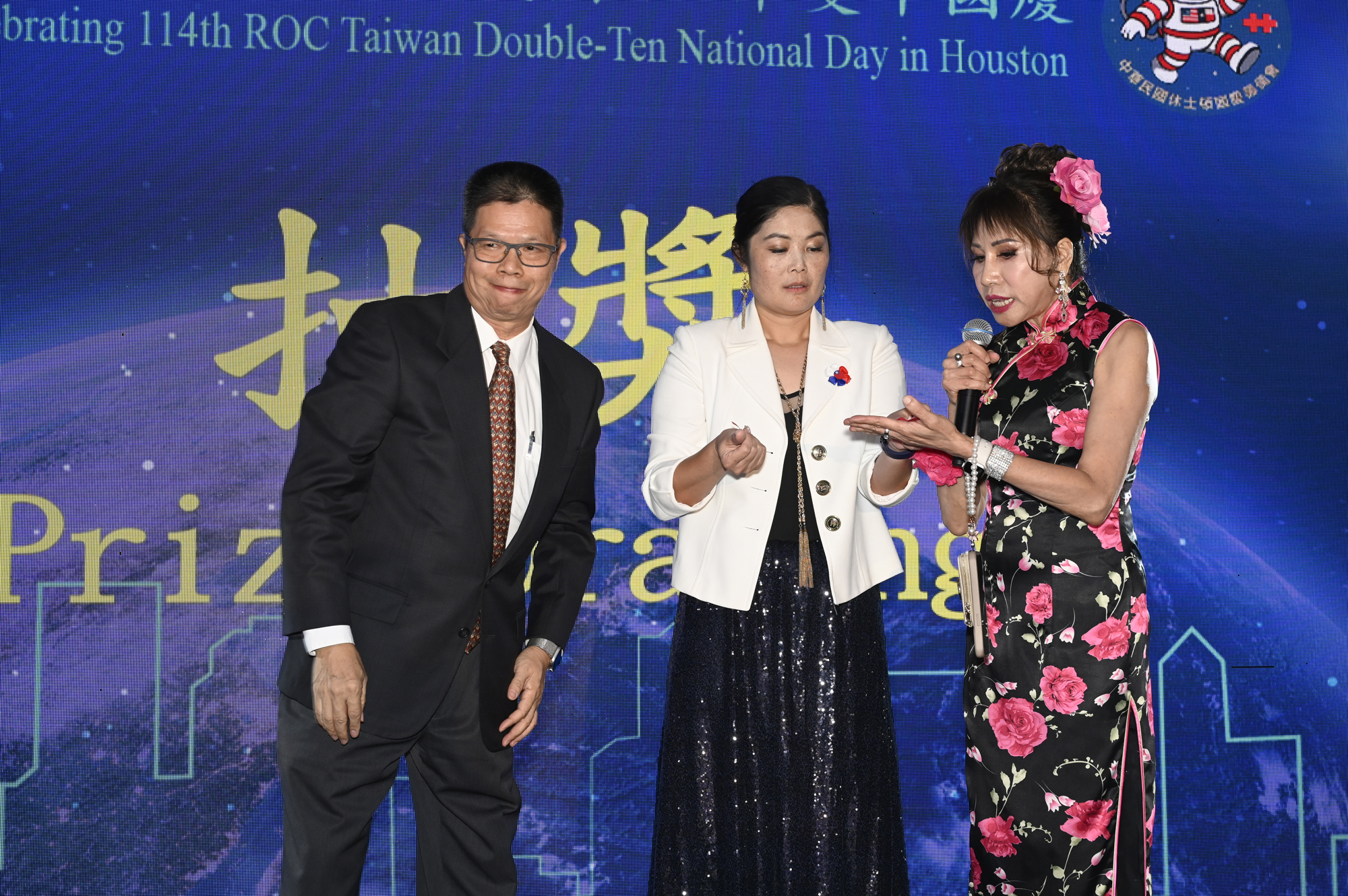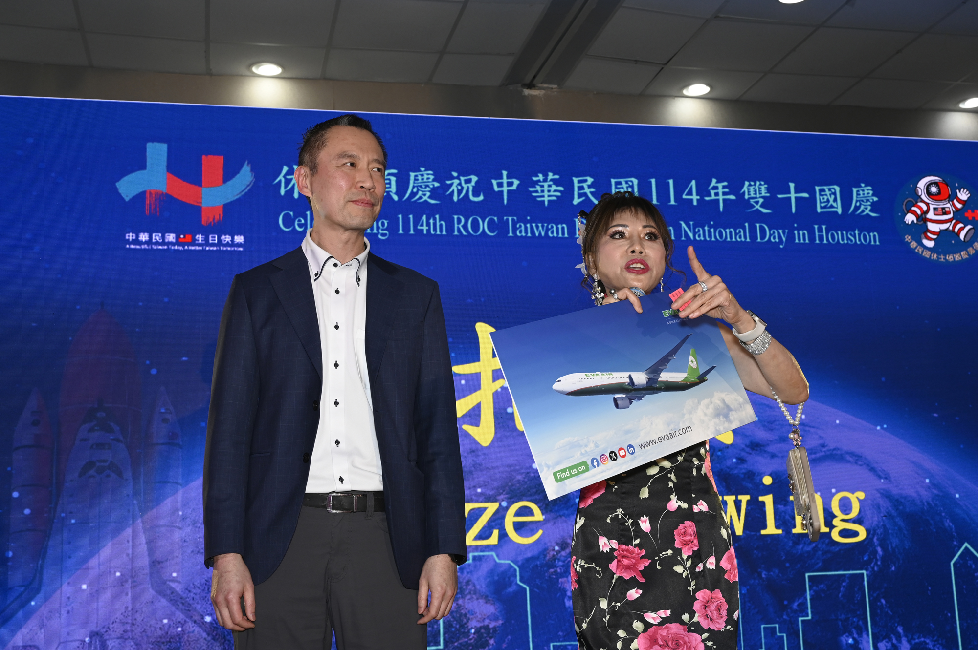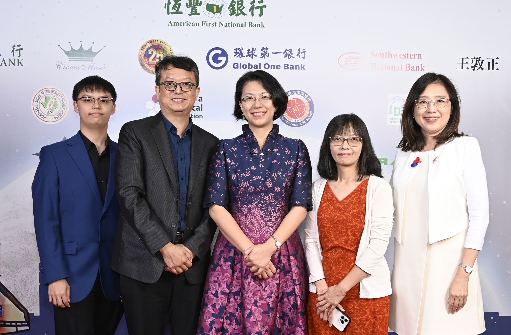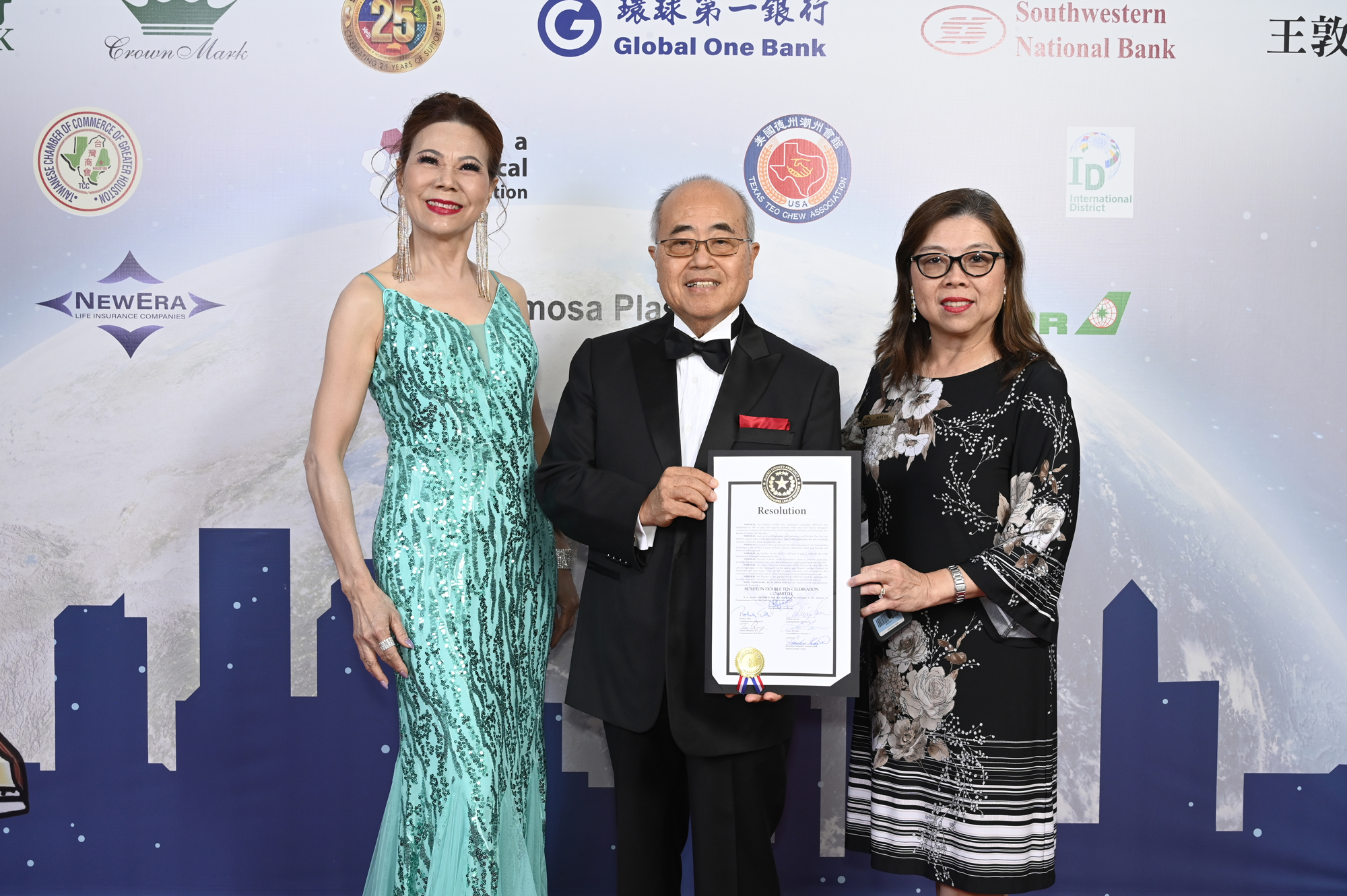2025年國慶國慶晚宴上,蕭伊芳處長(左一)、林富桂律師(右一)陪同國慶籌備會李雄主任委員(左二)接受國會議員Al Green(右二)致贈賀狀。