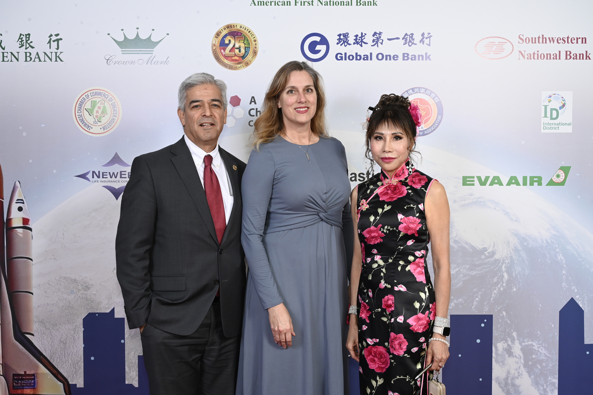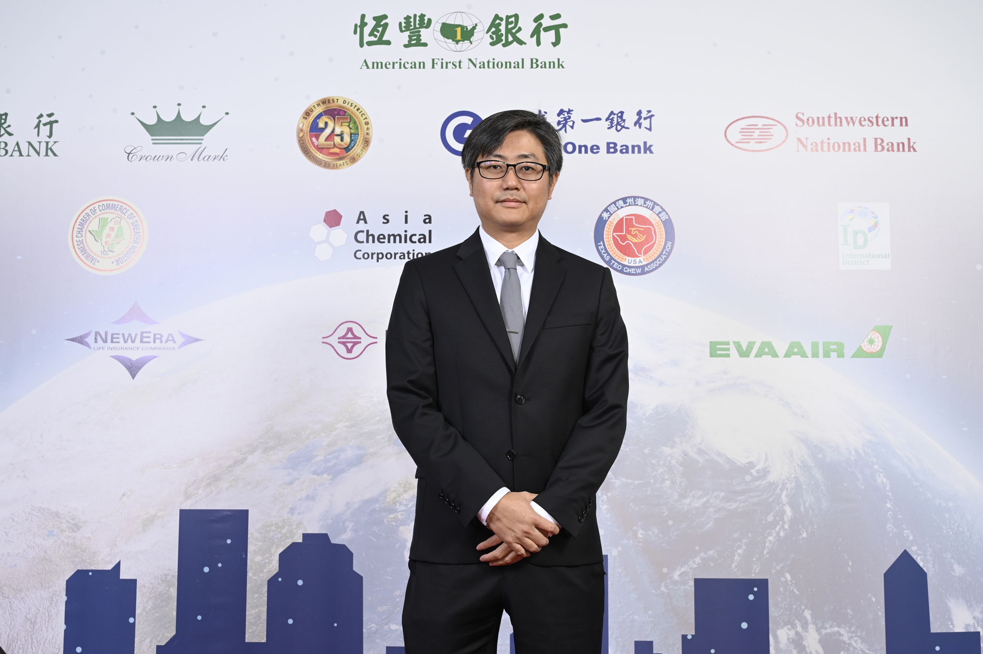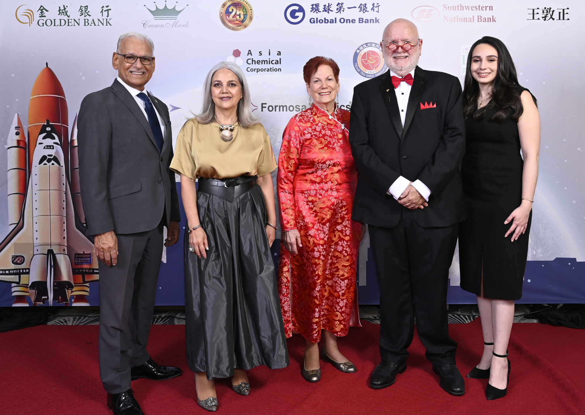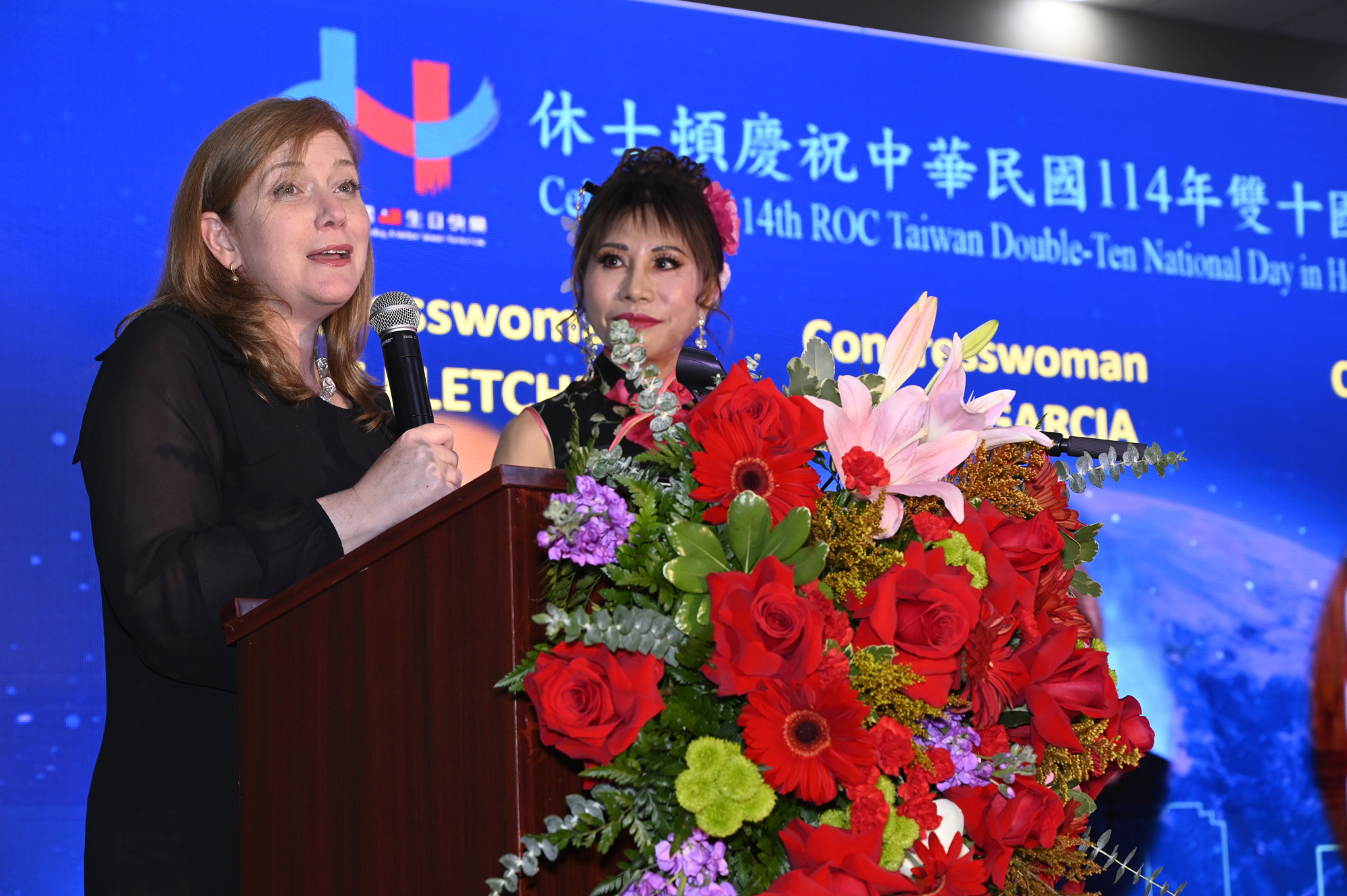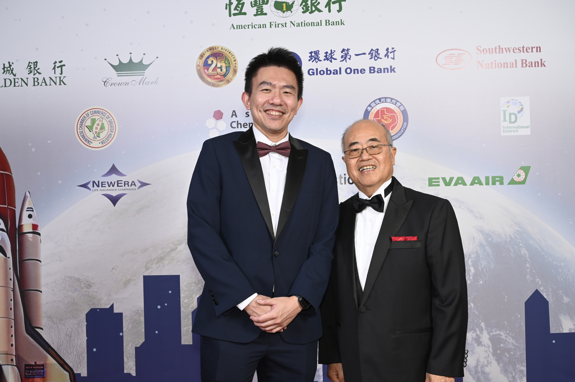 2025年國慶國慶晚宴上,蕭伊芳處長(左一)、林富桂律師(右一)陪同國慶籌備會李雄主任委員(左二)接受國會議員Al Green(右二)致贈賀狀。