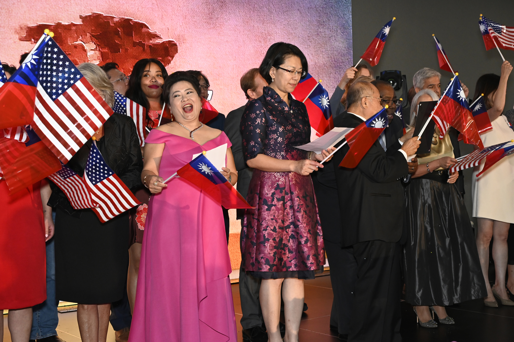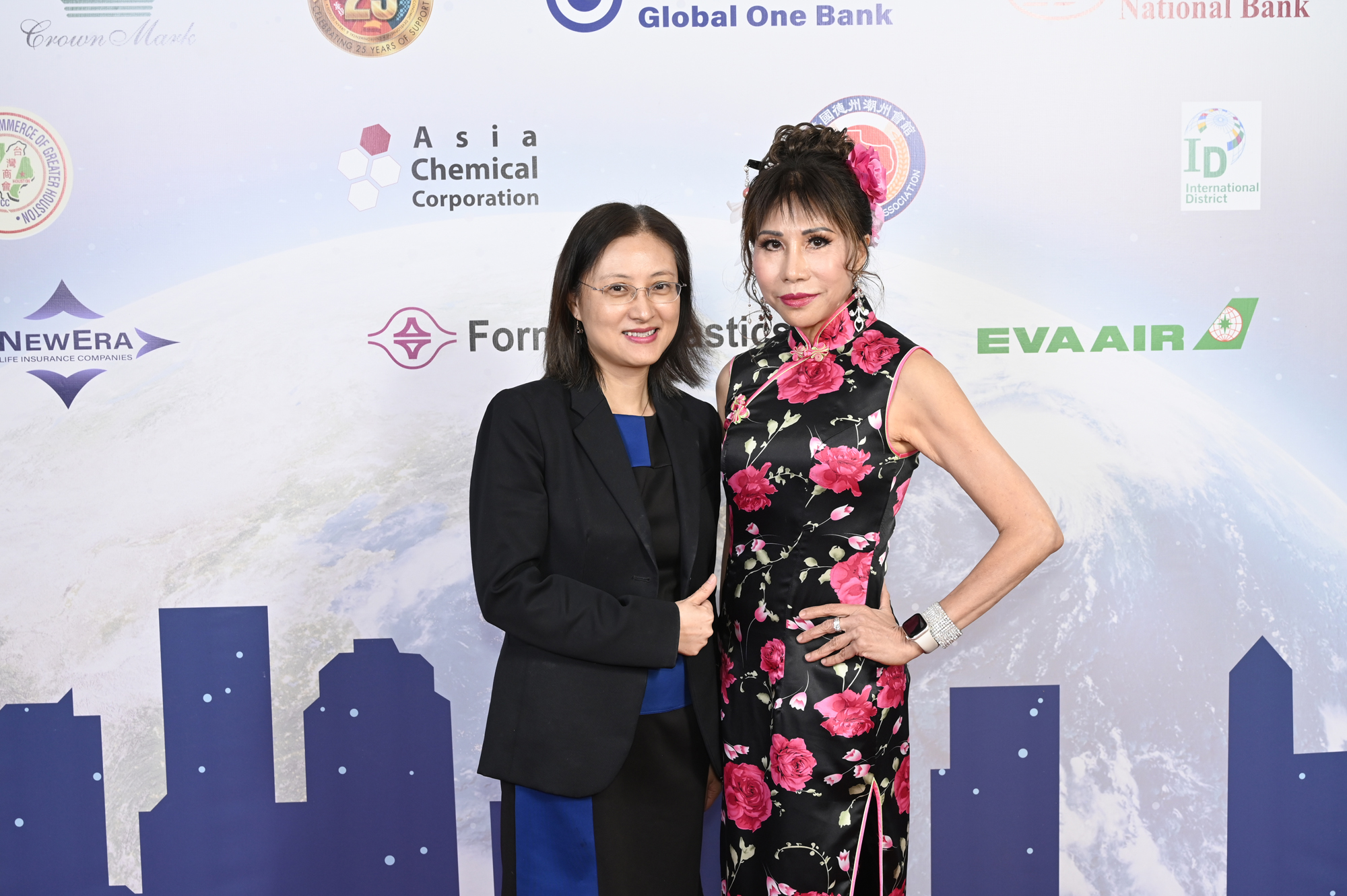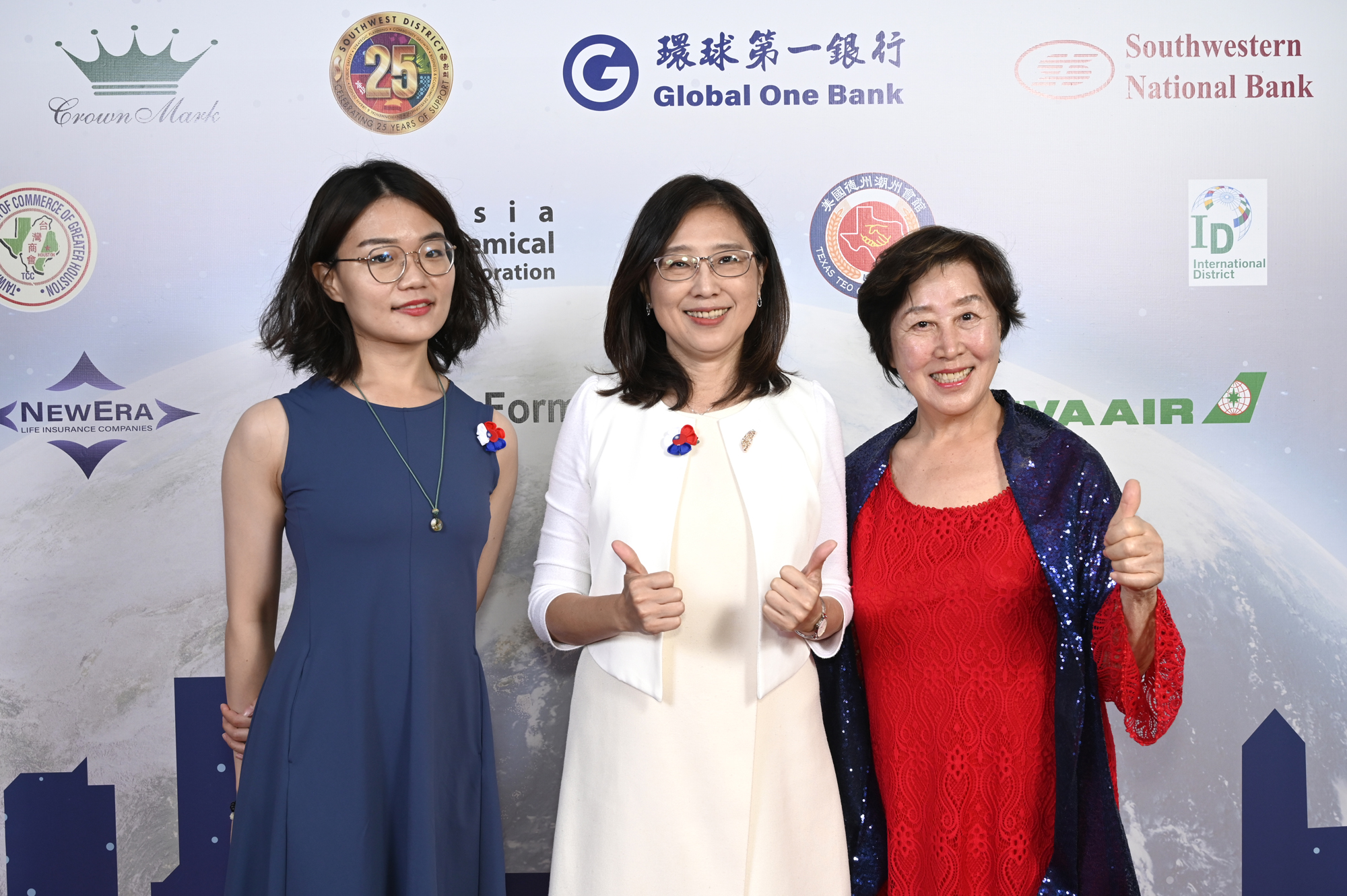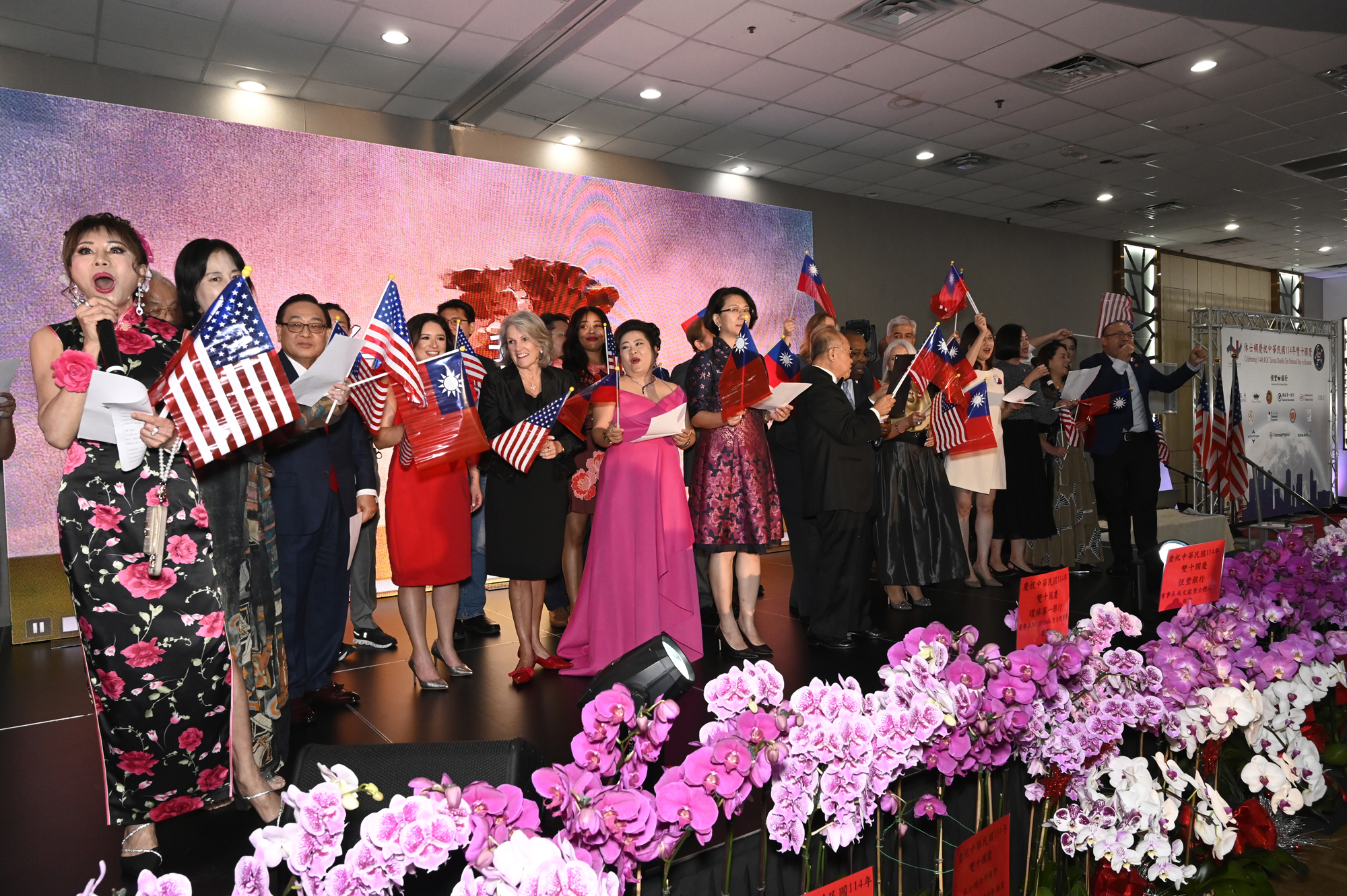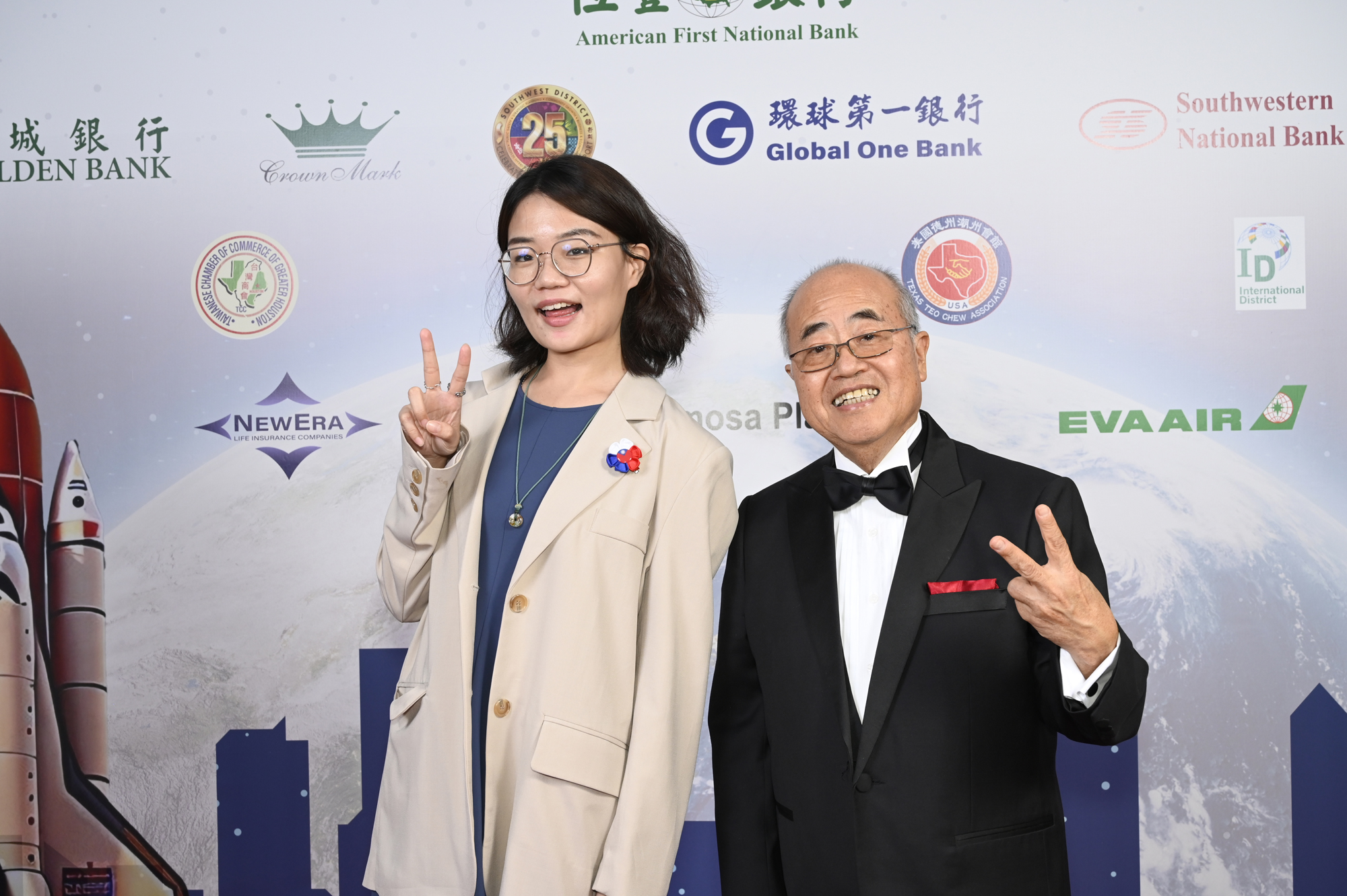 2025年國慶國慶晚宴上,蕭伊芳處長(左一)、林富桂律師(右一)陪同國慶籌備會李雄主任委員(左二)接受國會議員Al Green(右二)致贈賀狀。
