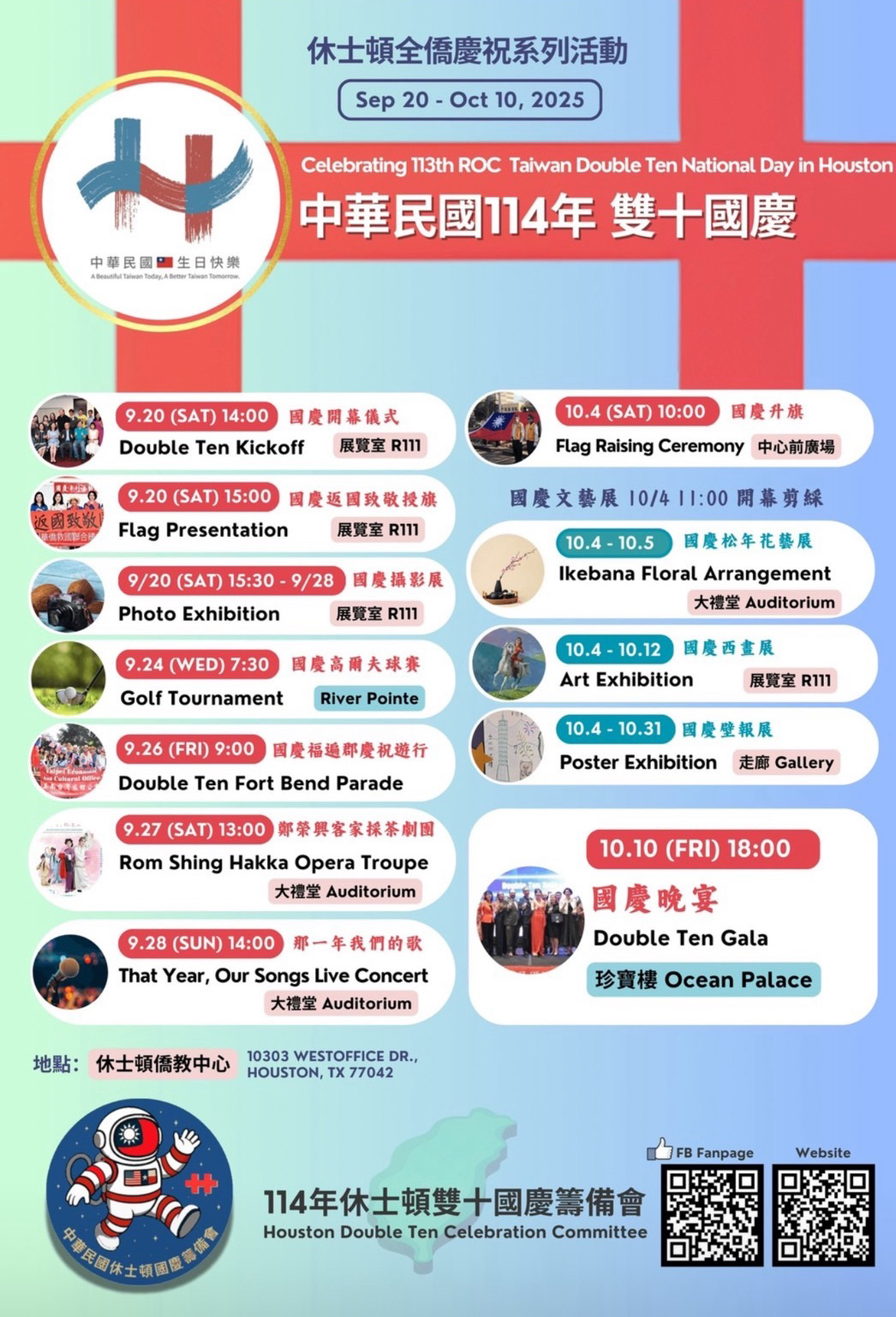 今年休士頓地區雙十國慶系列活動,將於9月20日下午2點的開幕儀式中,正式拉開序幕。僑胞將以熱情開心的心情,一起熱鬧慶祝雙十,李雄主任委員也希望這次的慶祝有您參與...