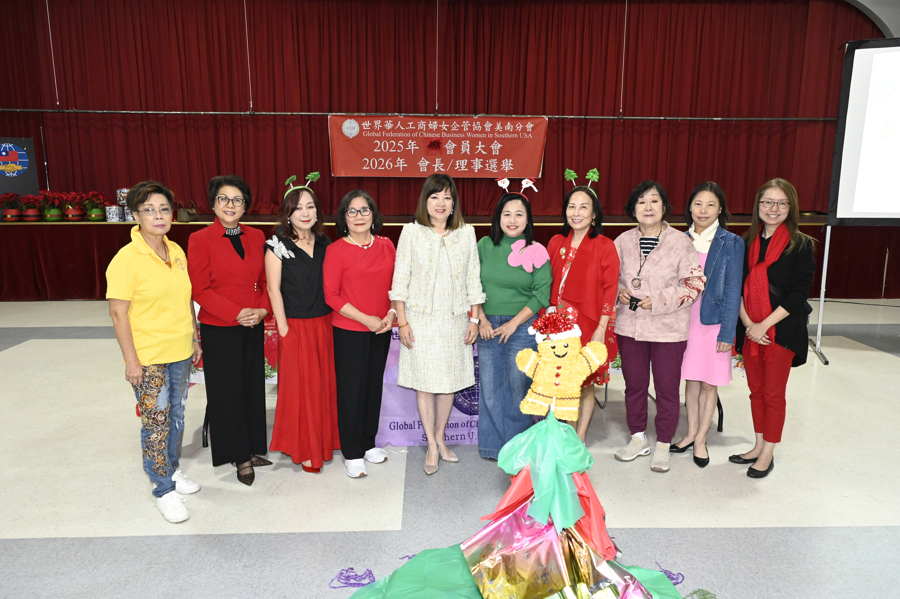 聖誕紅花加綠葉,點綴出濃濃聖誕氣氛的會場,凝聚了世華美南分會姊妹歡聚一堂,舉行重要的年度大會,讓名譽總會長黎淑瑛拋開一切,特別參加了2025年這場年終選舉大會(名譽總會長黎淑瑛致詞 會長裴俊莉感謝講話 全體合唱會歌)。