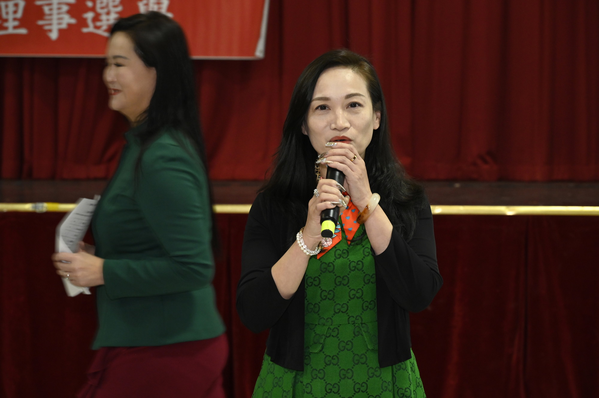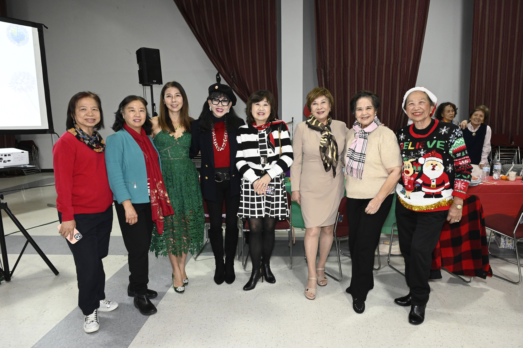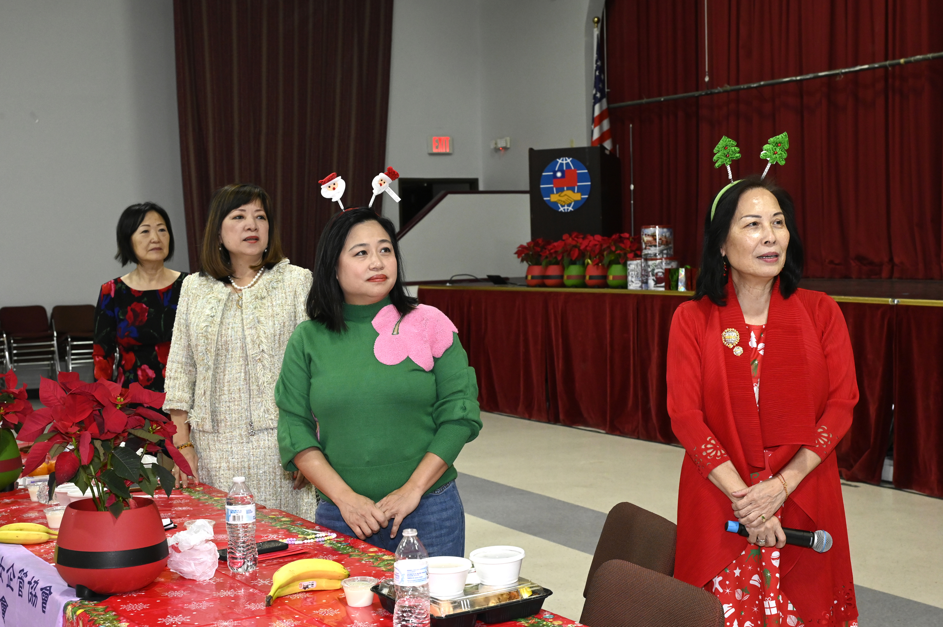 2025年世華美南分會年終理事選舉上唱會歌,右起何真前會長、裴俊莉會長、黎淑瑛名譽總會長、張文華前會長。