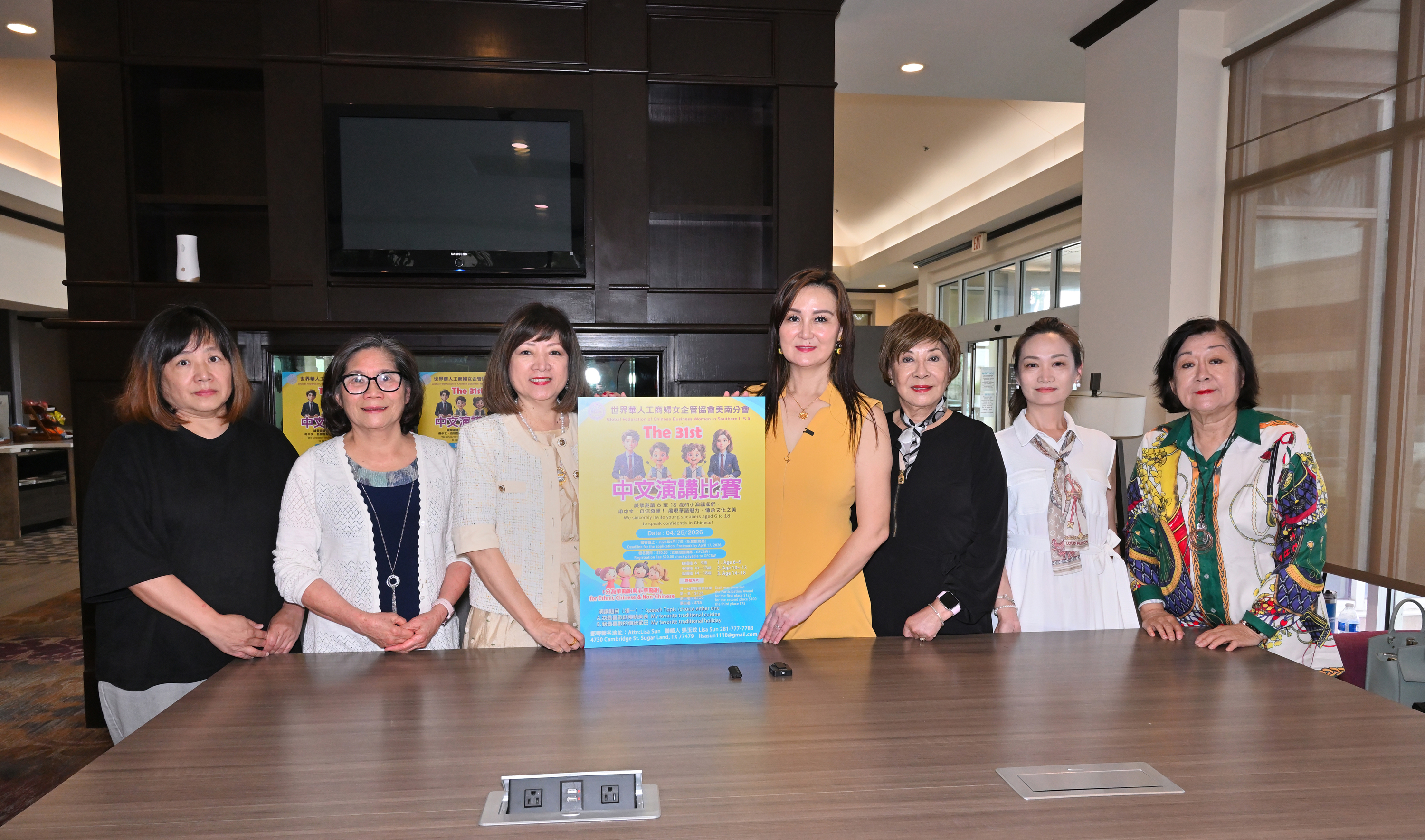 2026年世華美南分會為中文演講比賽舉行了一場記者發布會,出席人員合影,左起盧淑君