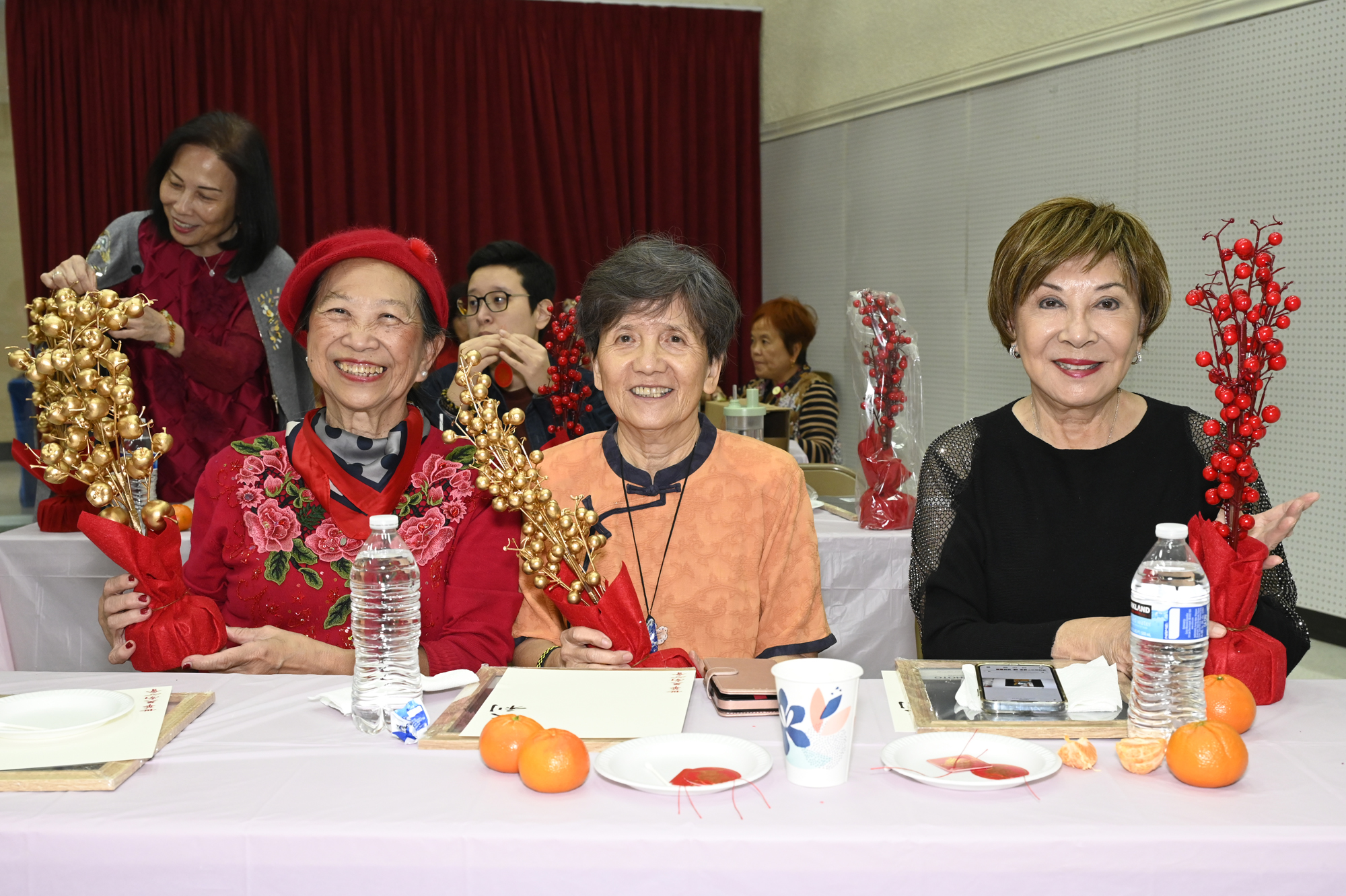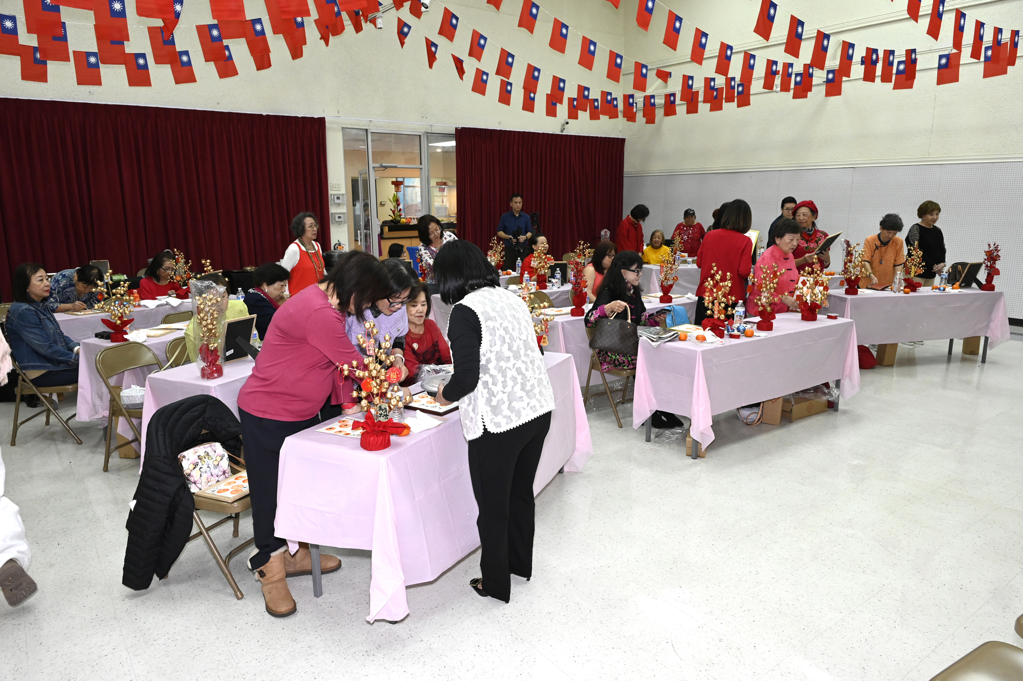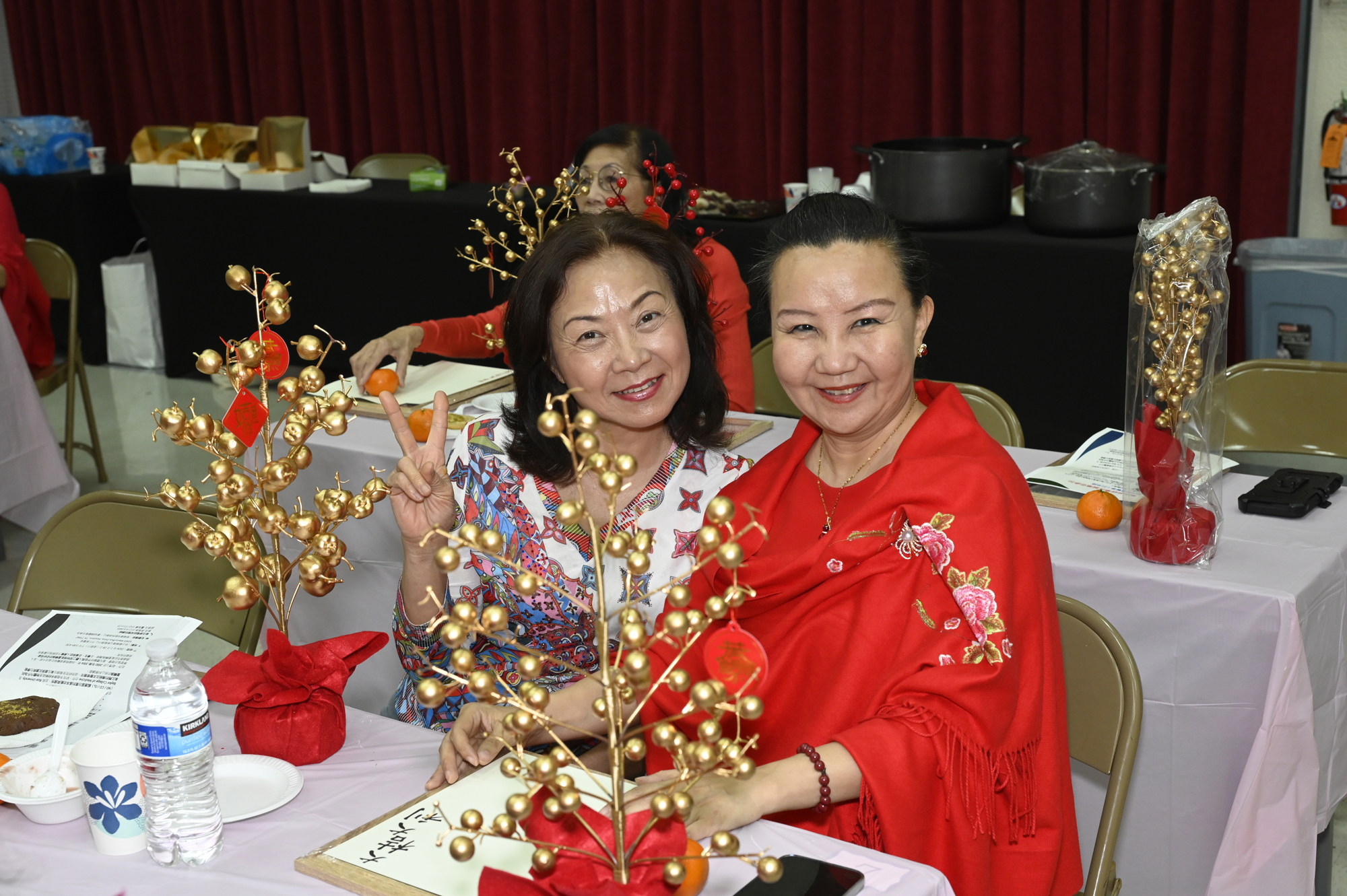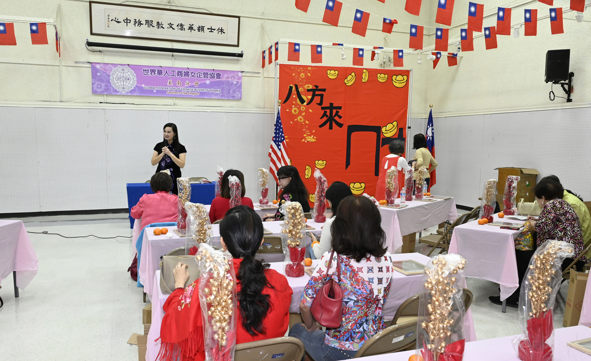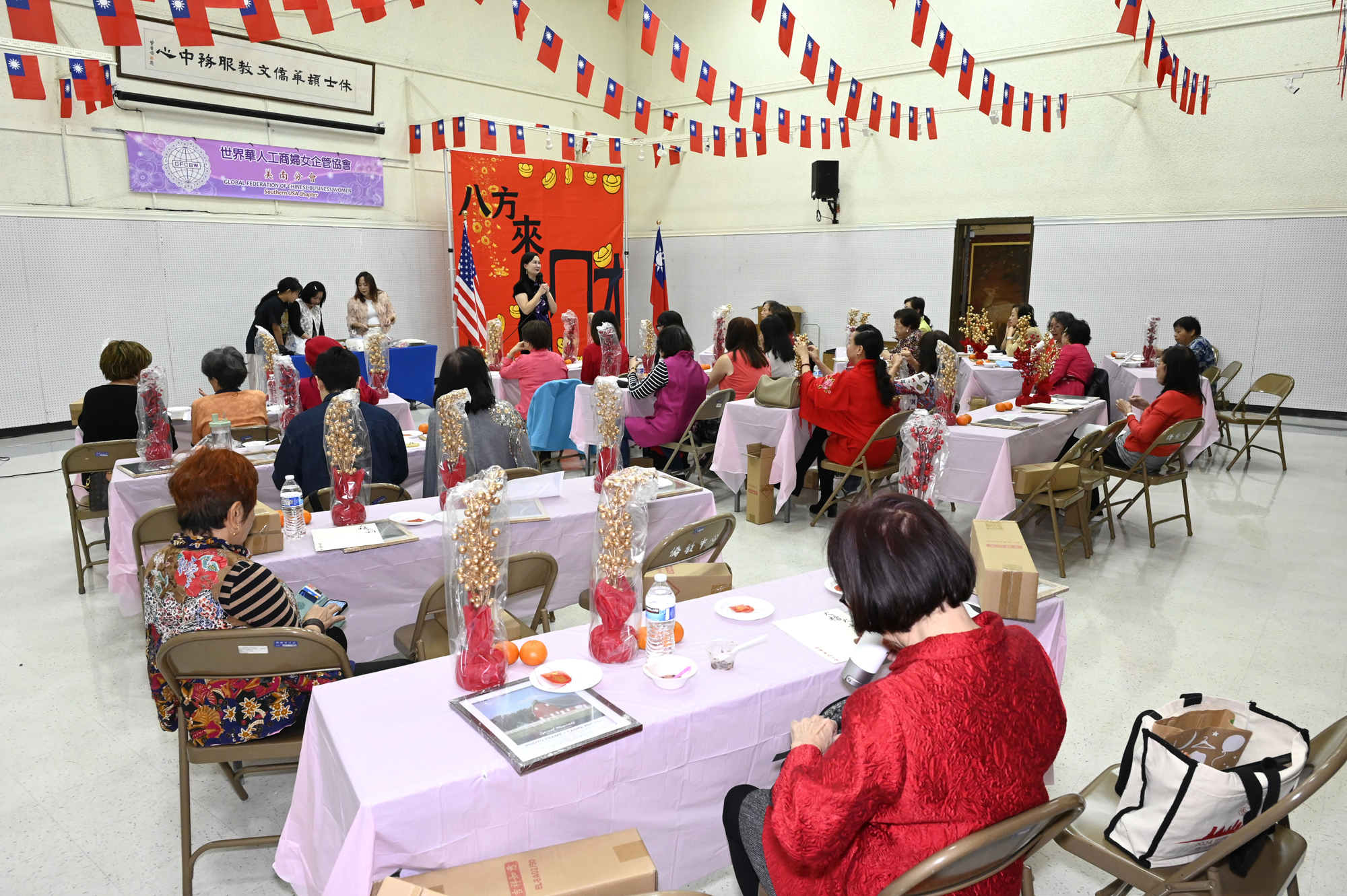在世華美南分會的這場新春活動中,處處都可感受到新年的熱鬧喜氣,從大幅紅色喜氣的八方來財看板,到參與活動會員的穿著身上,非紅即金,再加上橘子小金樹,徹底讓現場瀰漫濃濃的新年氣氛,大家專注在自己的作品,完成後留下一張紀念畫面,為2026留下一個美好回憶。