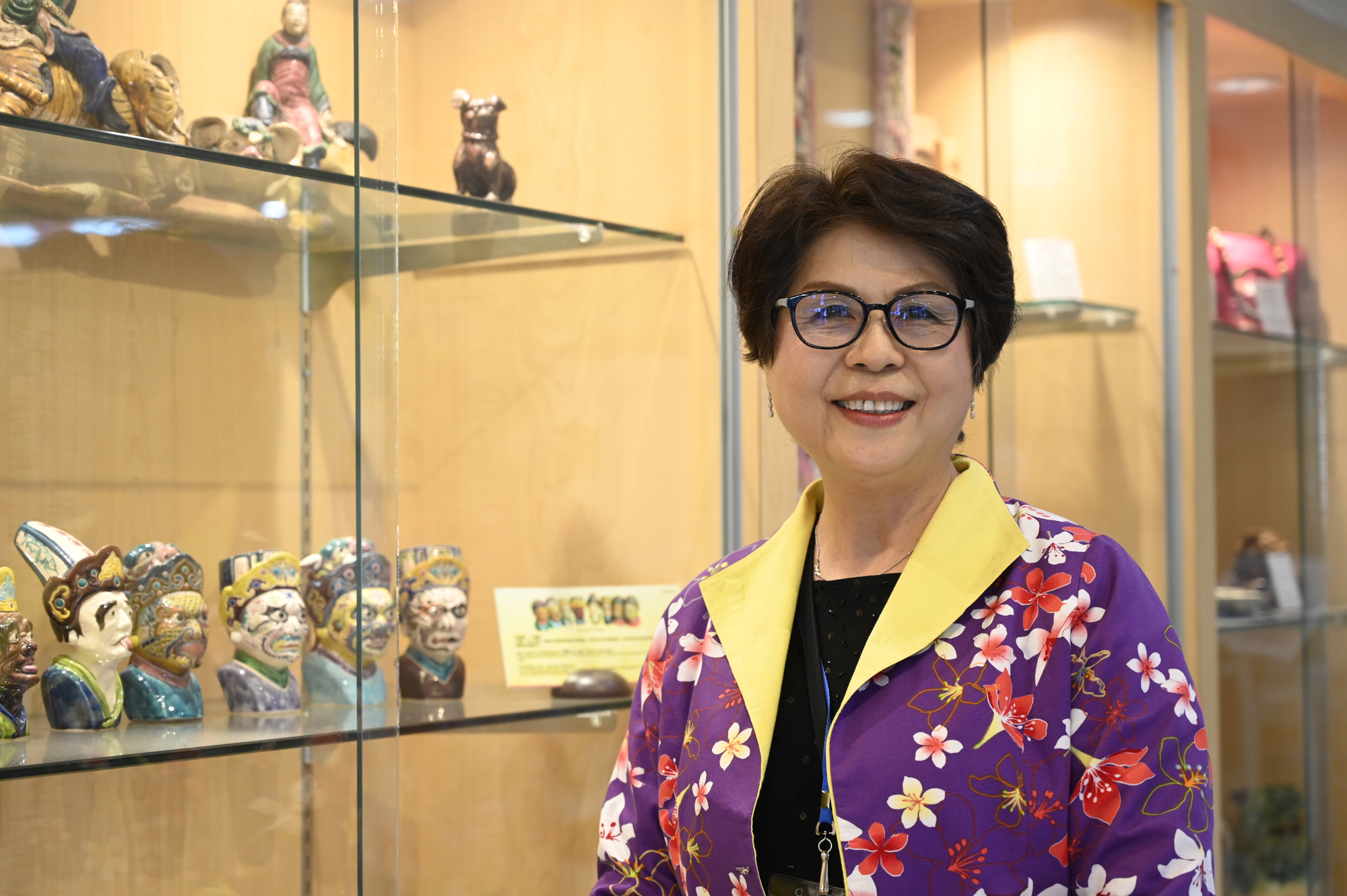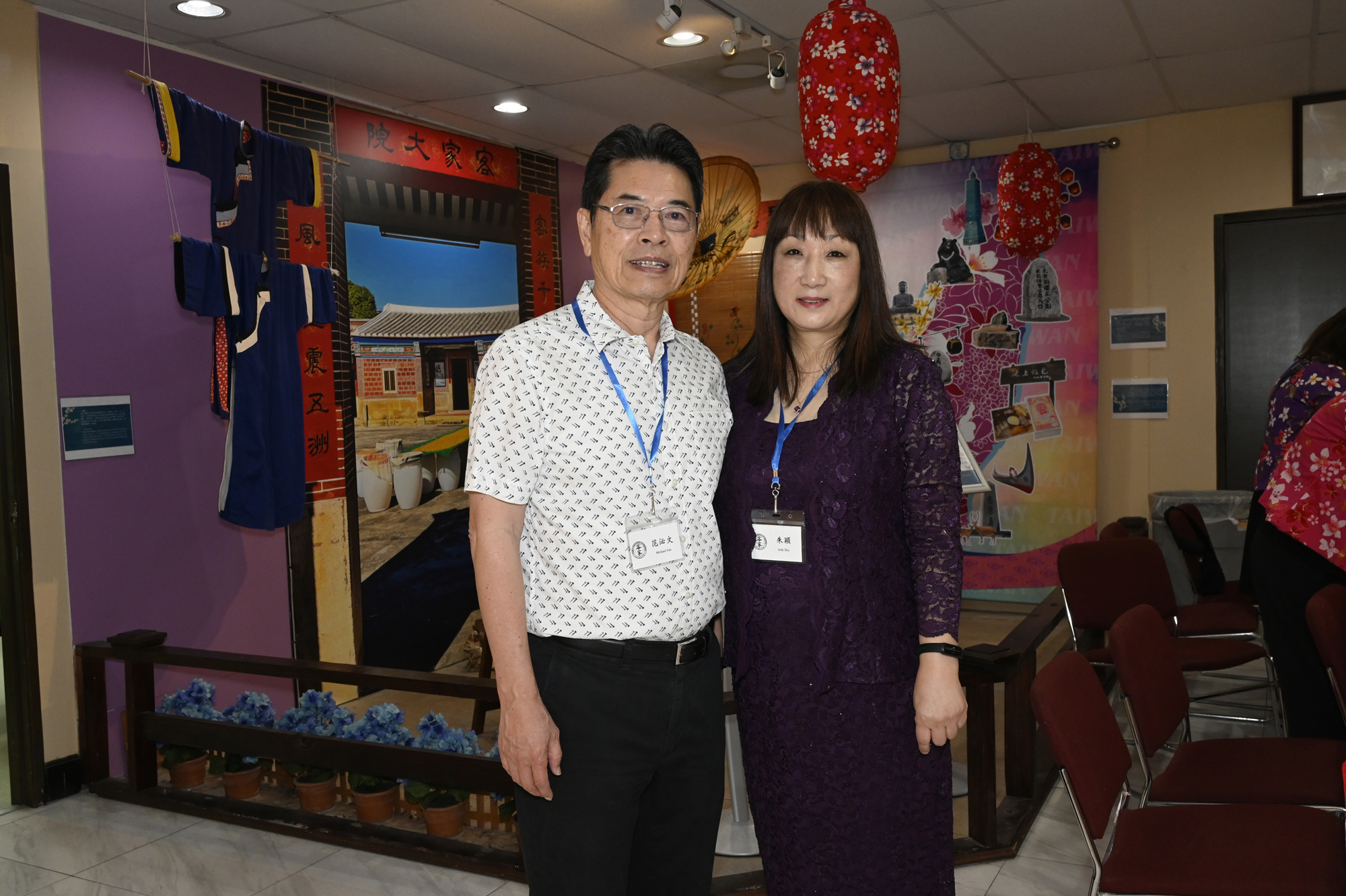 休士頓客家文教基金會黃瑪莉主任委員(左)接受藝術總監鄭榮興(右)贈壯致意。