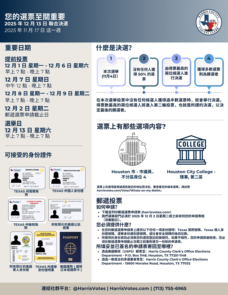 (HOUSTON, TX) – Harris 縣行政書記官辦公室提醒居民,聯合決選的提前投票將於12月1日星期一 開始,並於12月9日星期二 結束。只有在 Houston 市和 Houston City College 第二選區內的選民才有資格參與投票。