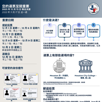 Harris 縣行政書記官辦公室提醒已登記選民2025 年 12 月 13 日聯合決選的選舉日。全縣有超過150 個投票中心,開放時間為早上7點至晚上 7 點...