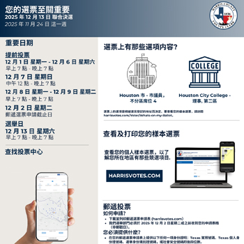 Harris 縣行政書記官辦公室提醒選民即將到來的 2025 年 11 月 4 日普選與特別選舉,以及CD-18極可能在 2026 年 1 月舉行決選...
