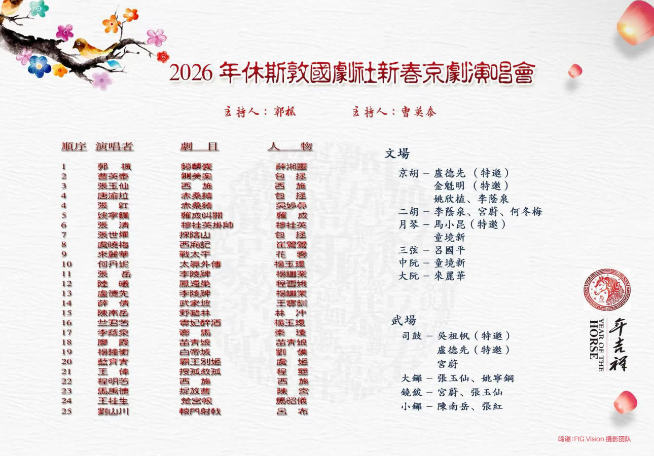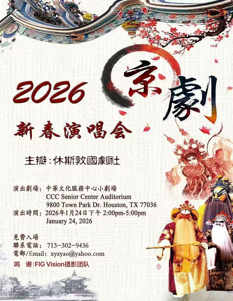 休斯敦國劇社將於2026年1月24日星期六下午2時在休斯敦中华文化服务(CCC)小礼堂舉办2026年新春京劇演唱會。今年的演唱會联合奥斯汀国剧社、新泽西国剧社以及北美其他剧社的戏友和老师加盟。行當齊全,流派紛呈,展示票友和戏迷们多年演练的深厚底蘊,中青年为主的团队閃亮登場,以青春的活力演繹古老的藝術形式。演唱會文武場面阵容强大,特邀新泽西国剧社琴师卢德先、金魁明老师,以及来自波士顿的鼓师吴祖帆老师助阵。屆時各位愛好京劇國粹的朋友和僑胞們將一飽耳福。