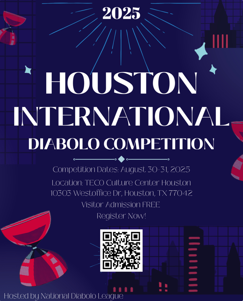 今年高中剛畢業的 Houston FASCA 扯鈴隊隊長王楚桓,與德州大學奧斯汀分校陳琬淇, 洪鵬安(UT Austin)大學生共同成立 National Diabolo League(NDL) 非營利組織,並將於 8 月 30 日與 31 日 在休士頓主辦一場全美規模的扯鈴比賽。 誠摯邀請各位參加觀賞這場難得在休士頓舉辦的精彩扯鈴賽事,一同感受這項結合民俗體育藝術與創新技巧的扯鈴表演!