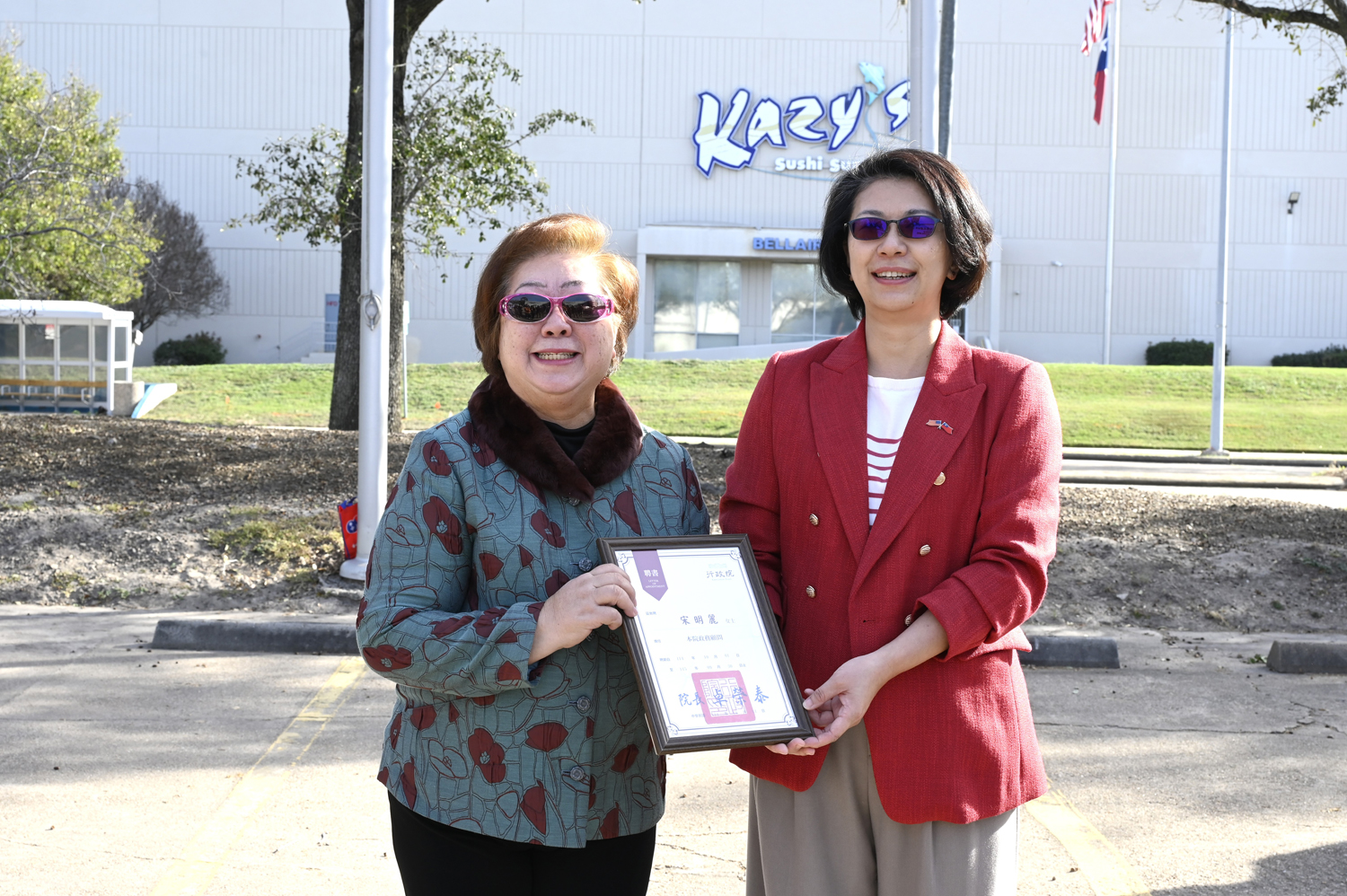 蕭處長並代表中華民國政府,頒發行政院政務顧問聘書給宋明麗僑務諮詢委員、客家委員會榮譽顧問聘書共9人,肯定受聘人員長期投入僑務及公共事務之貢獻;同時,亦表揚休士頓雙十國慶籌備委員會及各主辦社團在114年雙十國慶活動期間辛勤付出與貢獻;最後並頒發感謝狀給王敦正僑務諮詢委員捐贈僑生獎助學金獎狀。